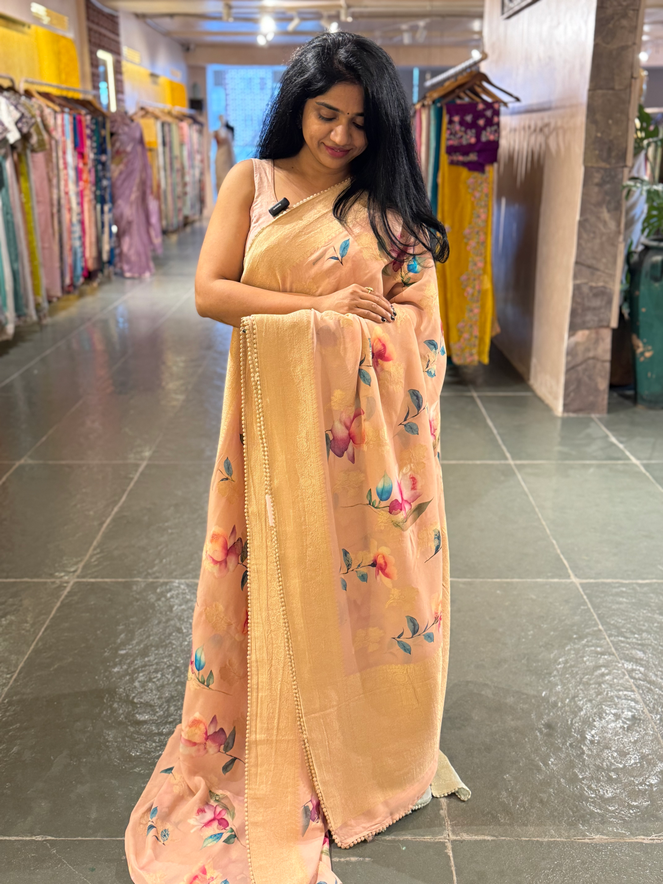 • Peach Banarasi Khaddi Gorgette Sarees with Floral Print