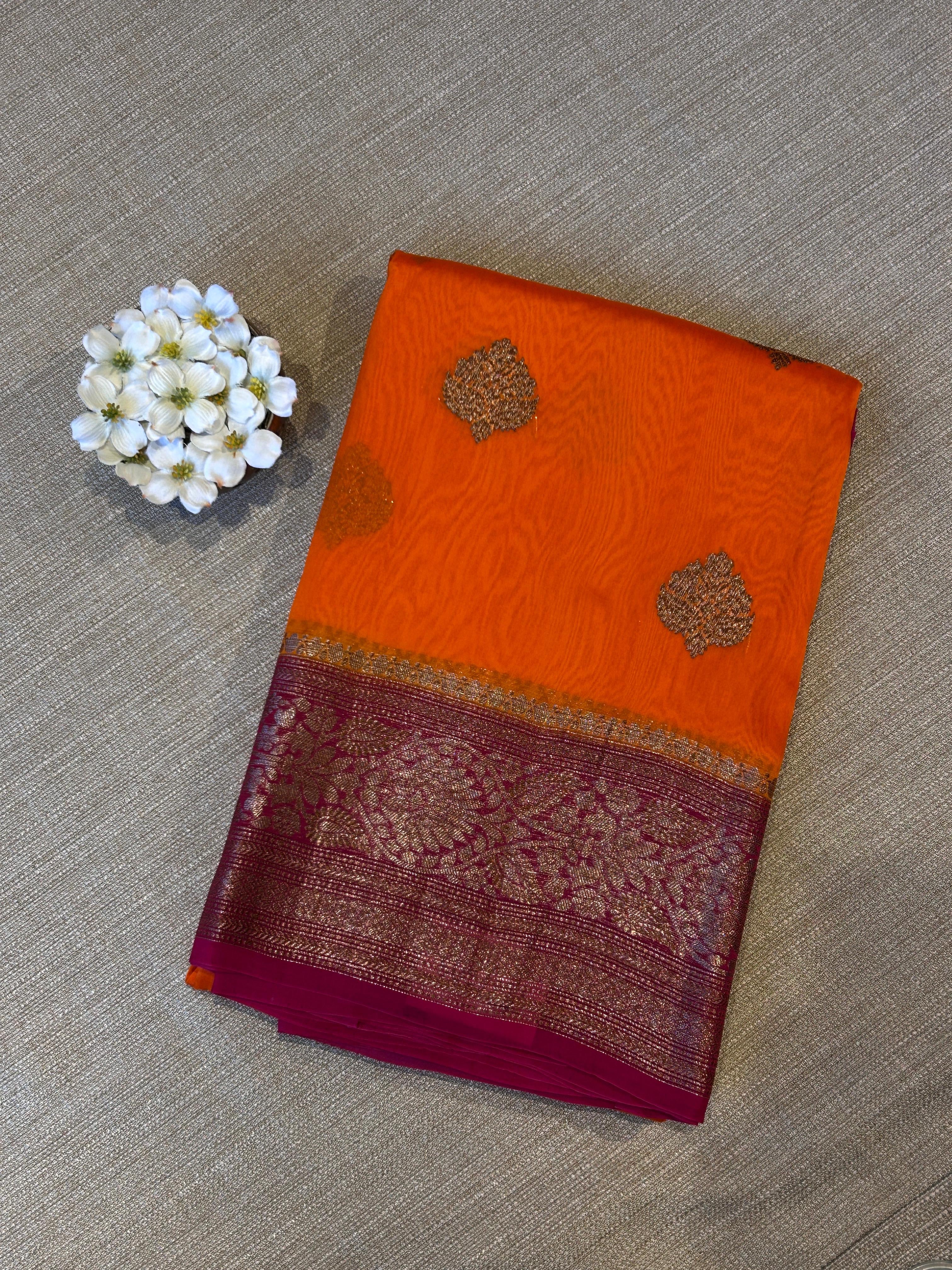 • Orange and pink Combo Pure Handloom premium Kora Banarasi Saree