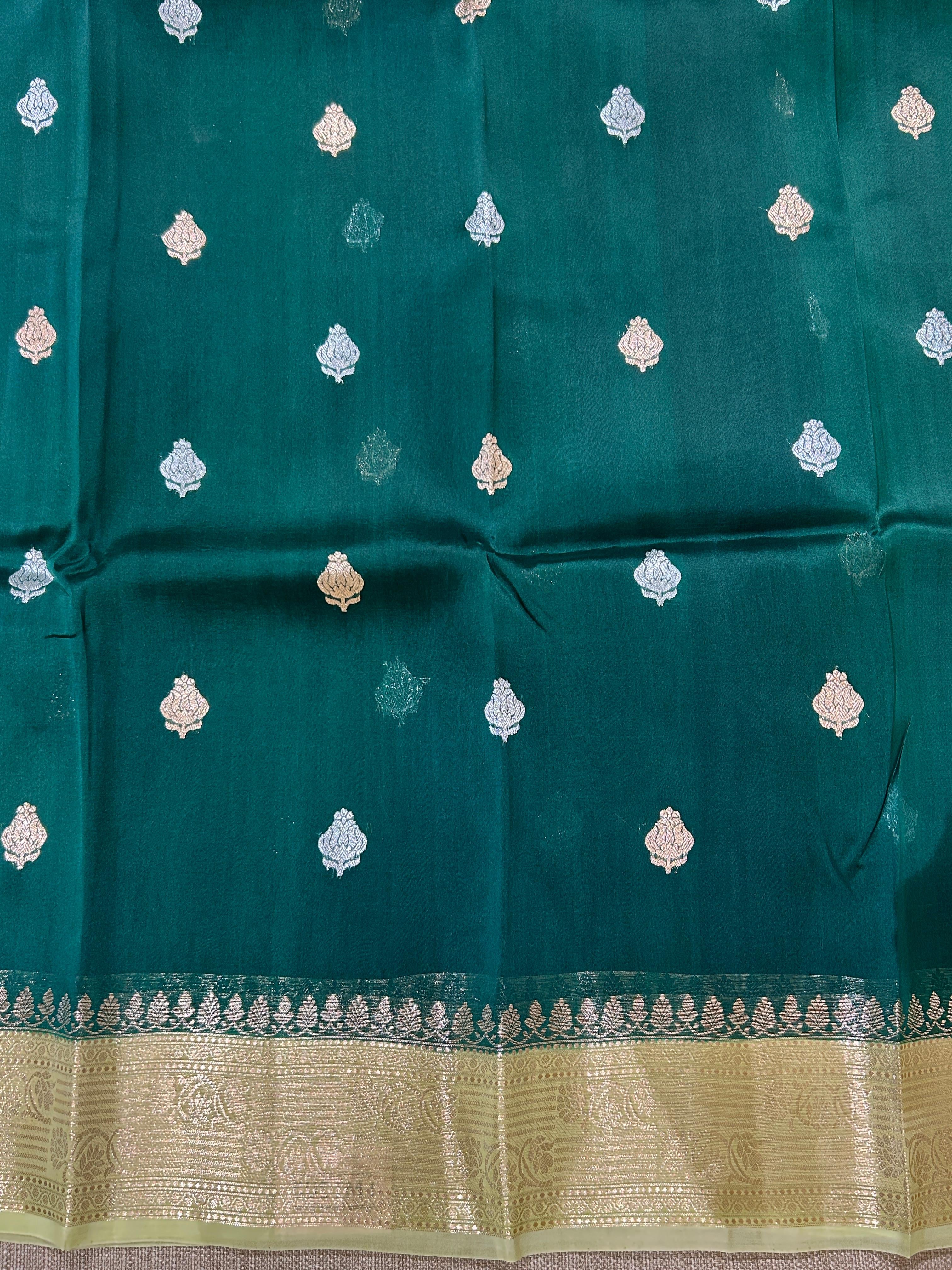 • Bottle Green & apple green Combo Pure Handloom premium Kora Banarasi Saree