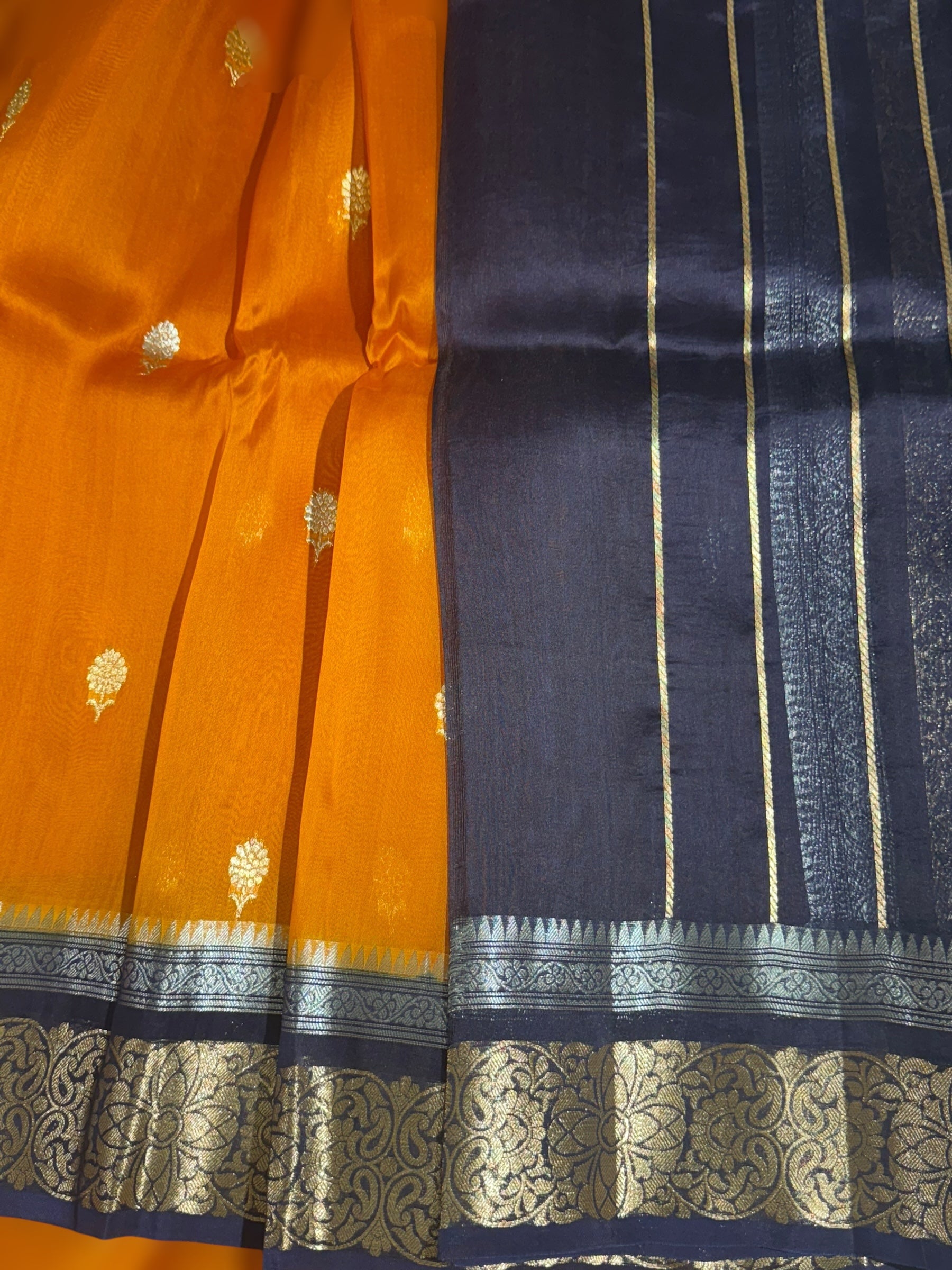 Pure Handloom Kora Banarasi Saree With double borders Sona Rupa kaduwa Woven flower Motifs . Blouse is in midnight Blue color with stripes pattern
