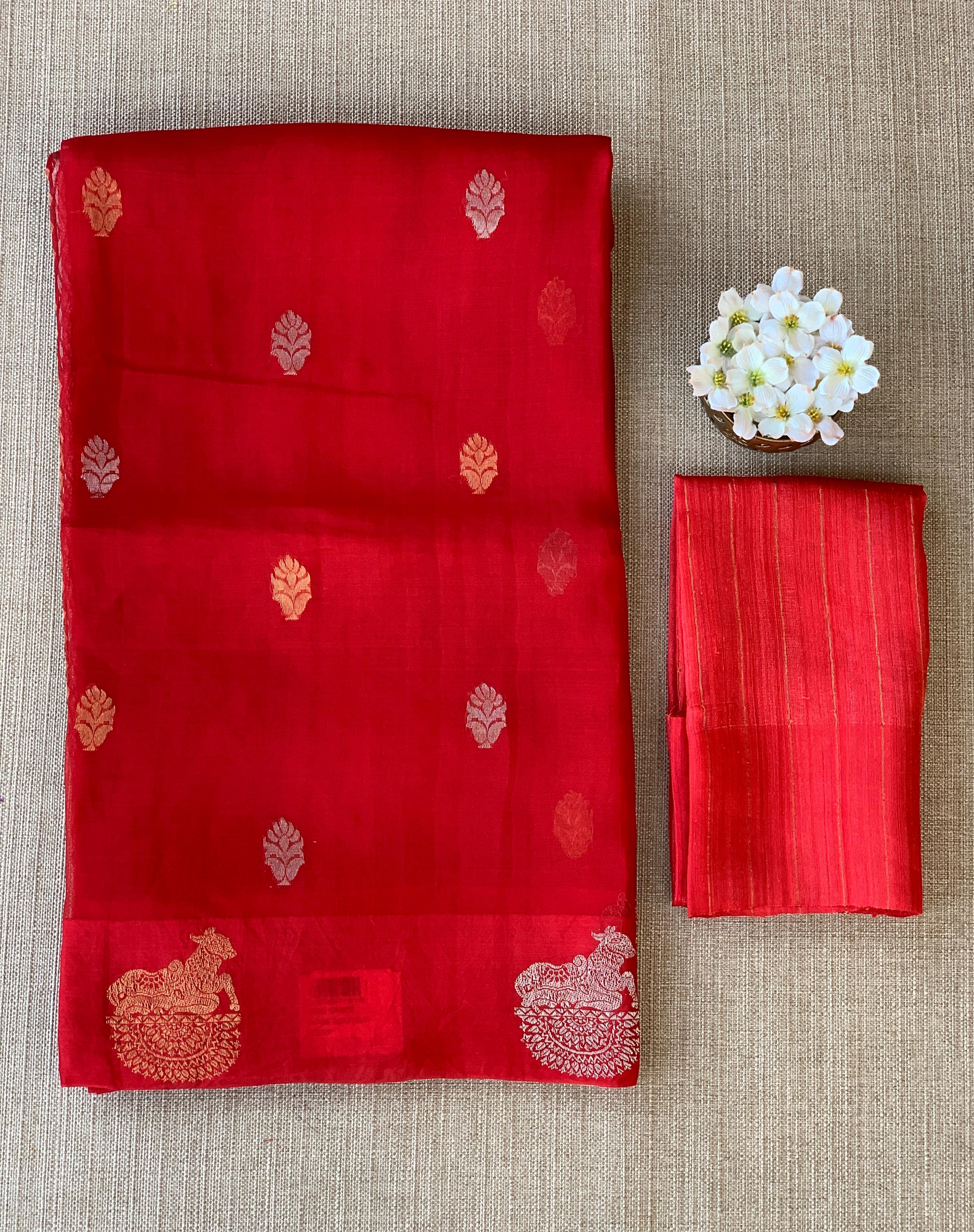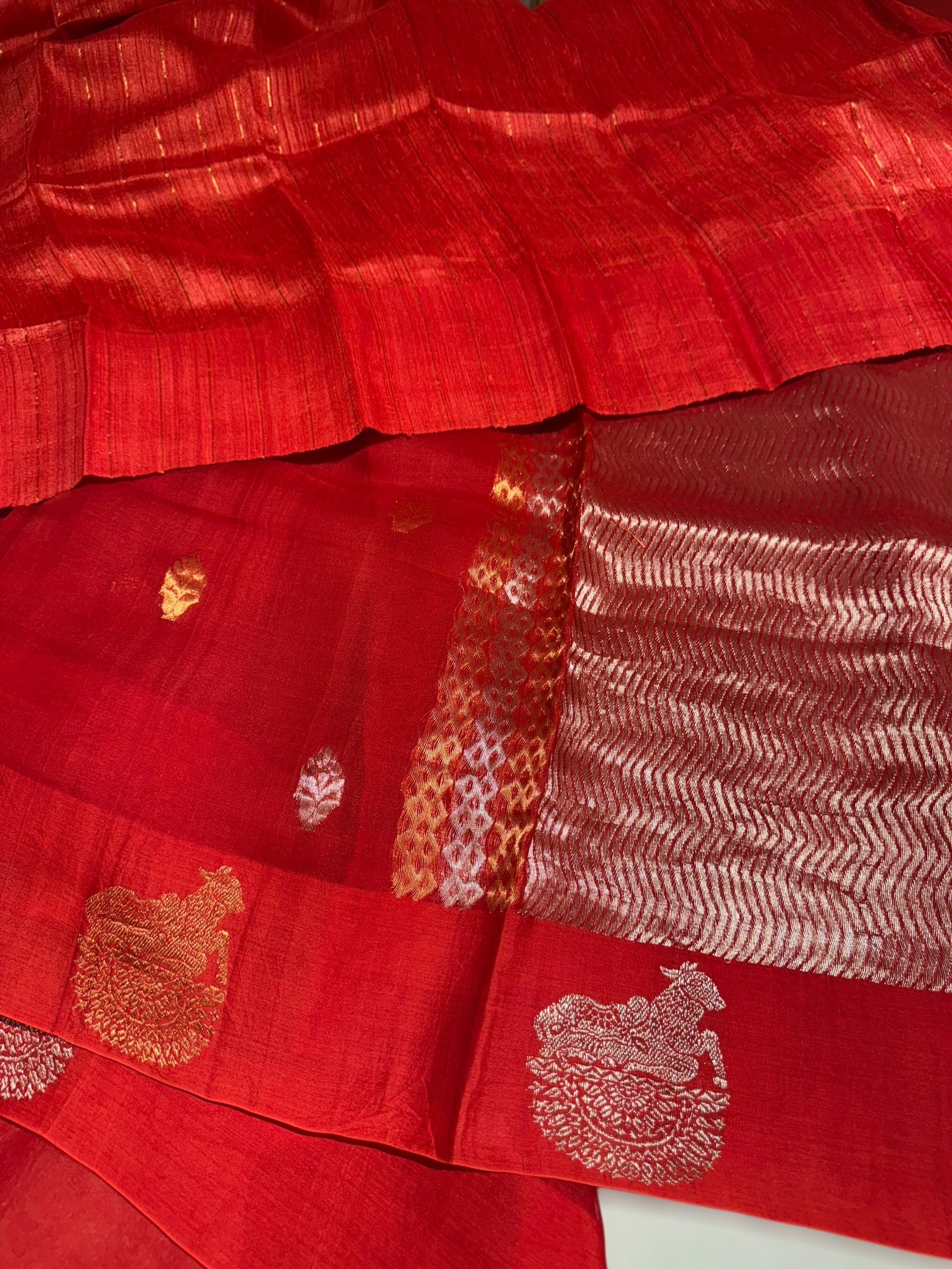A masterpiece that exudes grace and grandeur — this stunning red Kora Muslin saree features exquisite kaduwa woven sona rupa Nandi motifs on the open borders and delicate allover sona rupa floral motifs that shimmer with timeless charm.