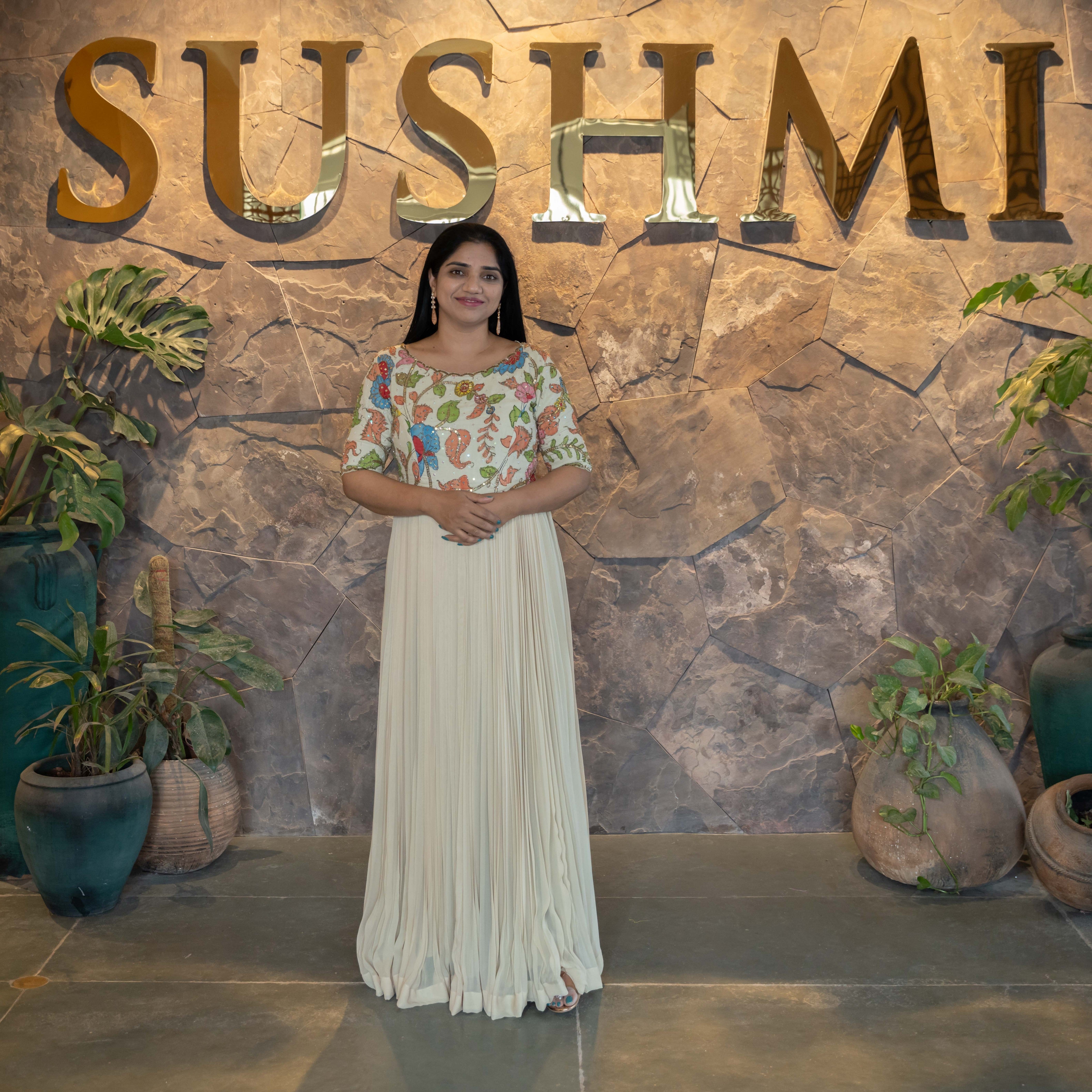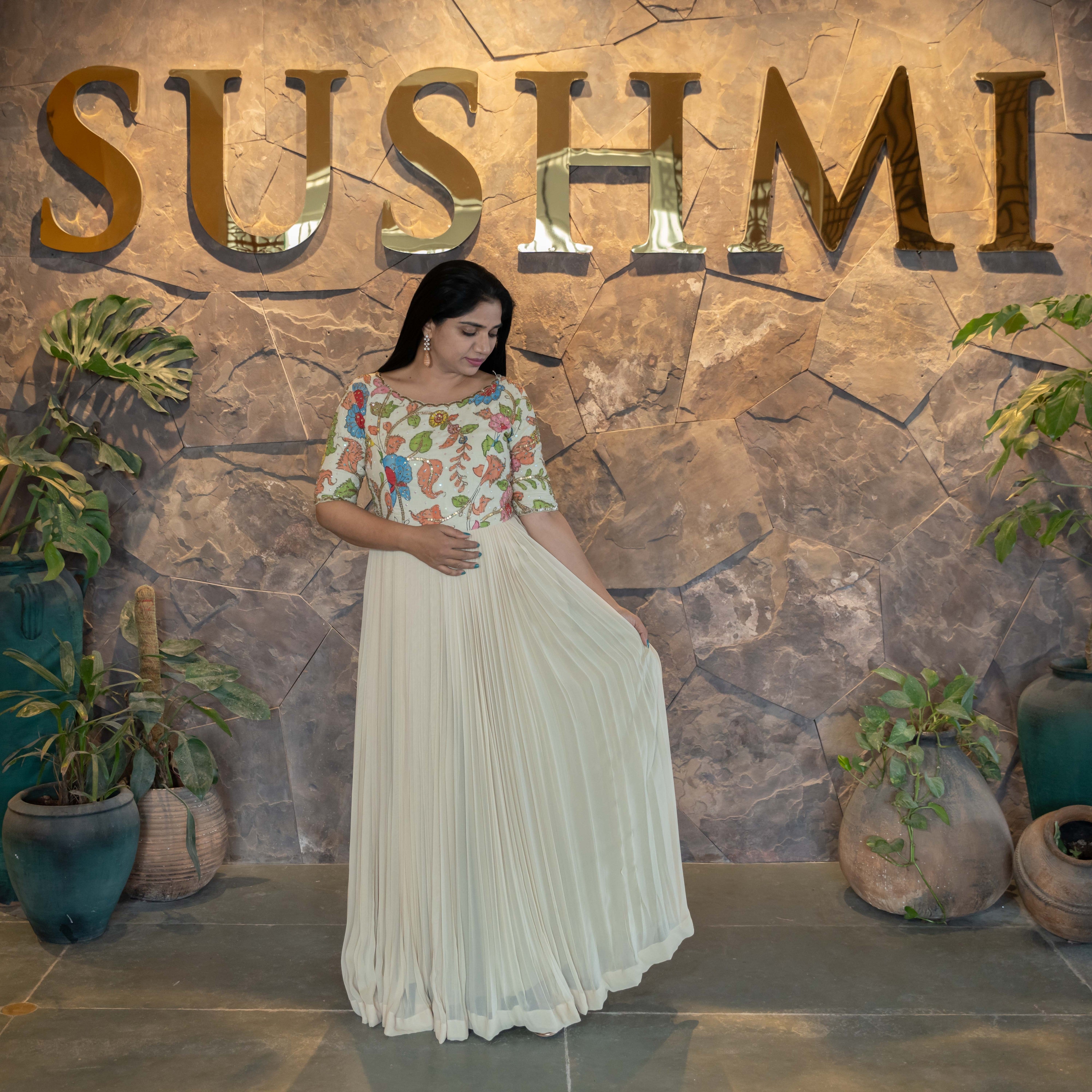 • Gorgette long frock with Pen kalamkari handwork yoke