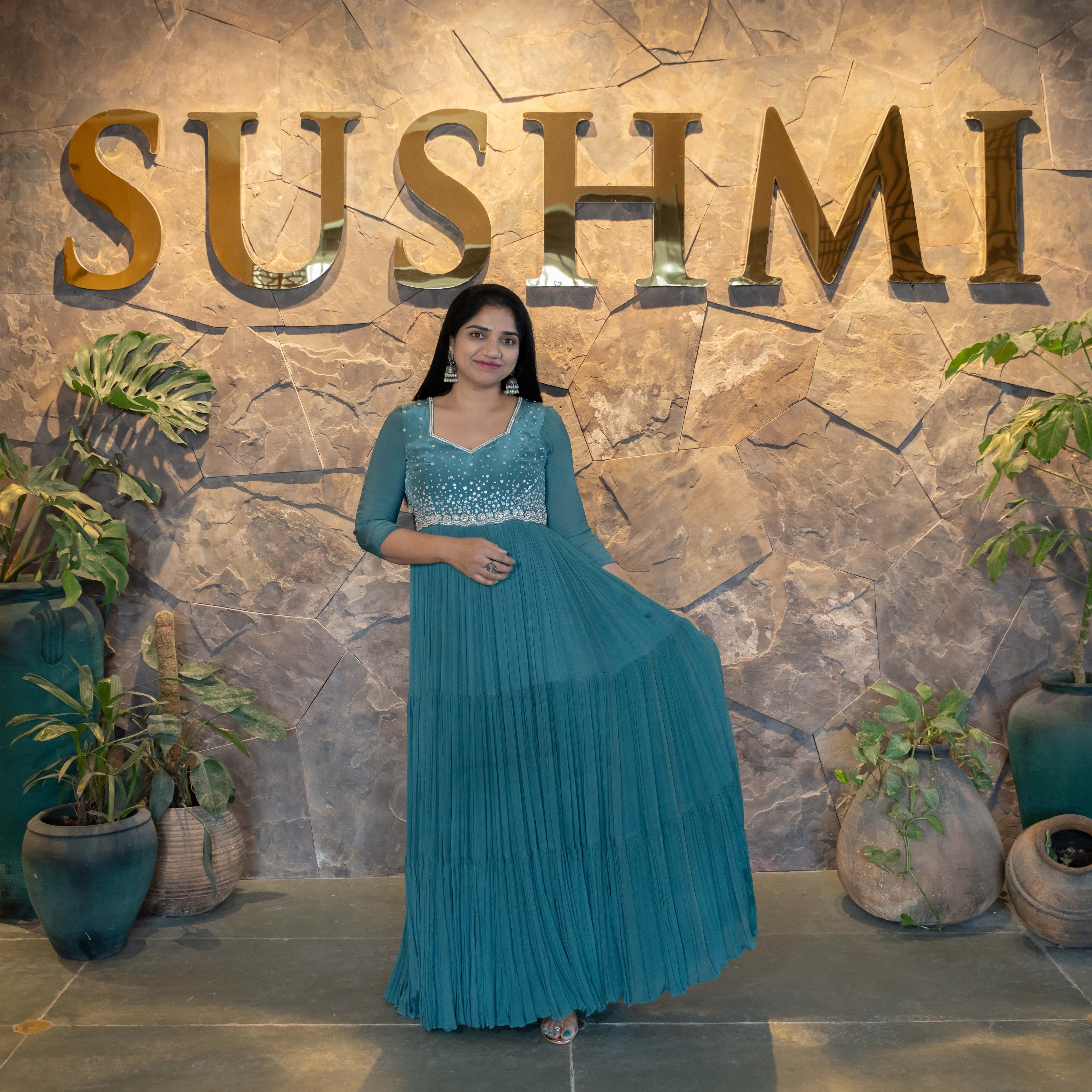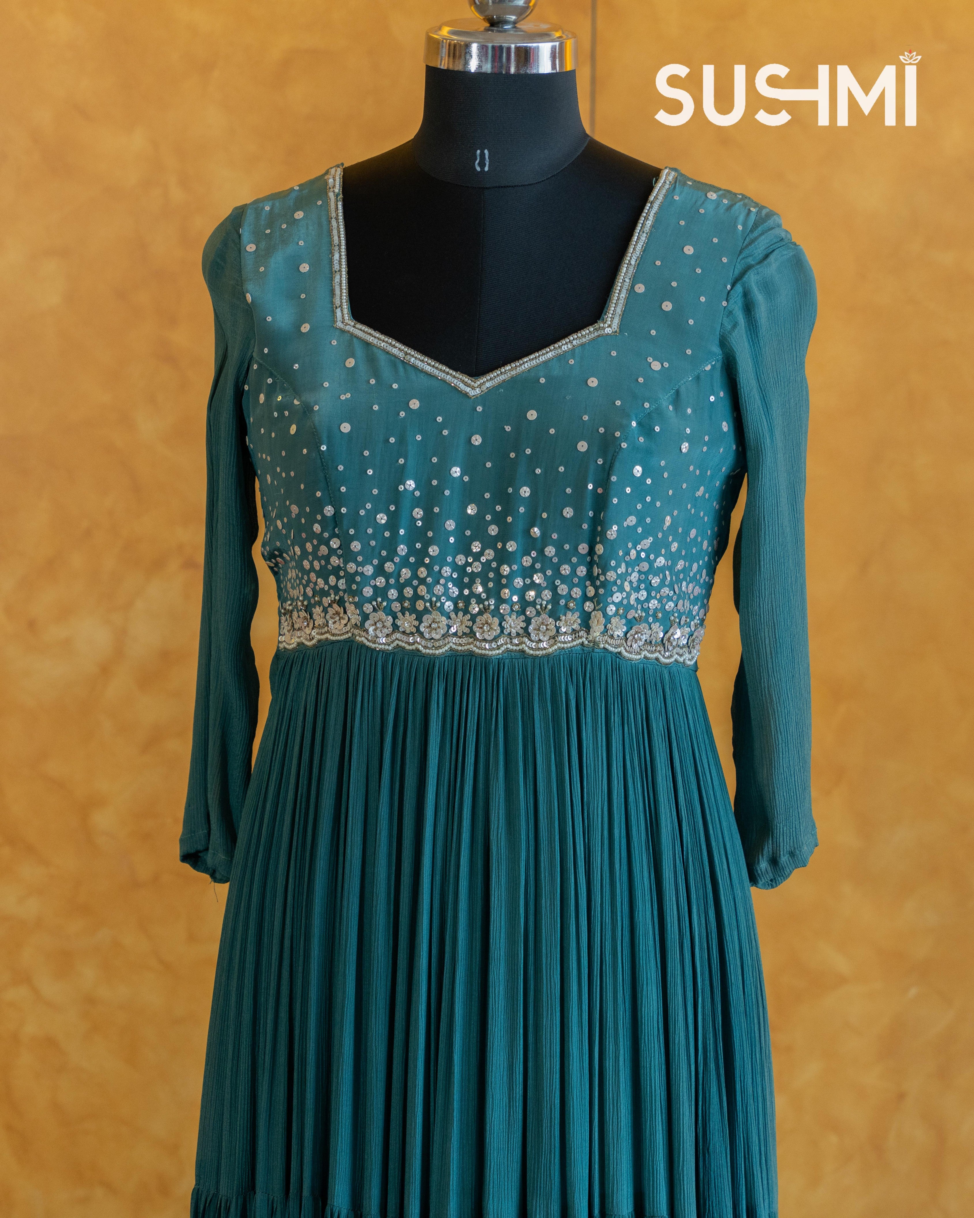Pure chinnon long frock with handwork yoke .