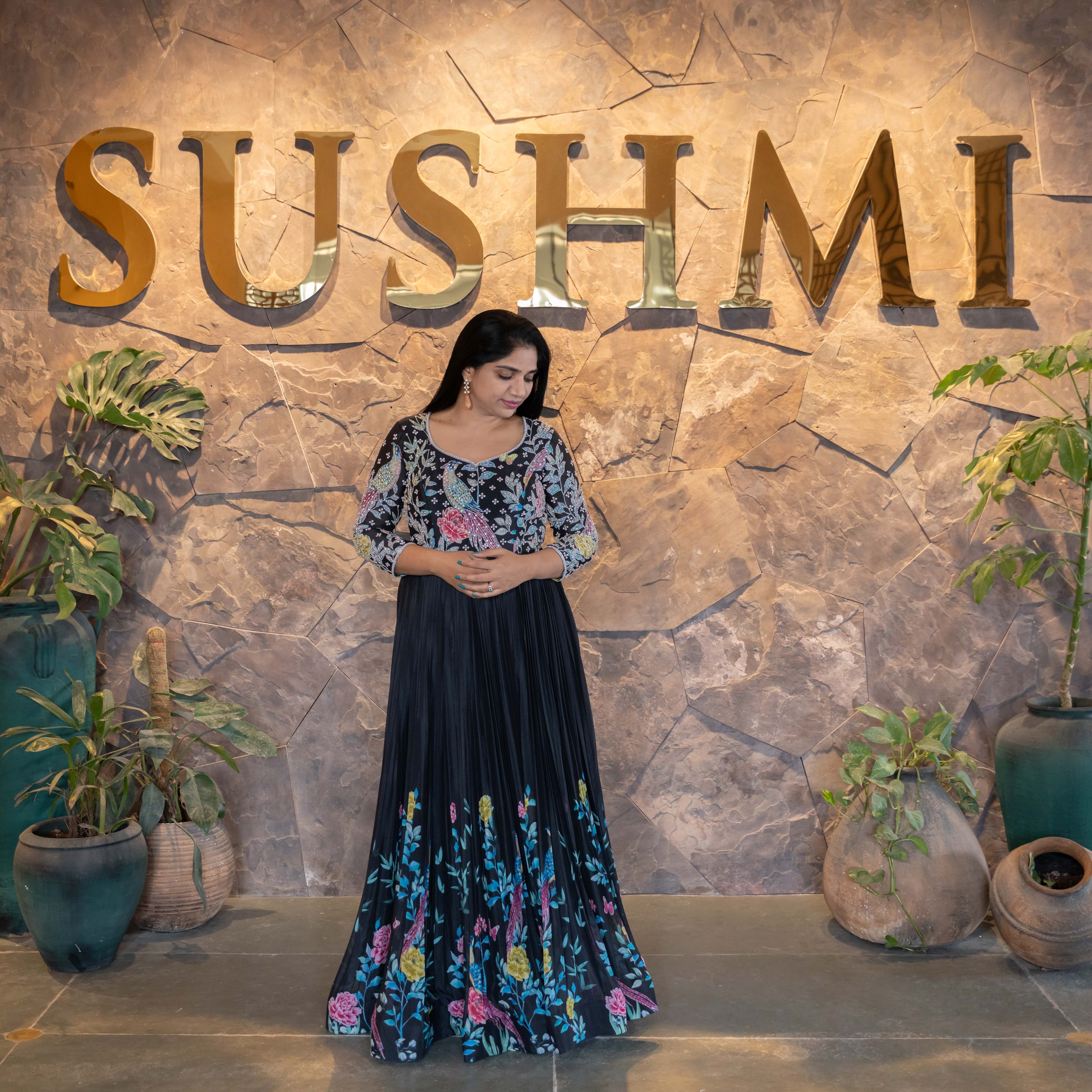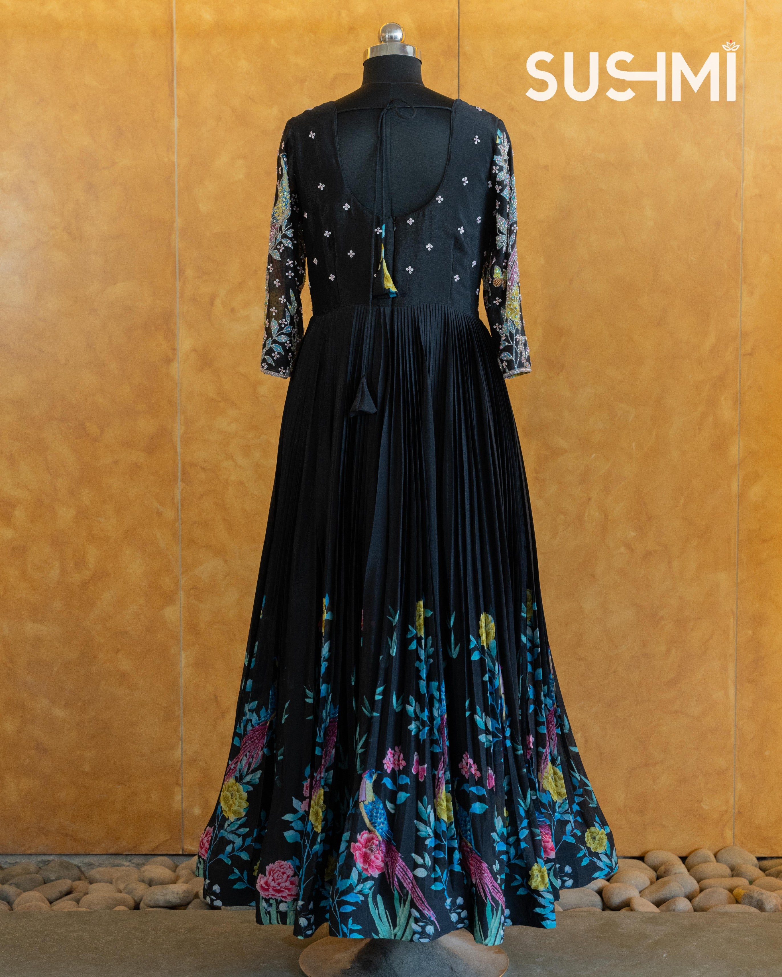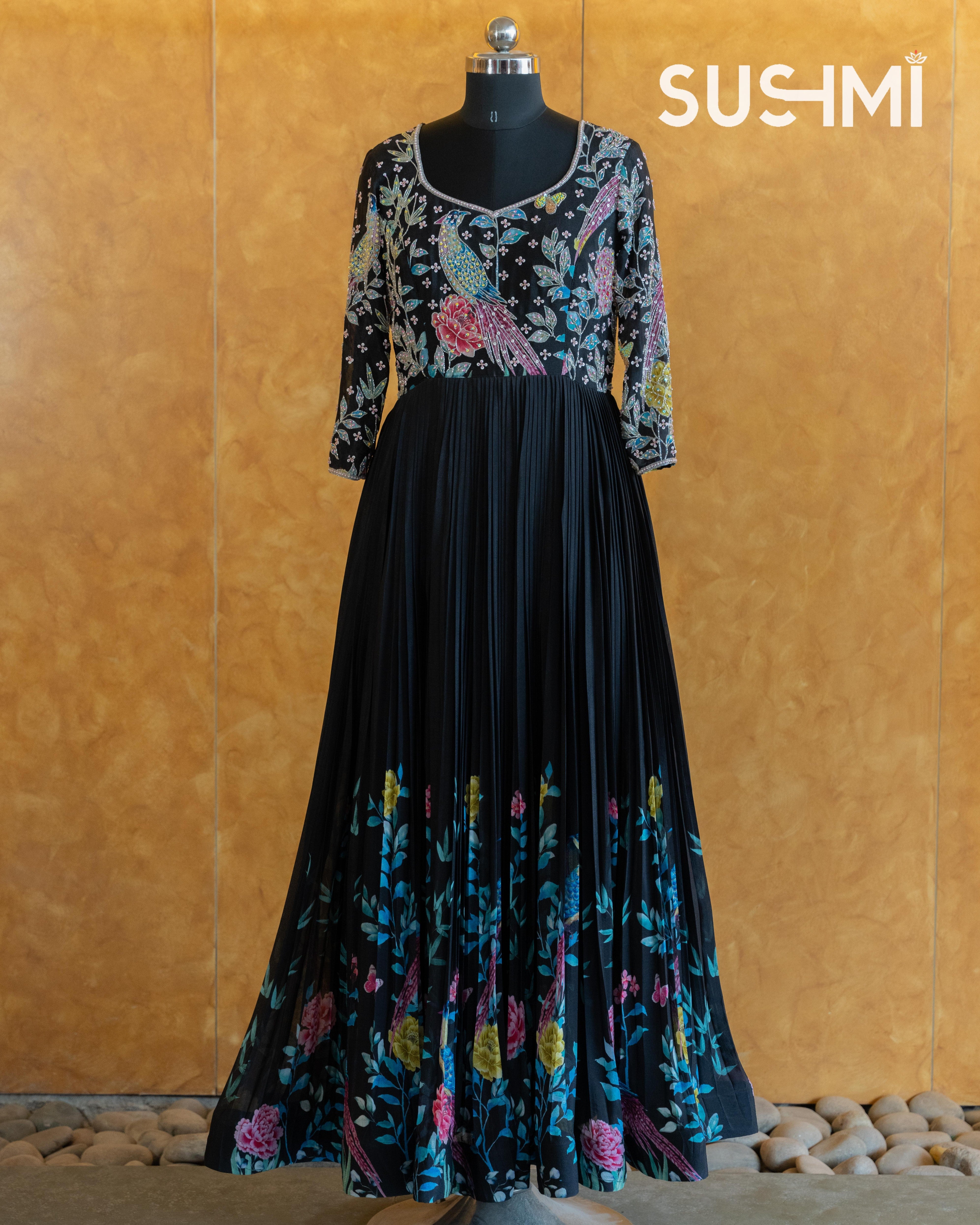 Black color Pure Chinnon printed long frock with beautiful floral and parrot design in skirt border style with heavy handwork highlighted yoke . It has got heavy ghera around 8-10 meters .