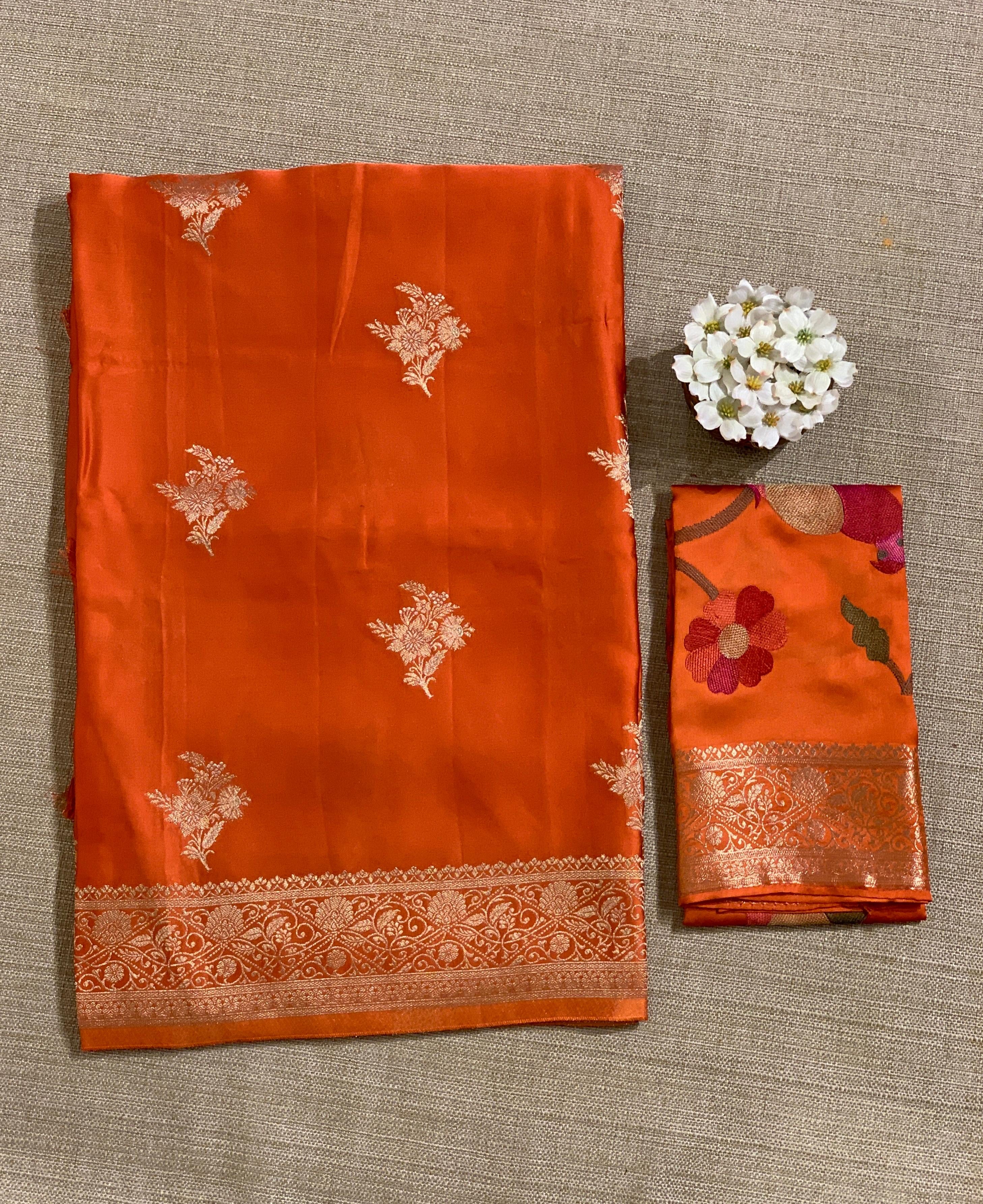 • Orange Mashru Silk Saree with Paithani inspired embroidered blouse