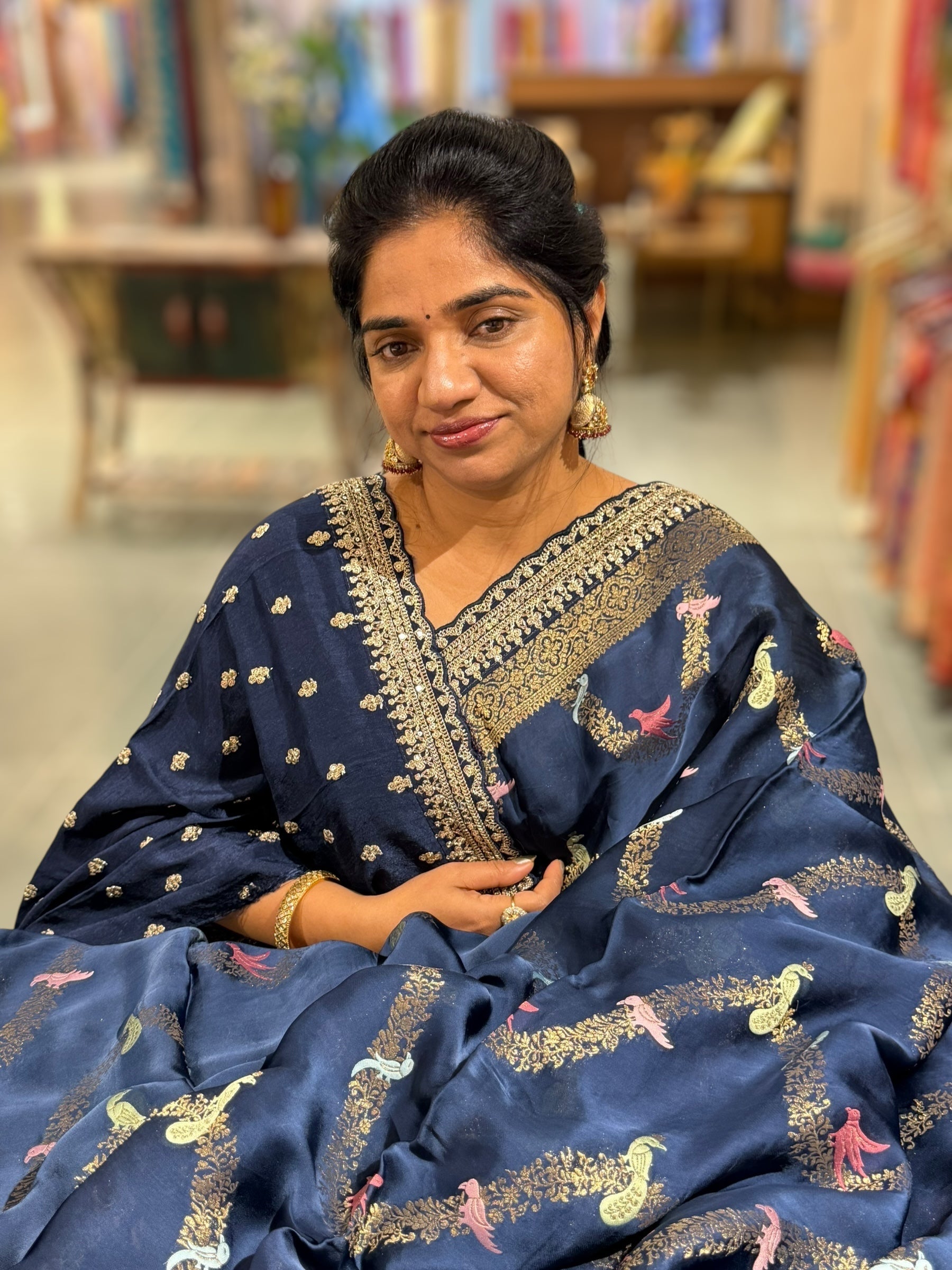 Mashru banarasi Silk Saree with allover zig zag pattern creeper weaving with meenakari peacocks and parrots hemlined with sabhyasachi style borders .