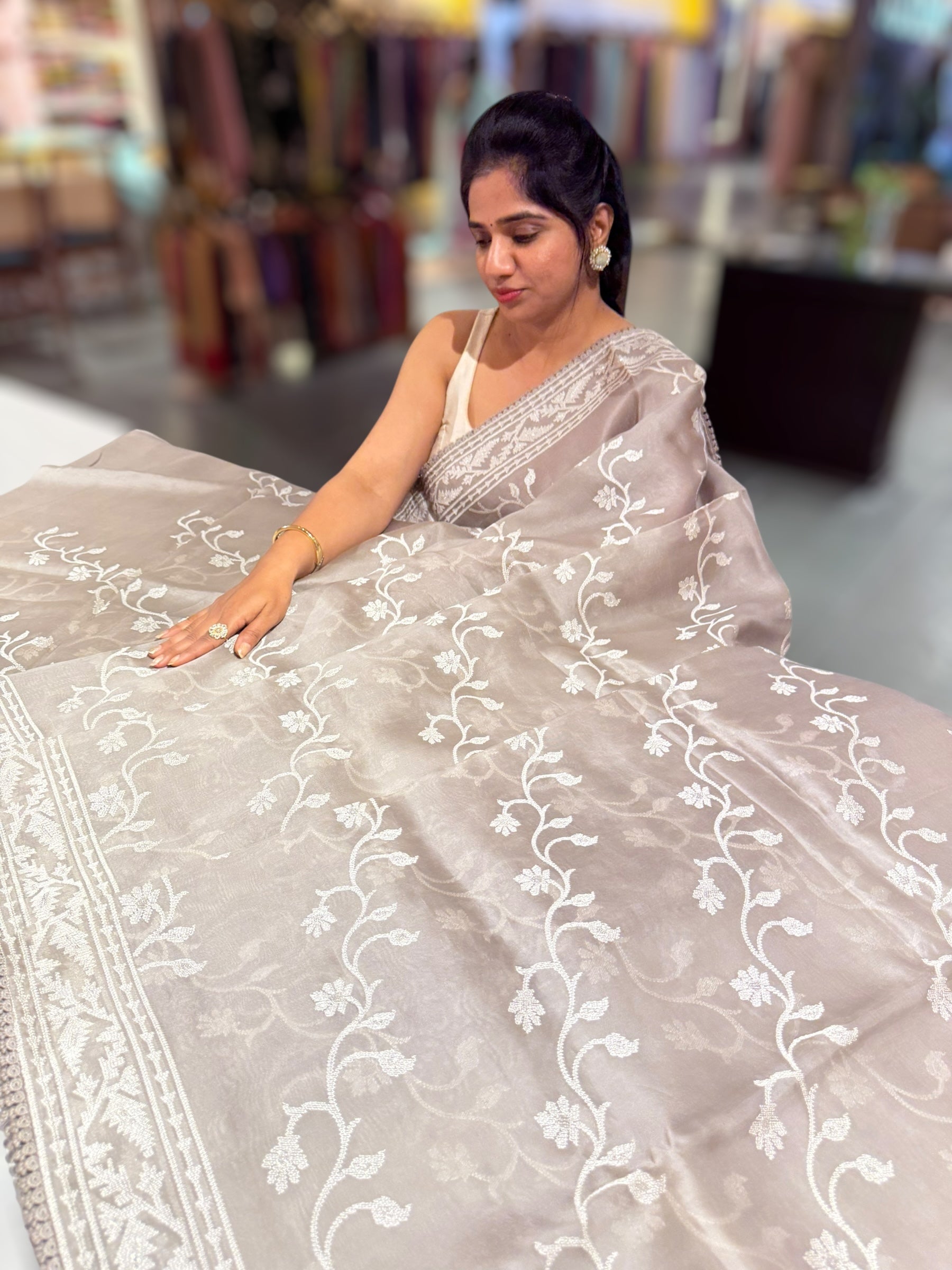 Paired with a pure organza blouse adorned with exquisite allover petite-point embroidery in multicolors, showcasing flower creepers and butterflies for a beautifully artistic and feminine look.