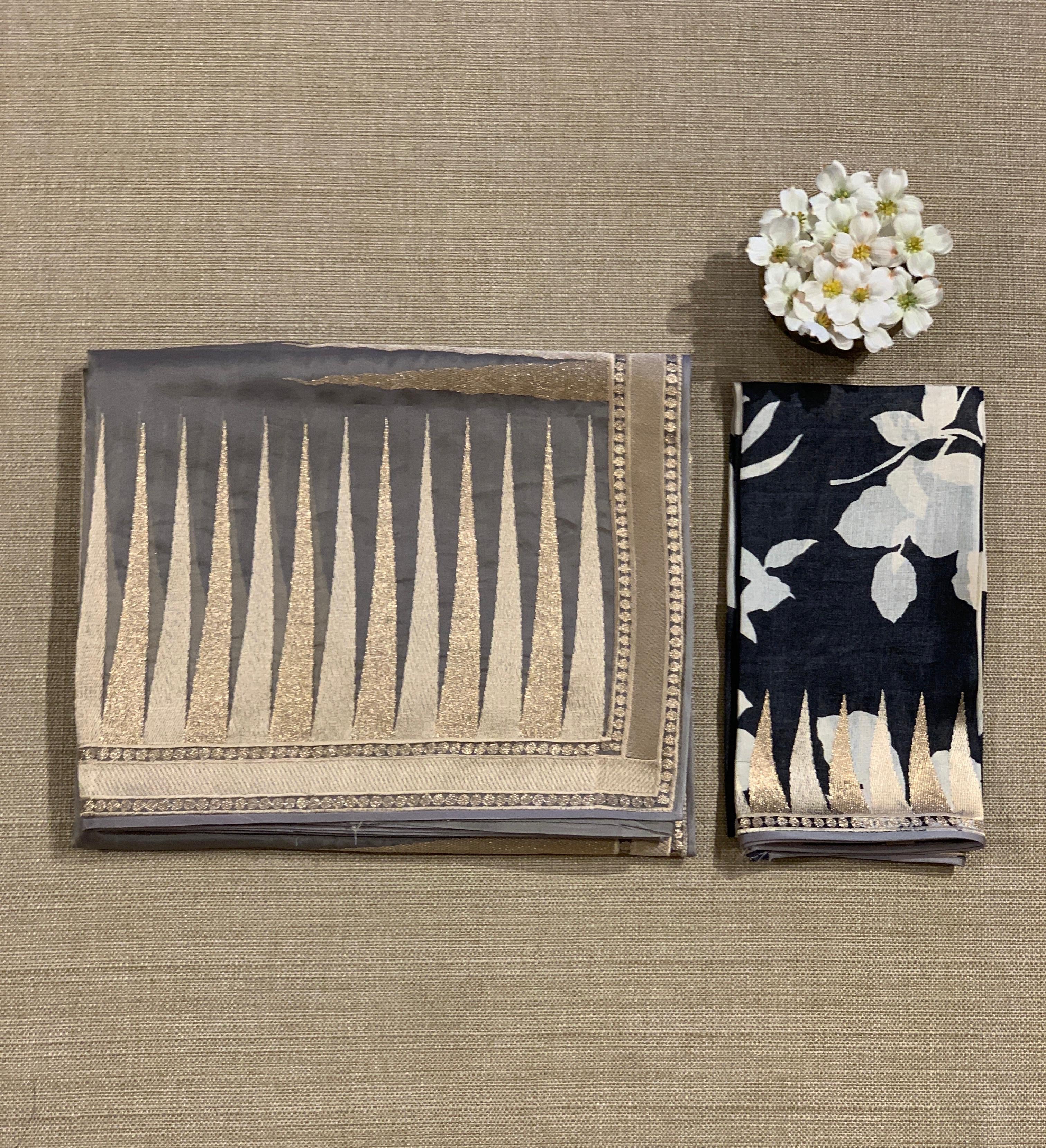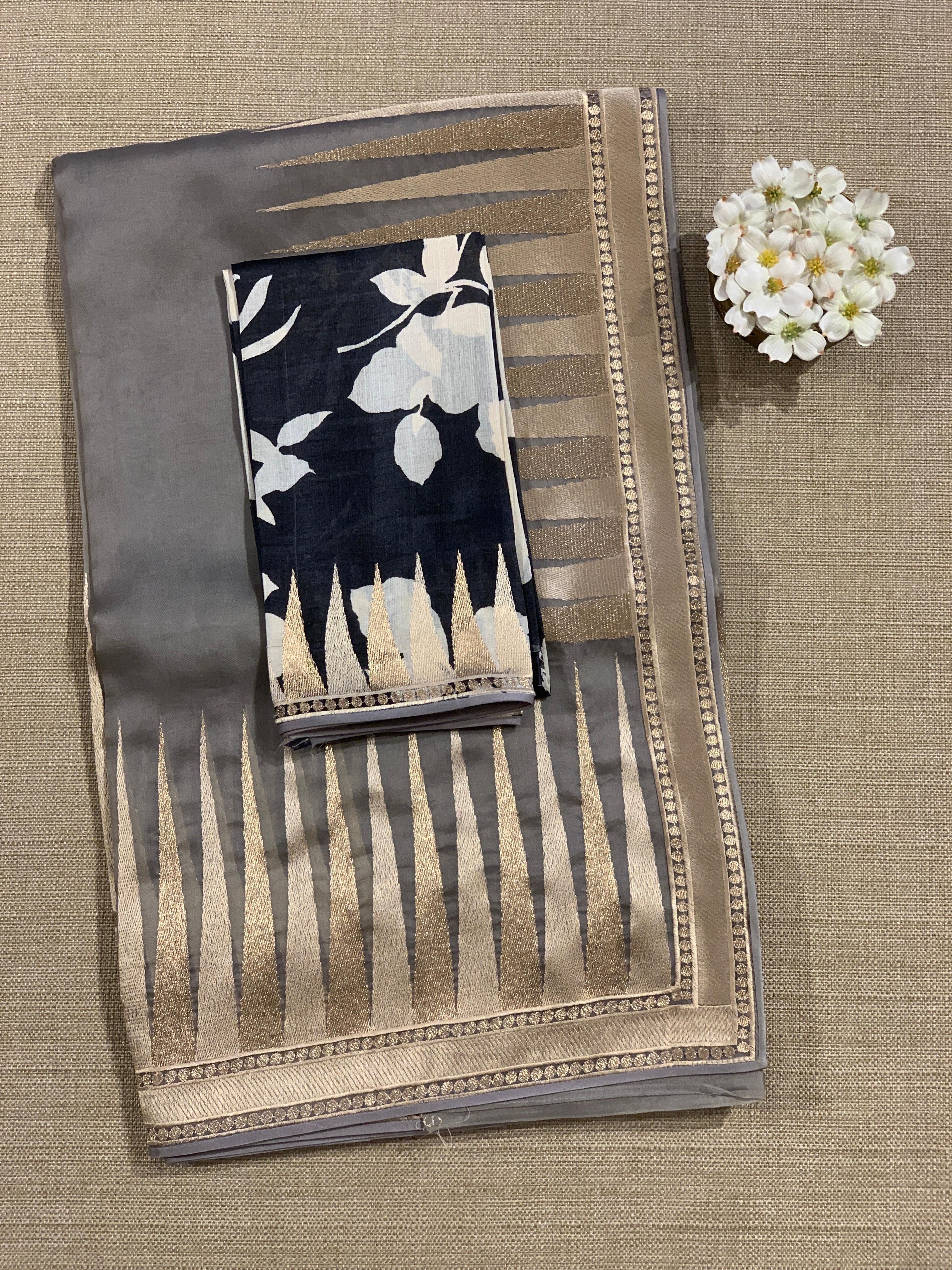 Exquisite pure organza saree adorned with a Kanjeevaram-inspired temple embroidered border. Paired with a pure tussar floral printed blouse, beautifully detailed with matching temple embroidery on the border — a perfect blend of elegance and tradition.
