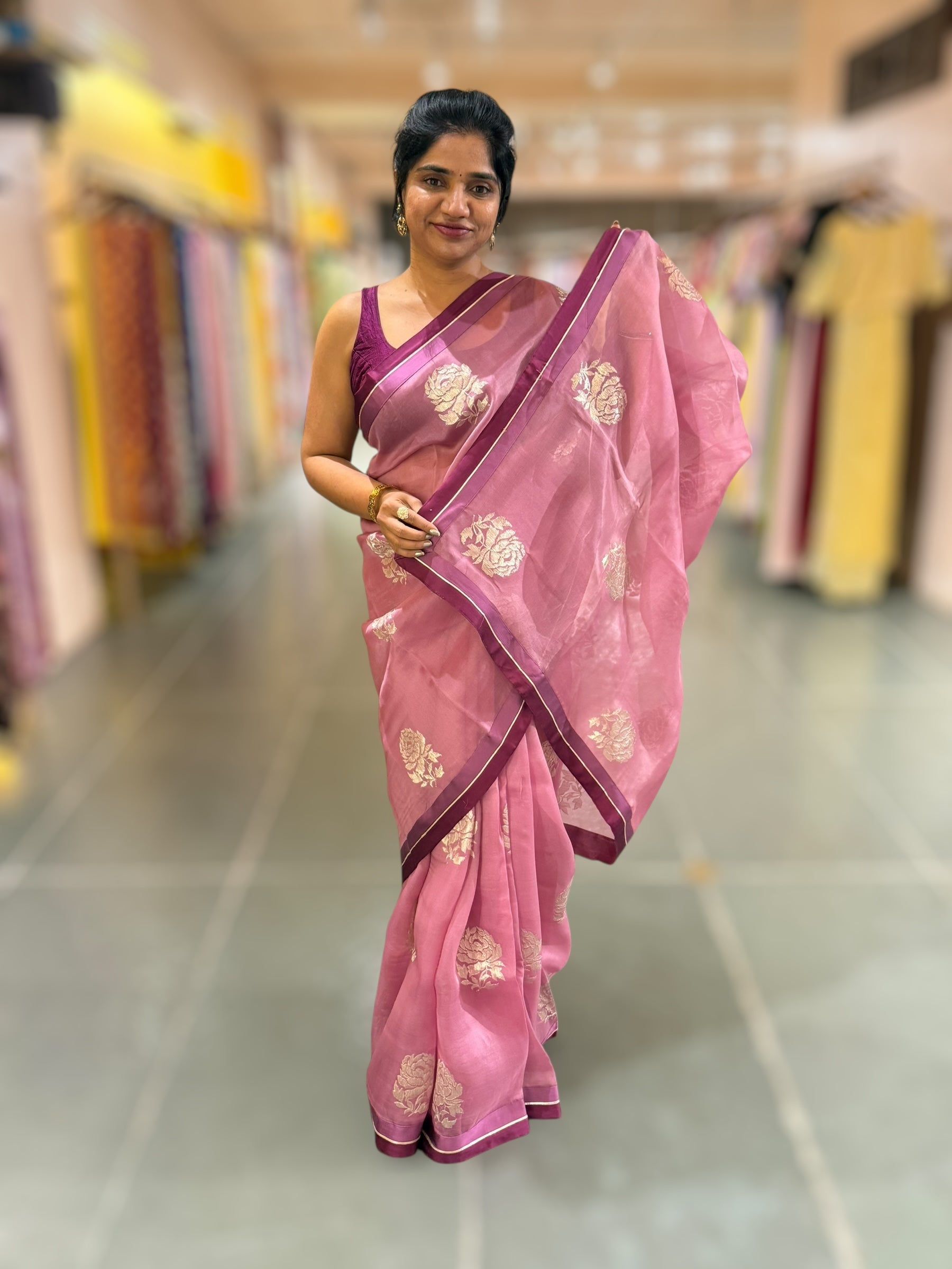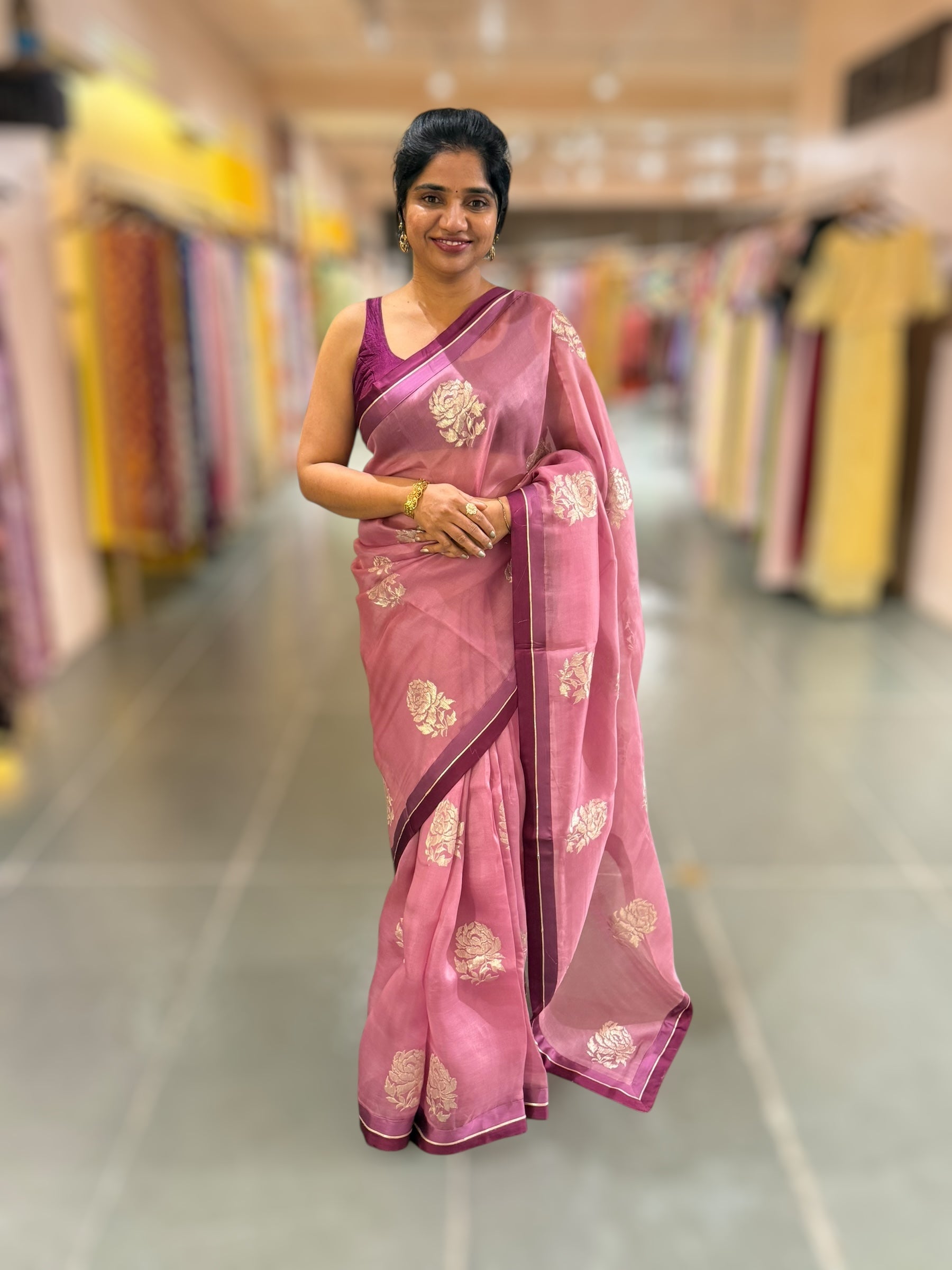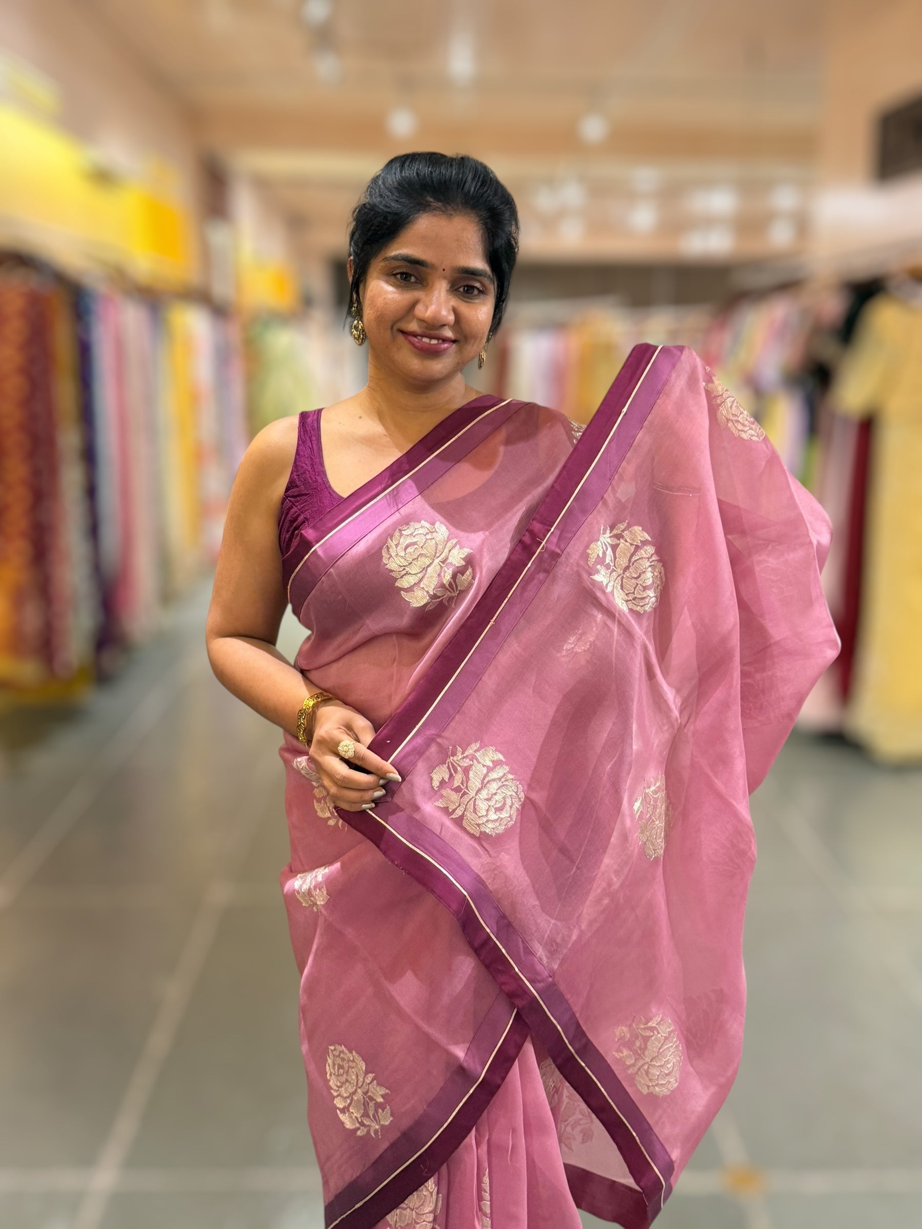 Pure Organza Saree featuring allover water-gold zari rose flower embroidery, beautifully hemlined with double-tone Mashru satin and gota borders.