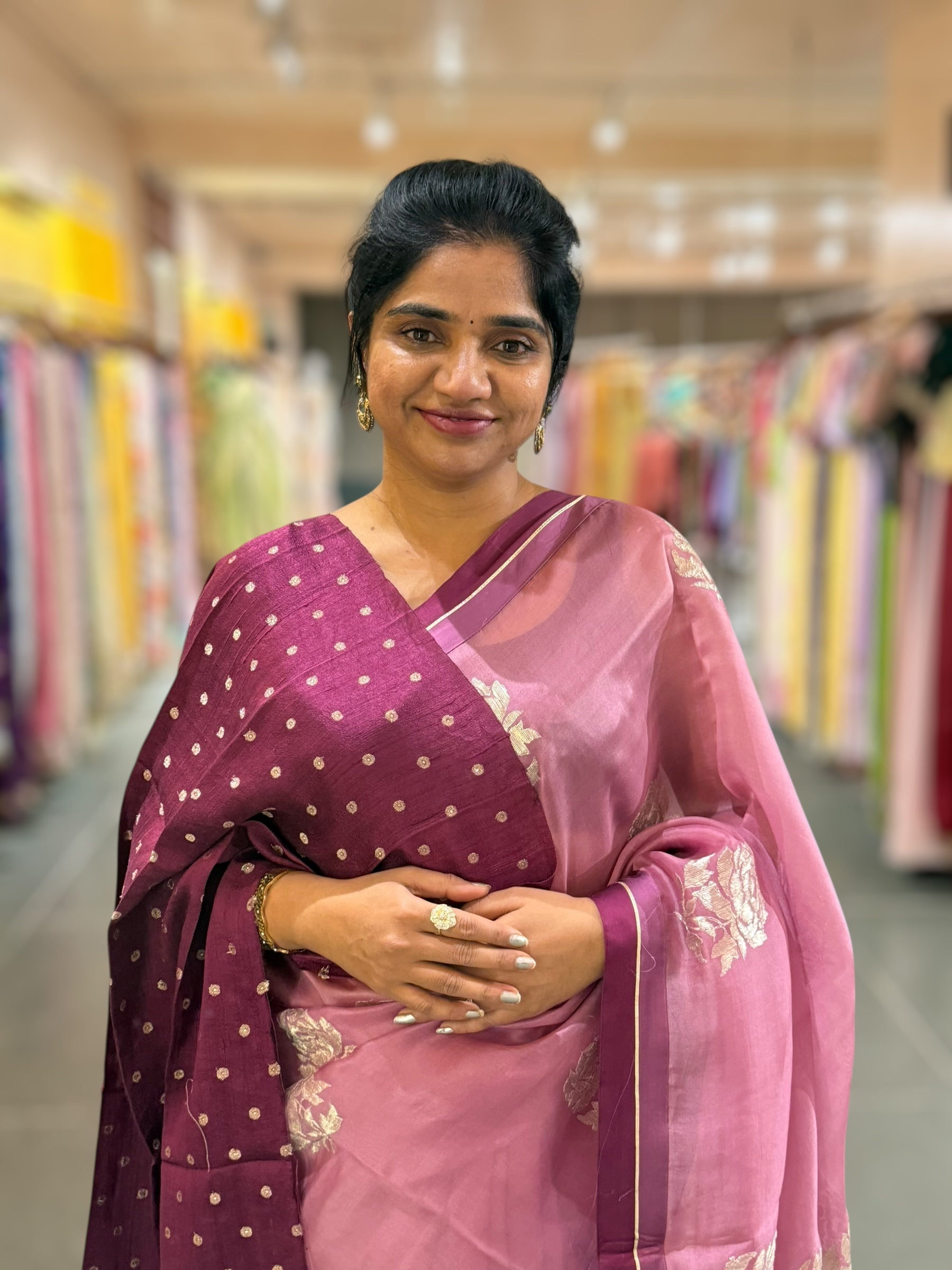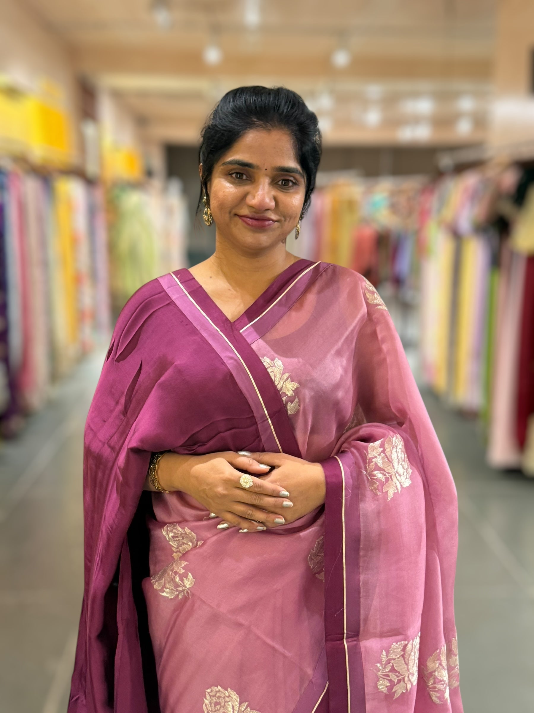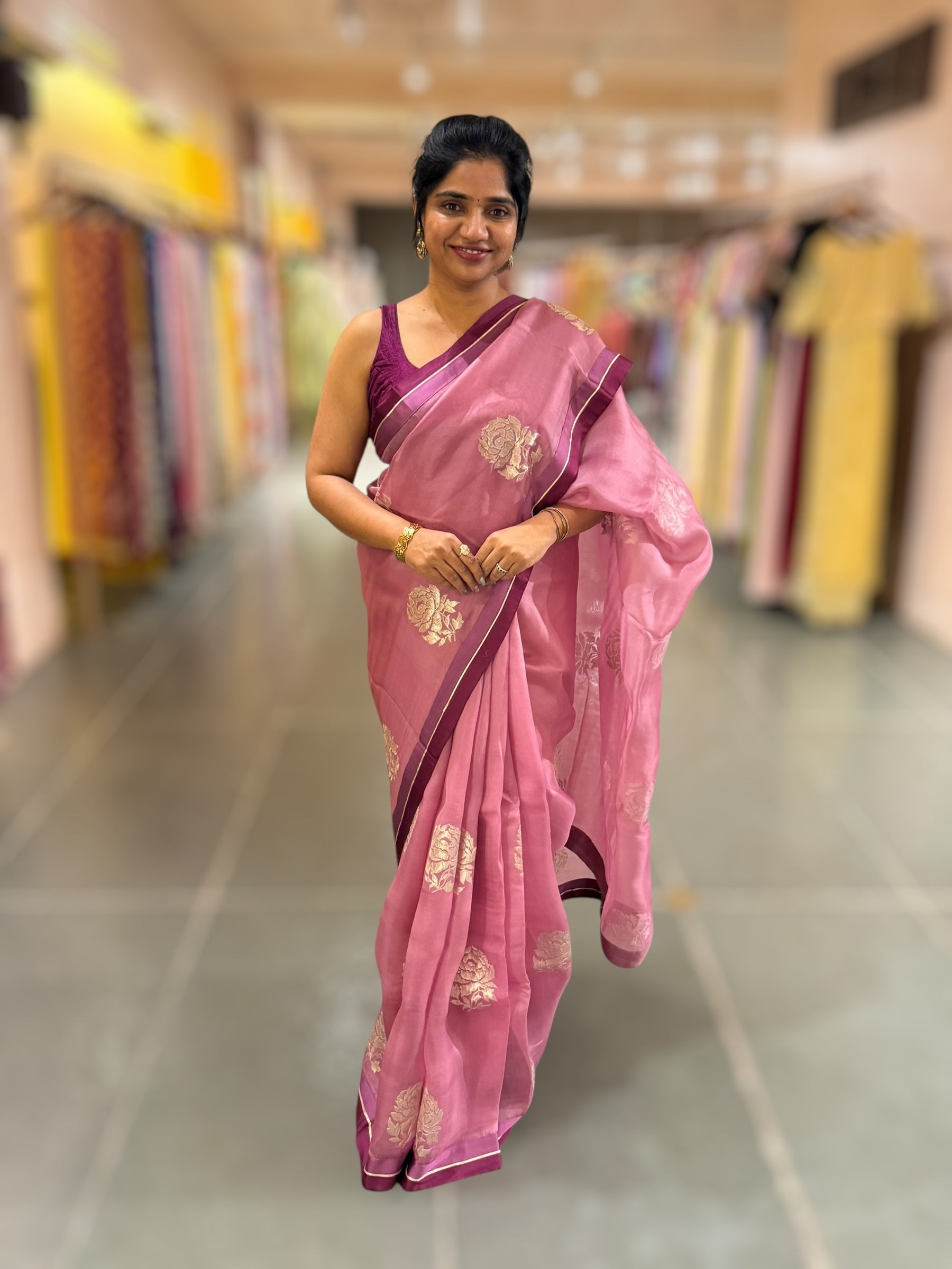 Pure Organza Saree featuring allover water-gold zari rose flower embroidery, beautifully hemlined with double-tone Mashru satin and gota borders.