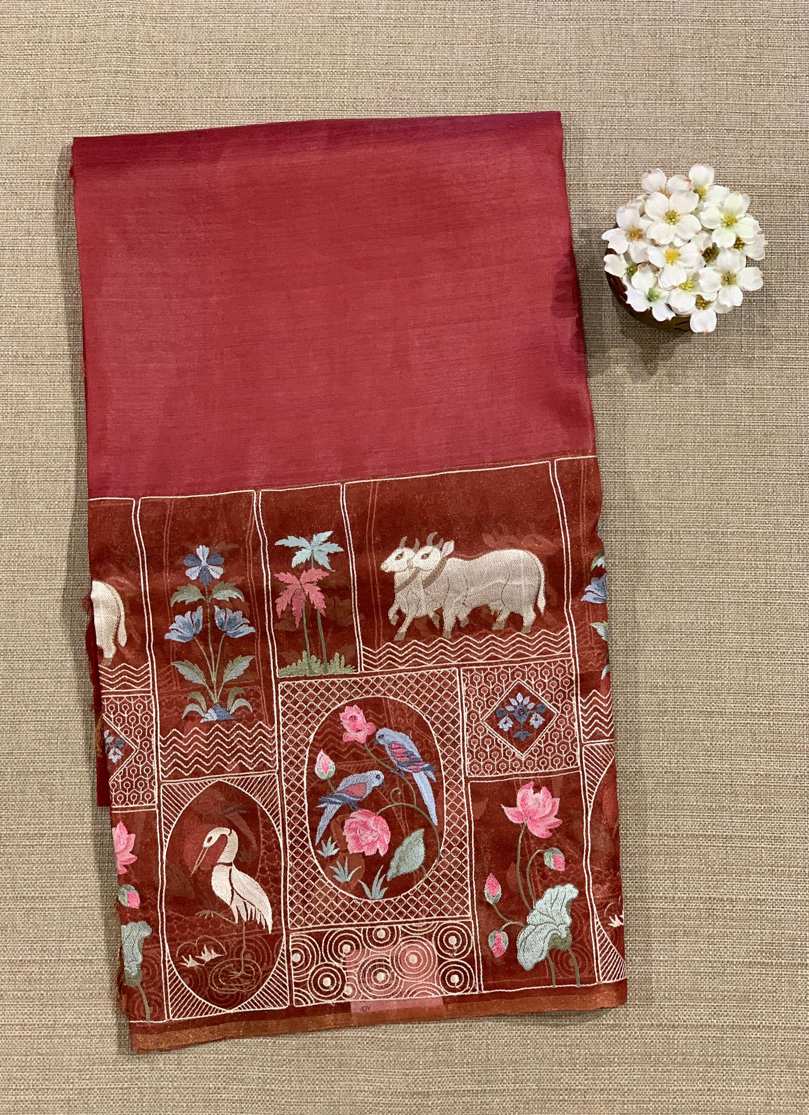Exquisite Kora–Tussar blended pure handloom saree featuring a Patan Patola–inspired figure embroidered tissue skirt border. The intricate embroidery depicts Pichwai-style cows, floral bunches, swans, and birds, lending the drape a graceful fusion of heritage and artistry.