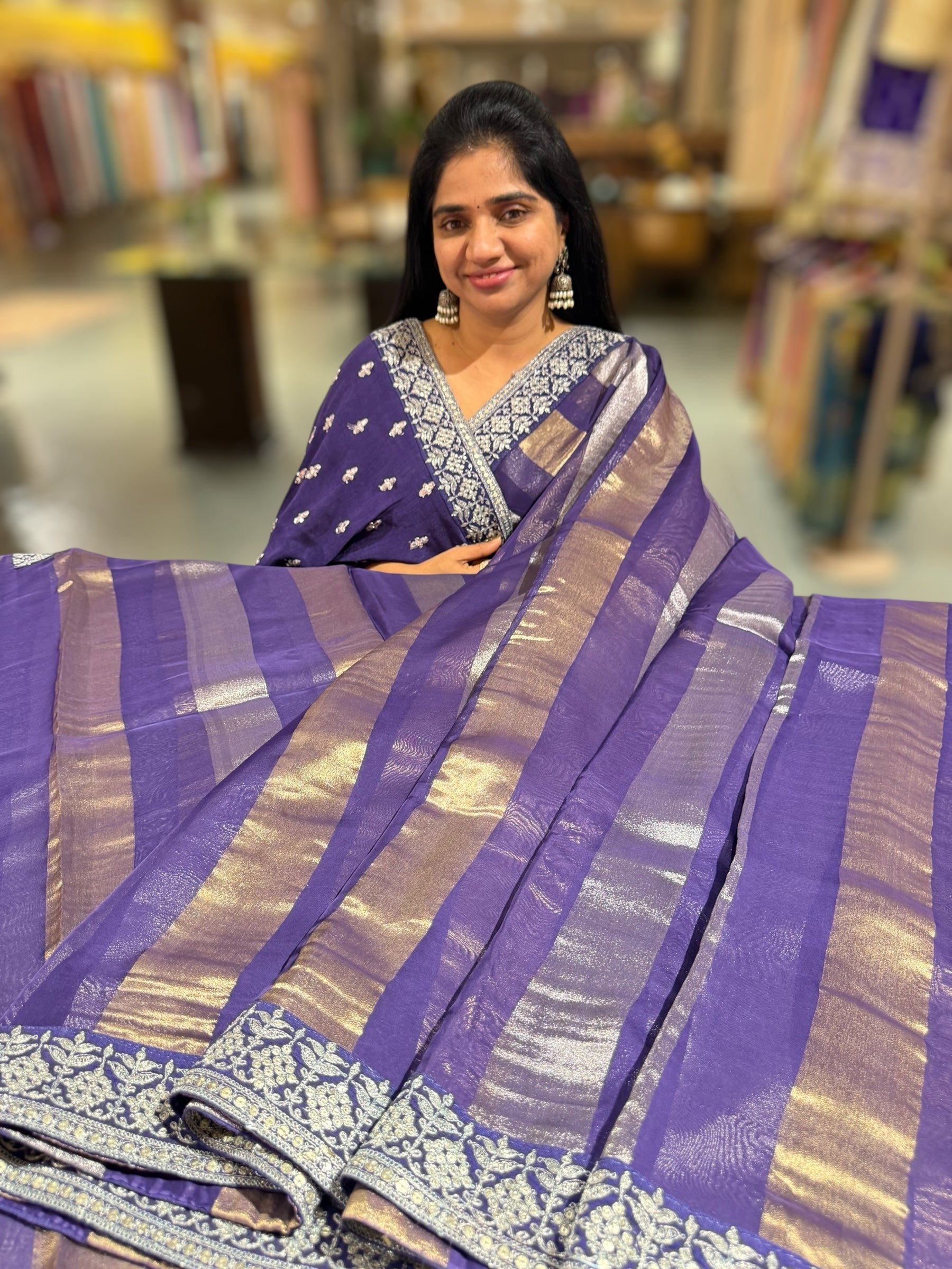 Kora tissue stripes saree featuring alternating silver and golden zari stripes, hemlined with Sabyasachi borders. Paired with a falling raw silk blouse adorned with allover flower butis and matching Sabyasachi borders.