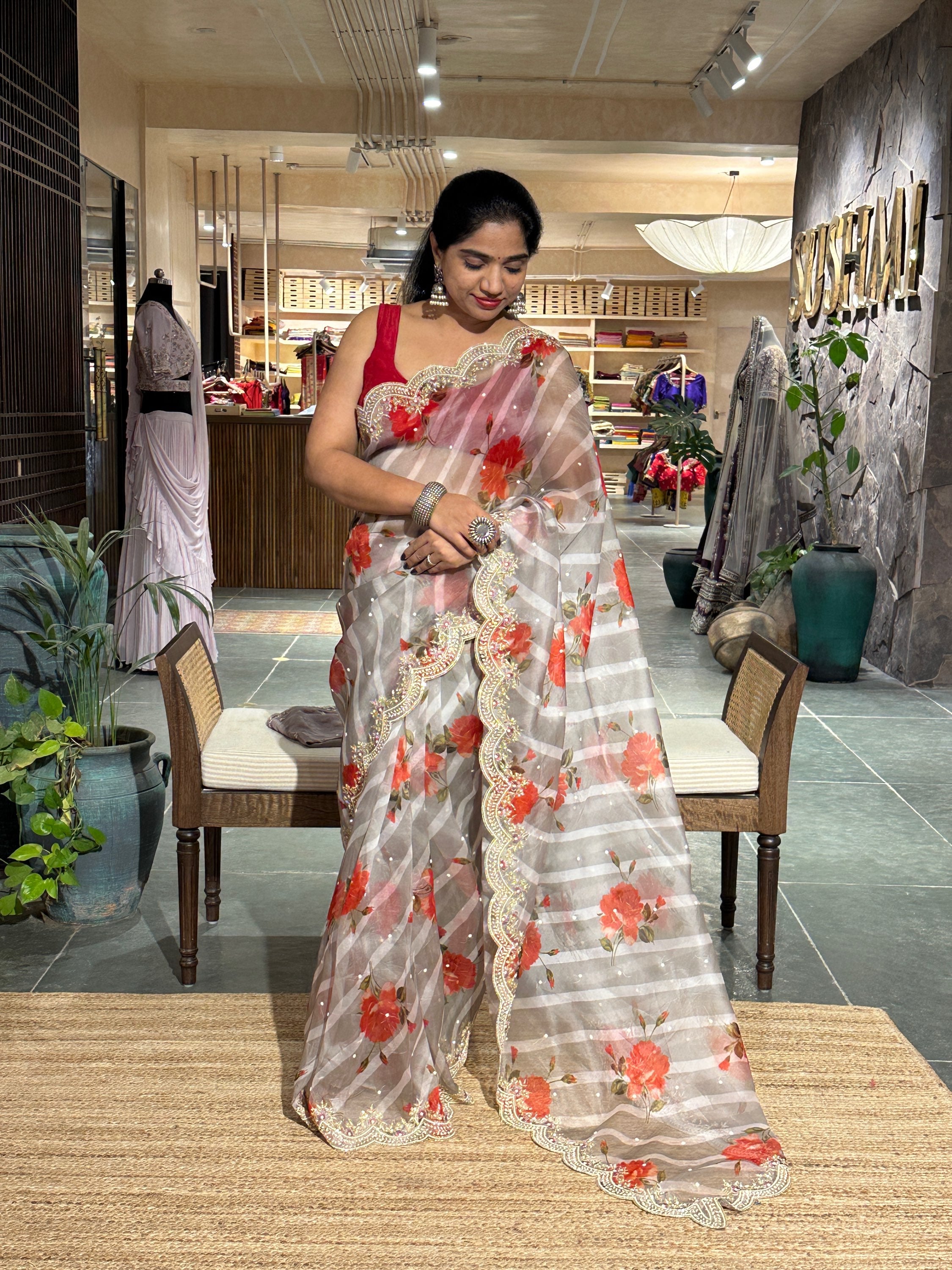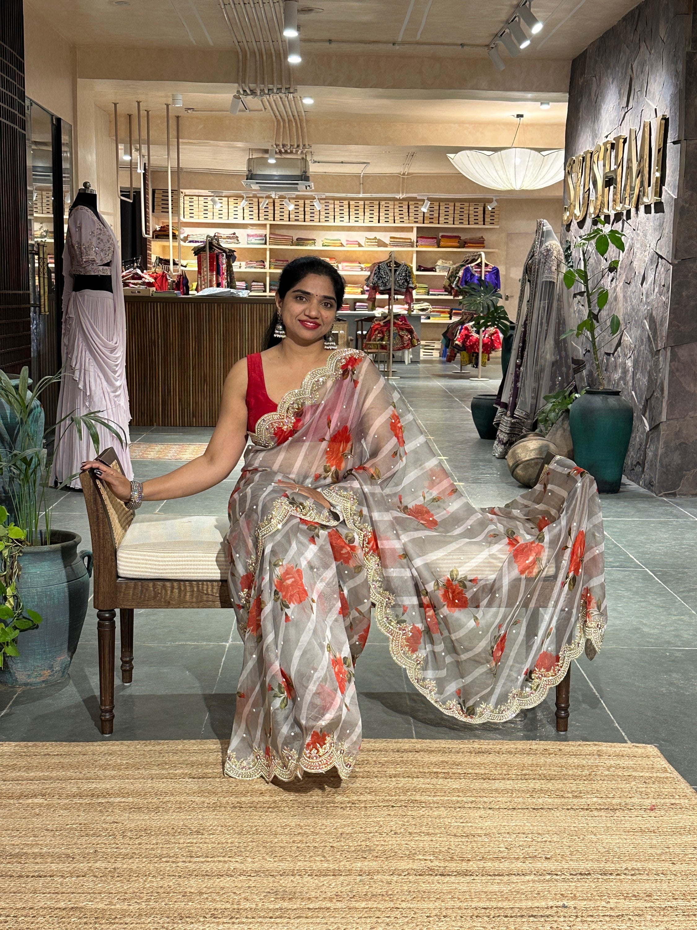 • Earthy Tone Pure Organza lehariya Floral Printed With Handwork Border