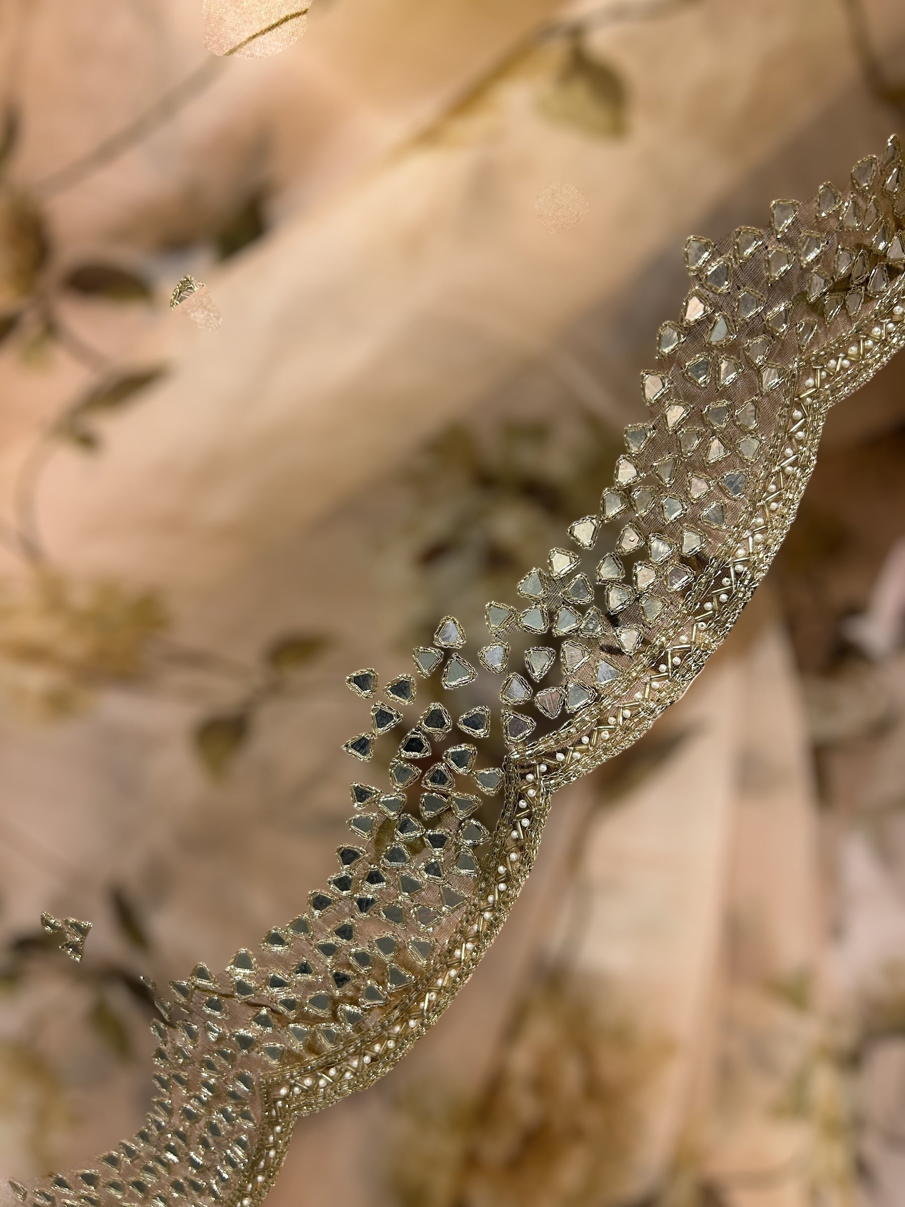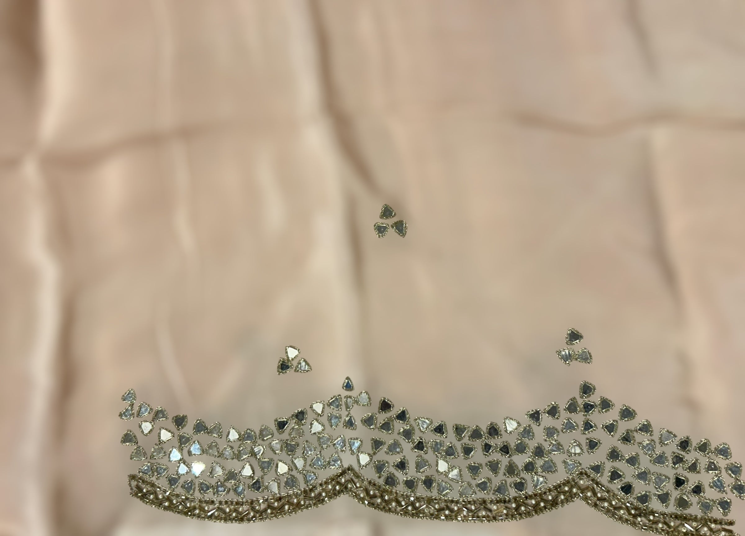 • Peach Organza floral Printed Saree with mirrorwork handwork scalloped Border