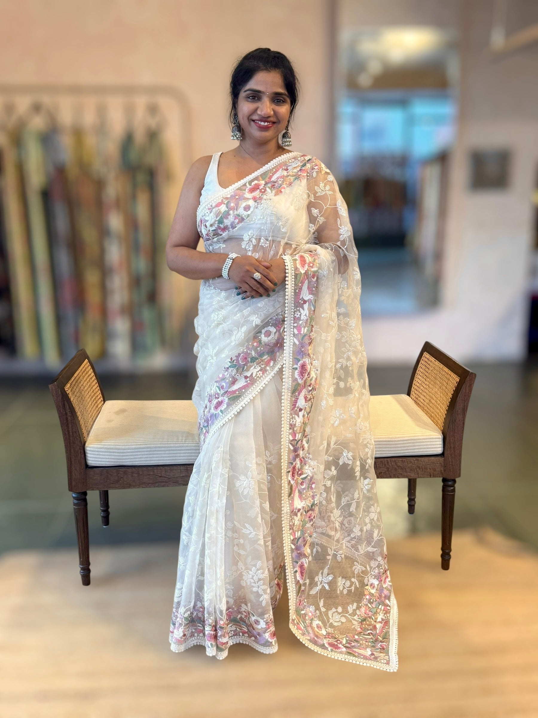 Ivory Organza Saree with Allover Floral Sequence Work & Parsi Embroidered Border