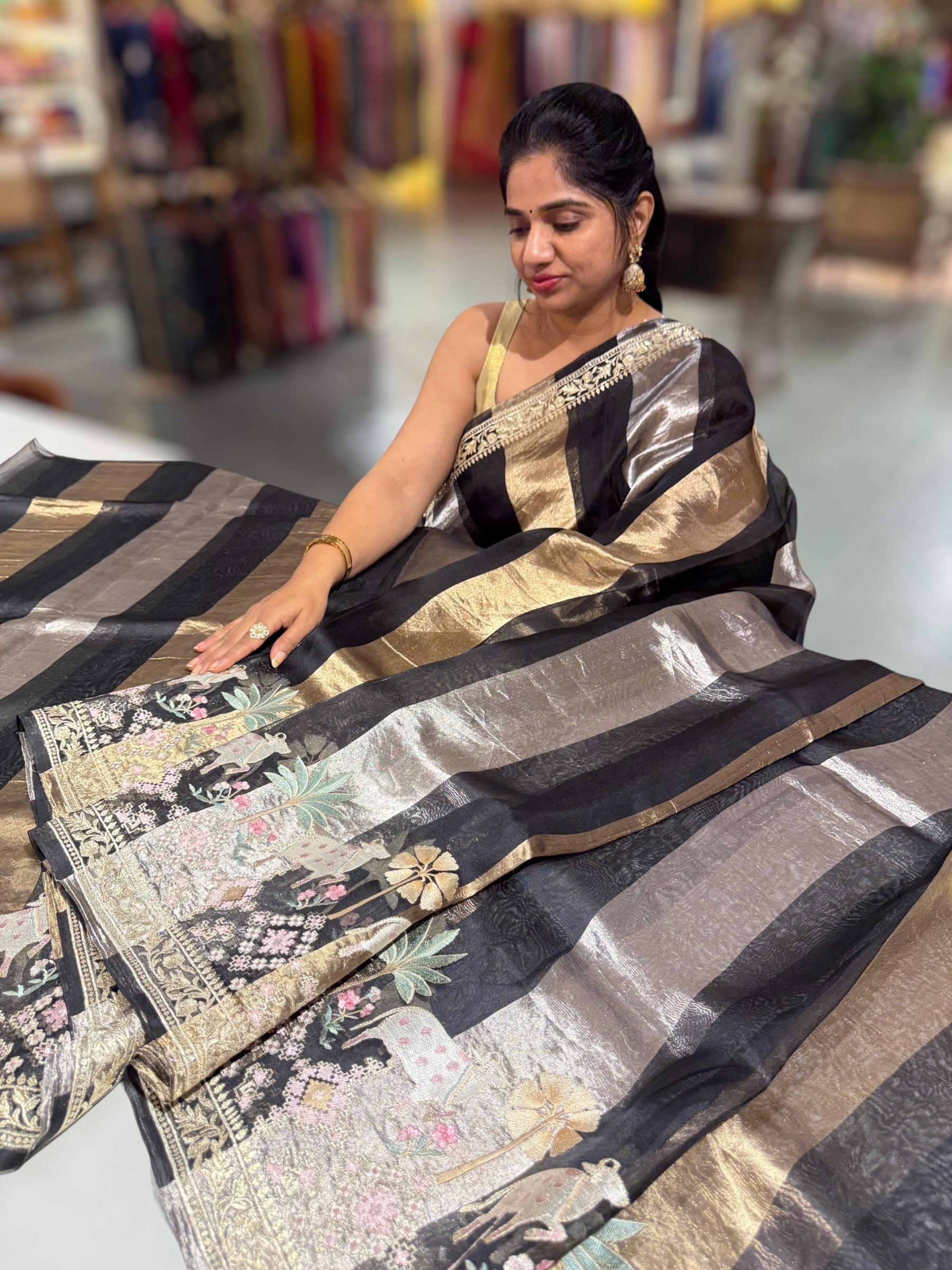 • Black Kora Tissue Stripes Saree With Jamdani & Pichwai embroidered Border