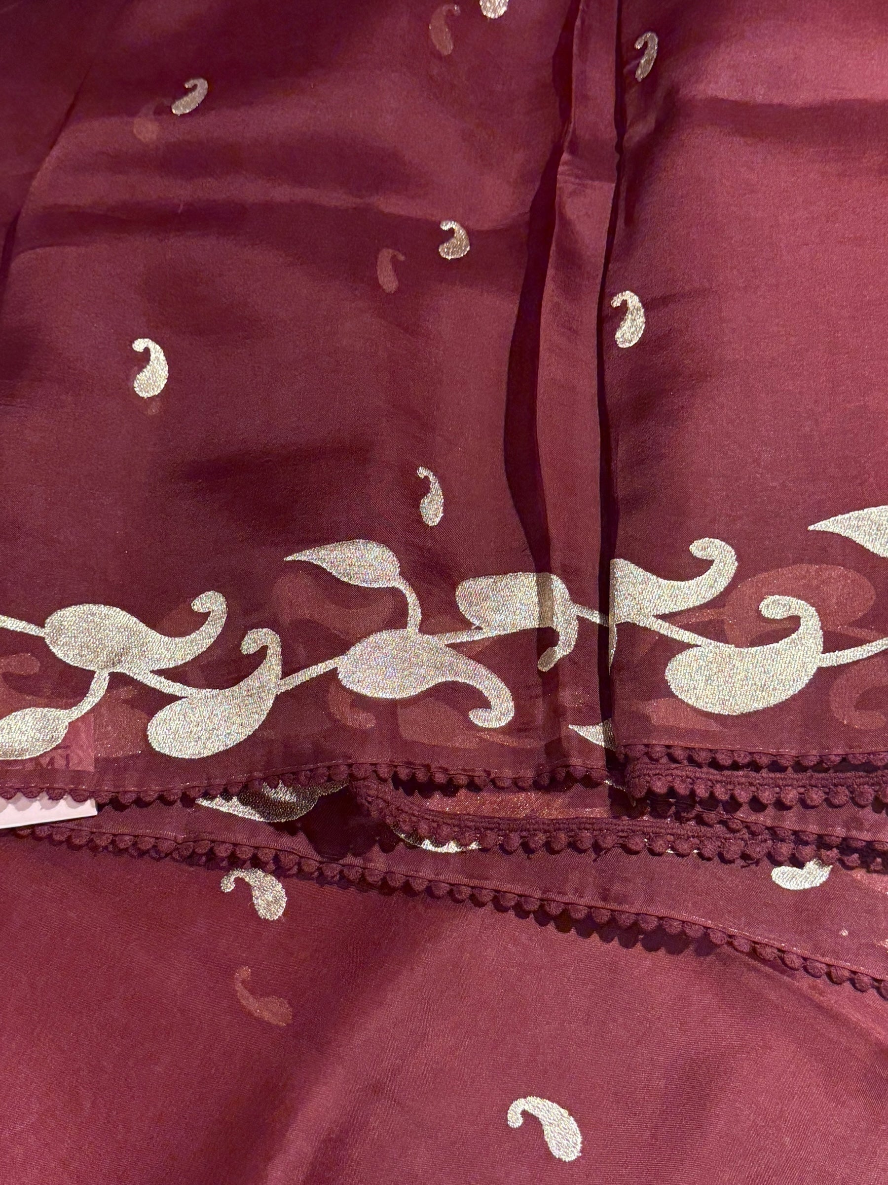 • Meroonish Brown Organza Saree with stunning zari embroidered mango border and heavy designer pallu