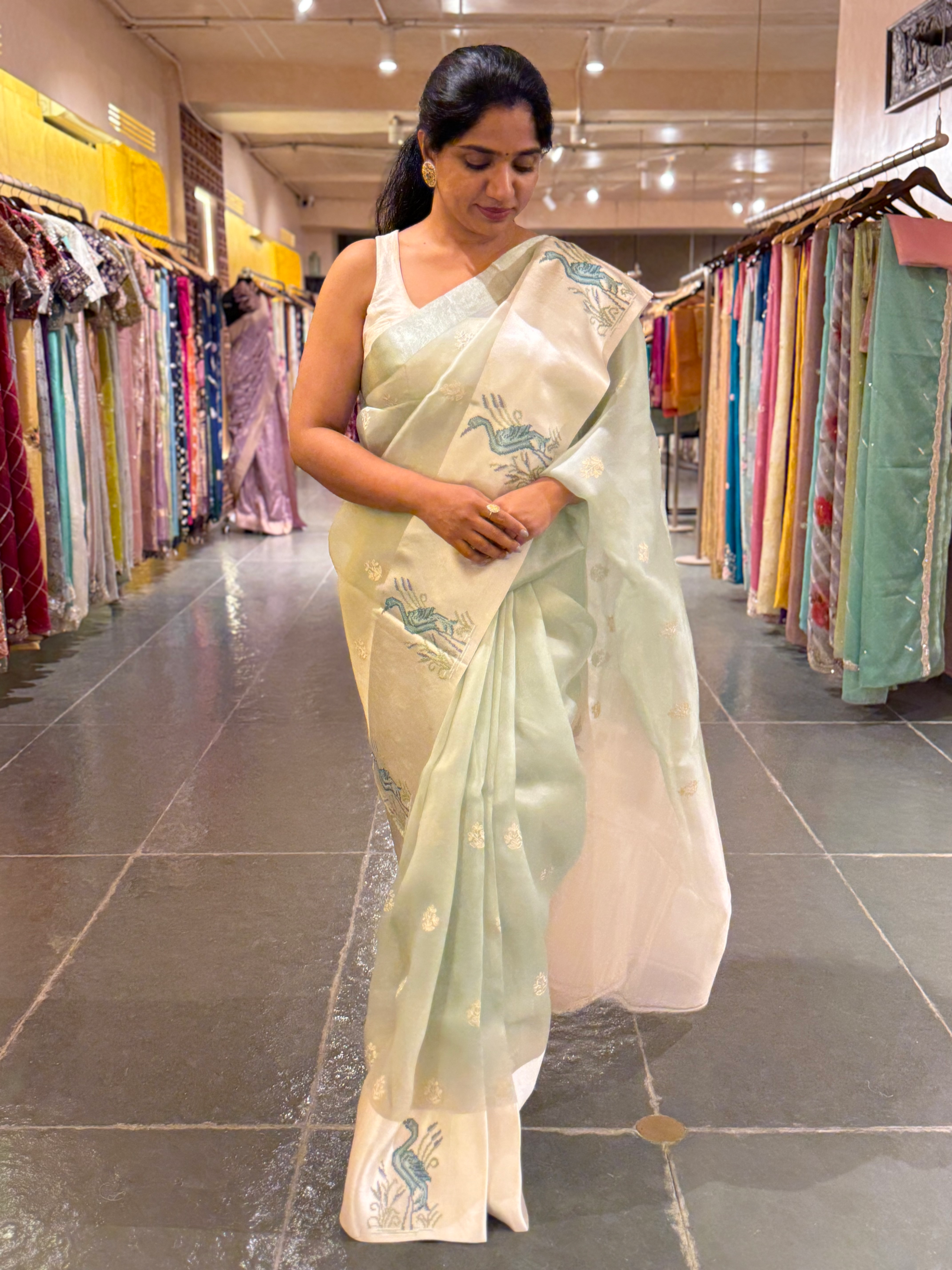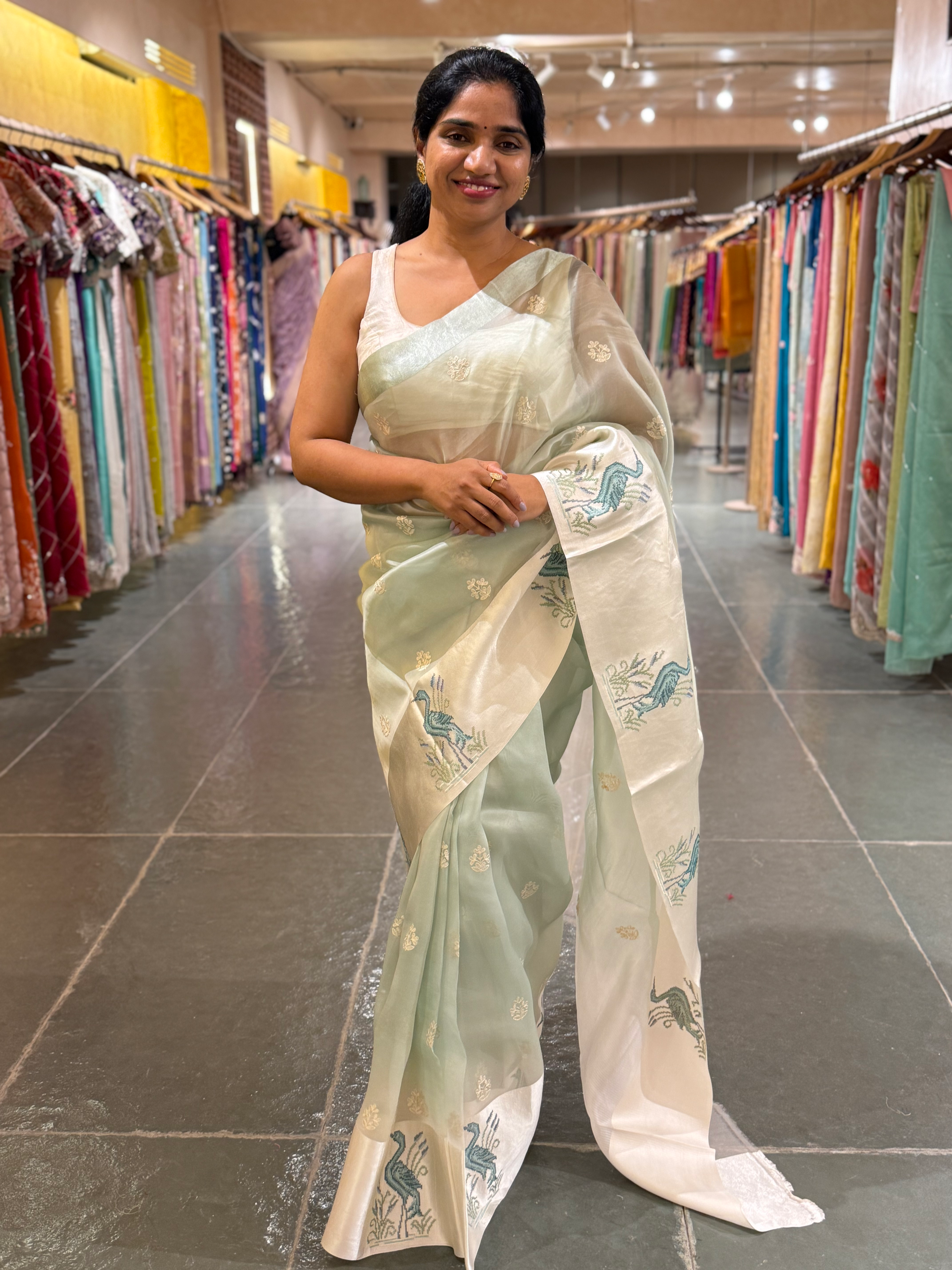 This Mint Pure Organza Silk Saree feels like a breath of fresh air. It’s intricately embroidered all over, paired with a soft ivory mashru satin border detailed with petite point embroidery of elegant bird-inspired motifs. The contrasting ivory pallu adds a delicate balance to the look.