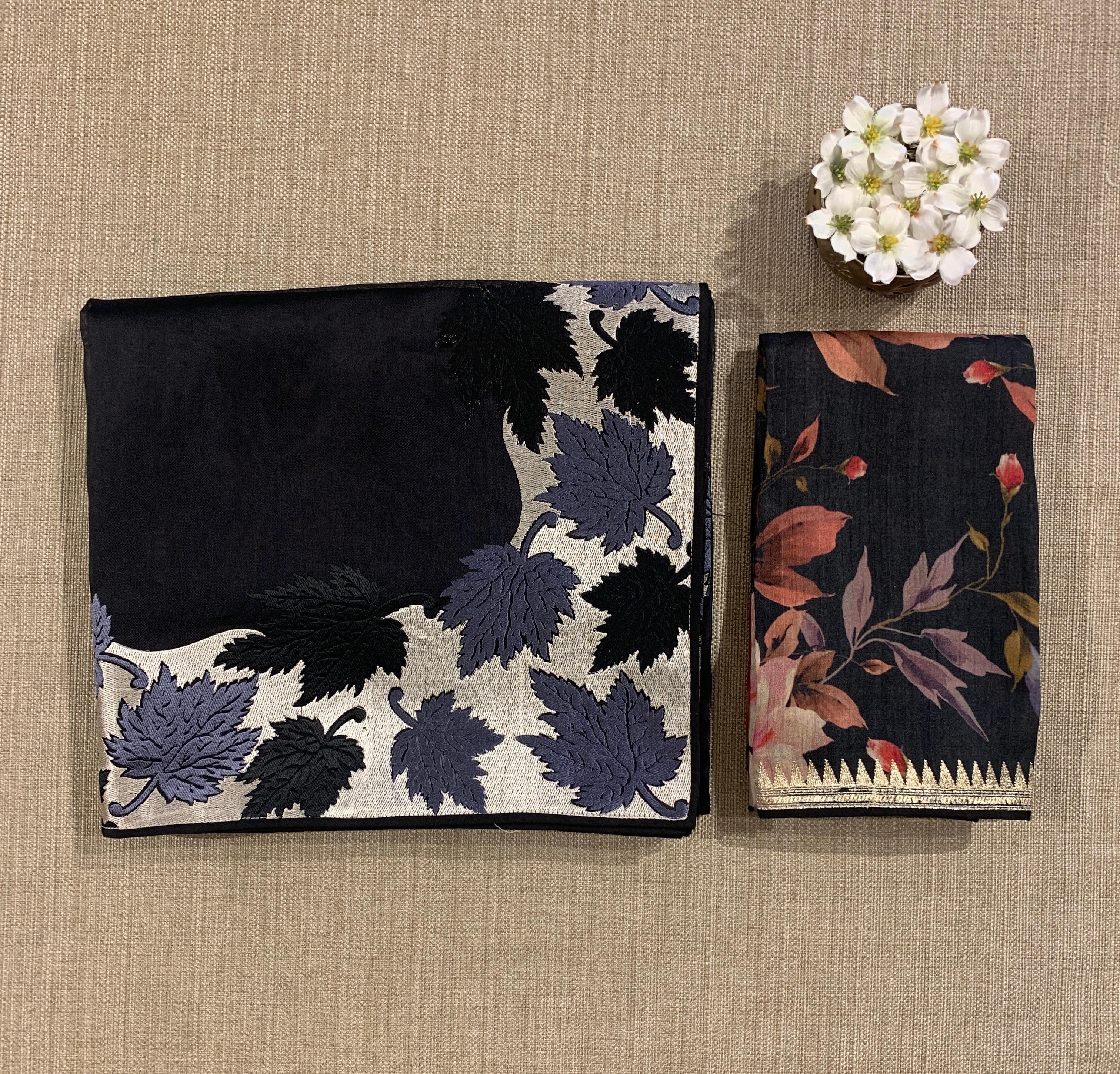 • Black Organza Saree with Stunning Leaf Embroidered Border