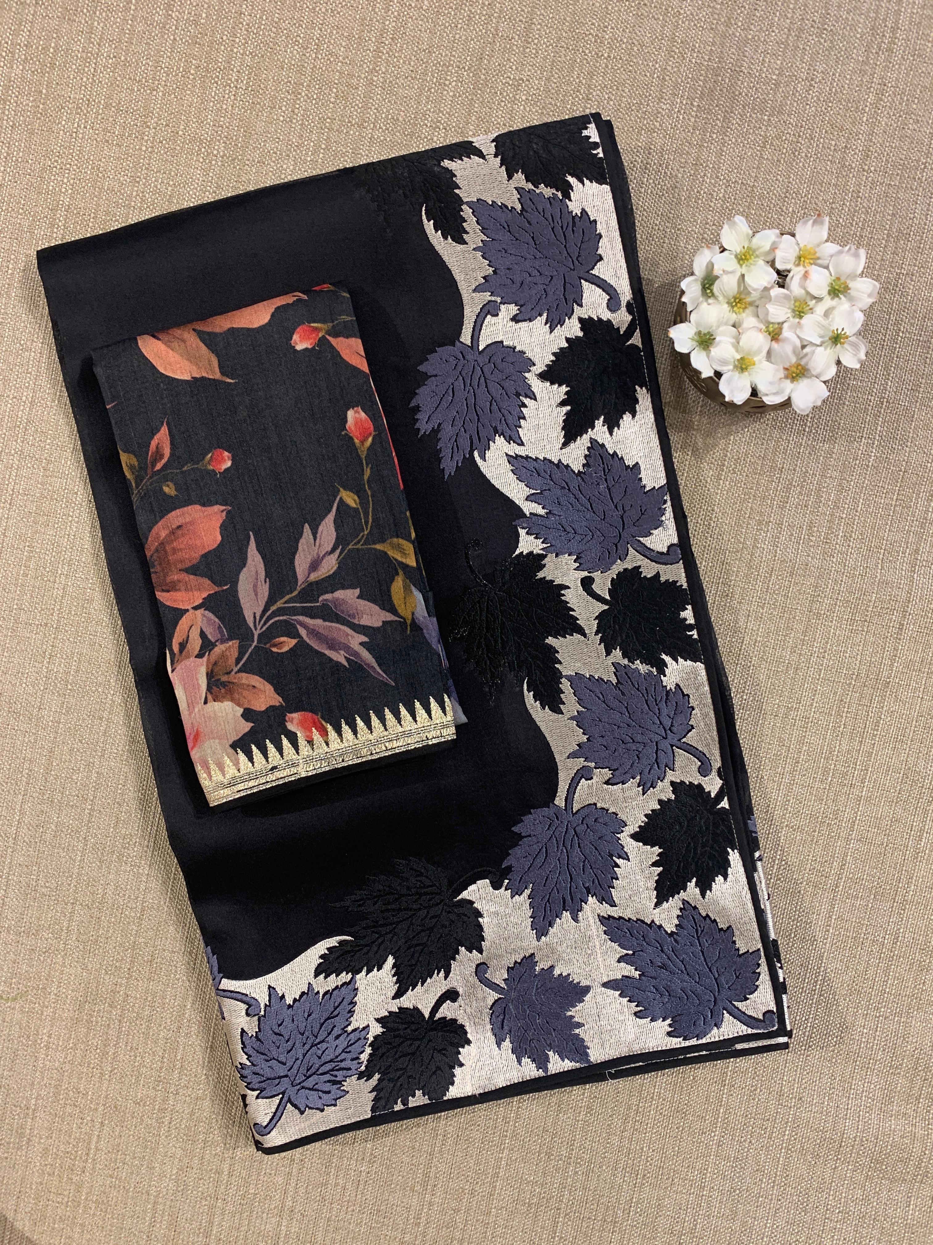 Pure Organza Saree with Stunning Leaf Embroidered Border and hemlined with self piping . Blouse is Pure Tussar Floral Printed Blouse with cute temple embroidered border.