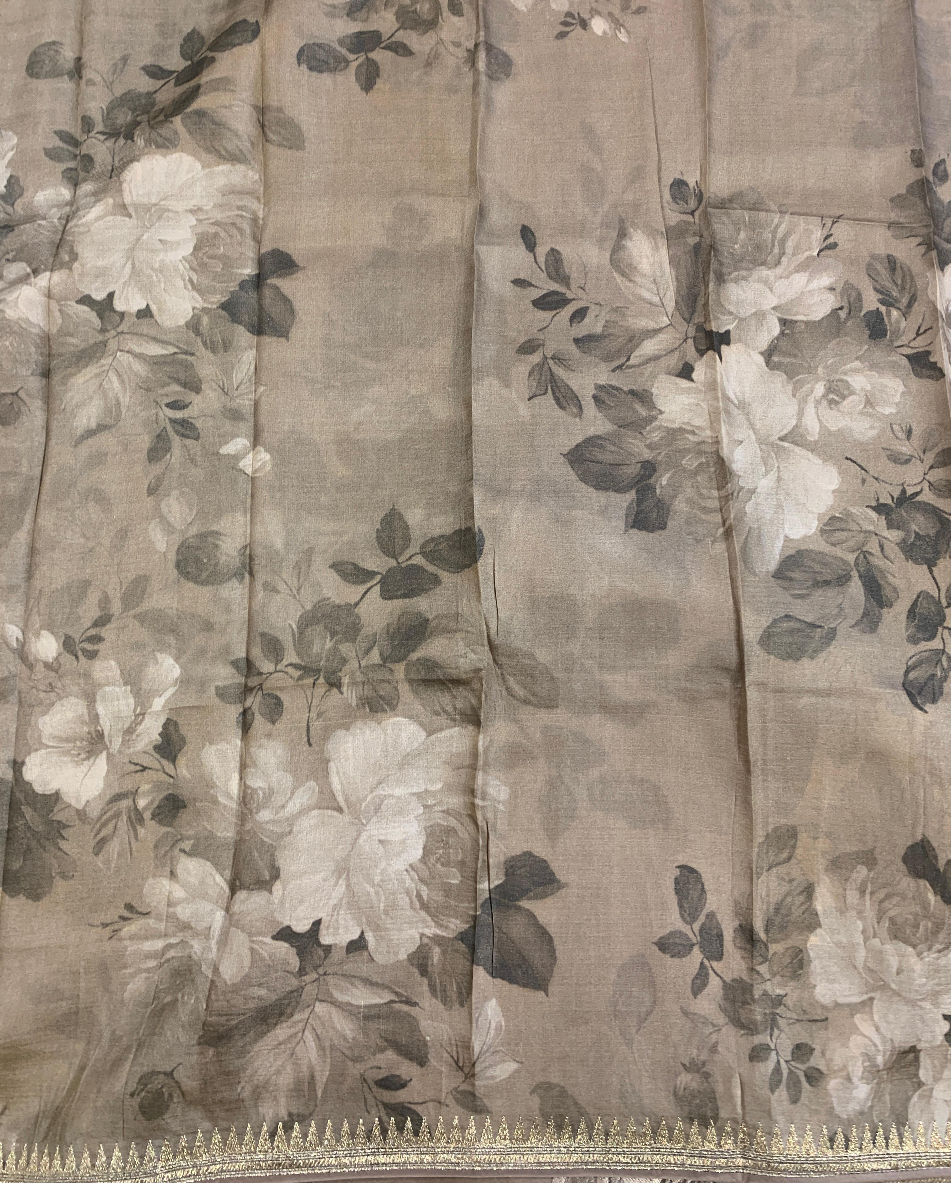 Pure Organza Saree with Stunning Leaf Embroidered Border and hemlined with self piping . Blouse is Pure Tussar Floral Printed Blouse with cute temple embroidered border.