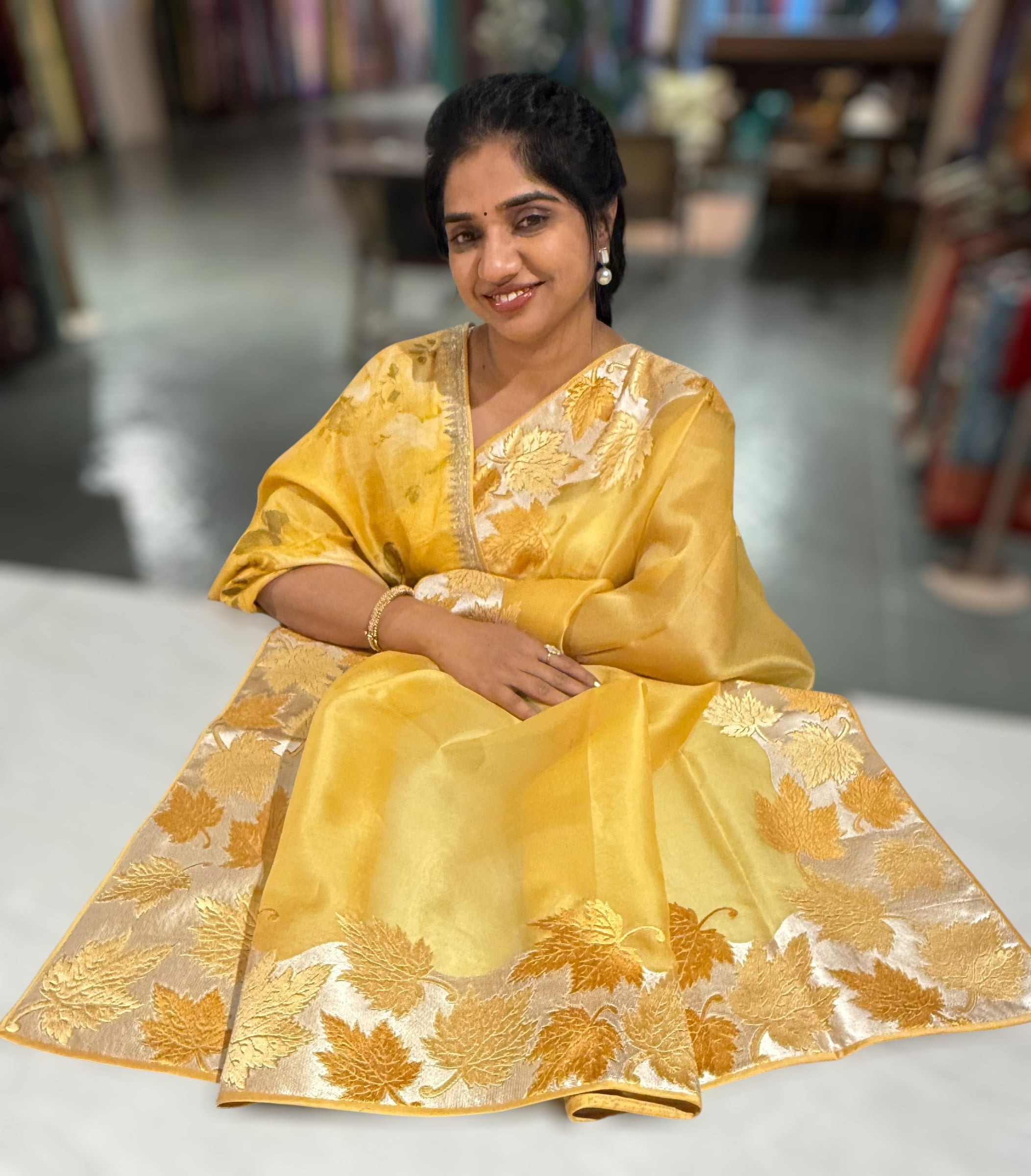 • Yellow Organza Saree with Stunning Leaf Embroidered Border