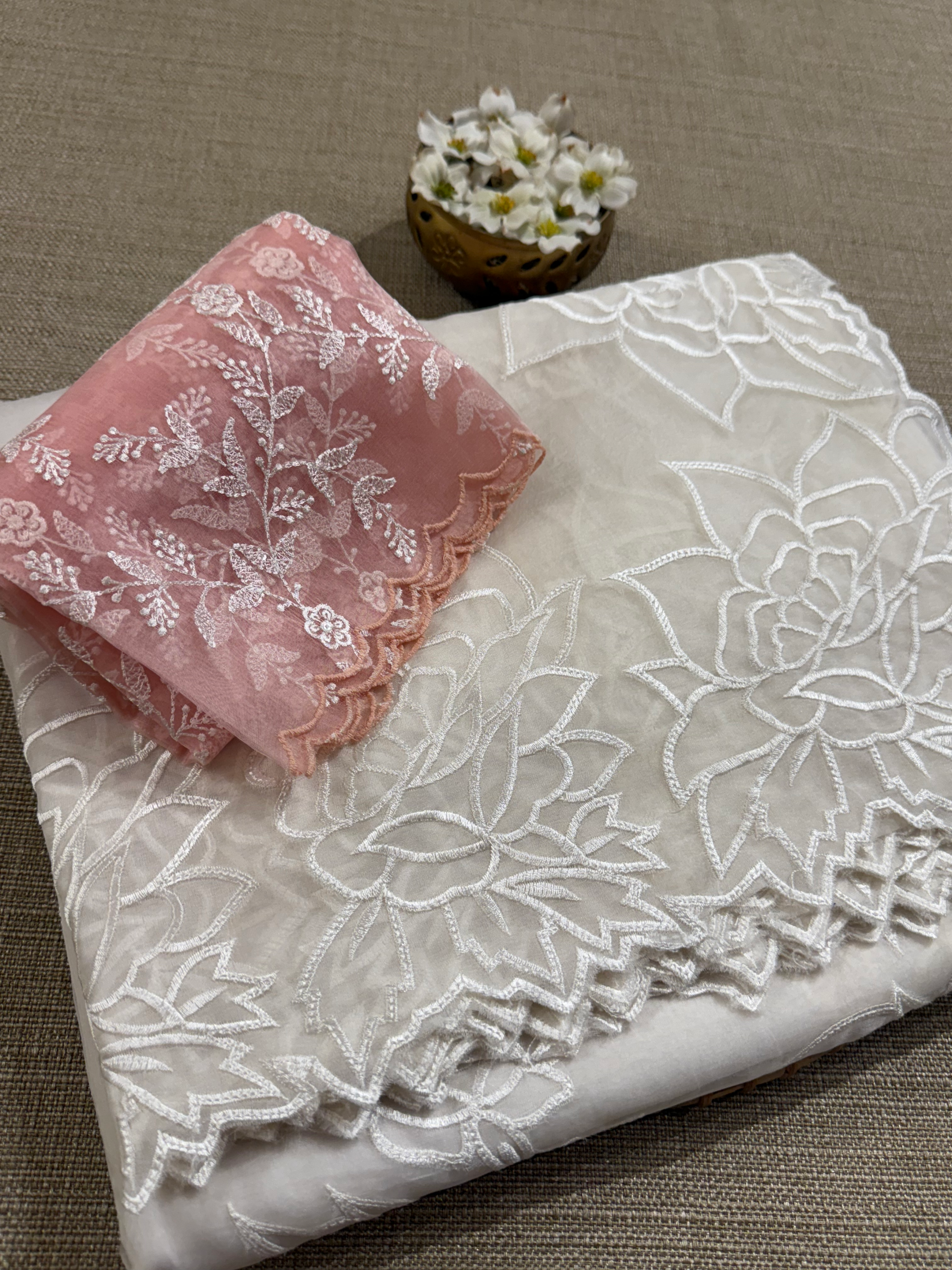 White Organza Saree with Embroidered Rose Border paired with organza thread embroidered blouse .