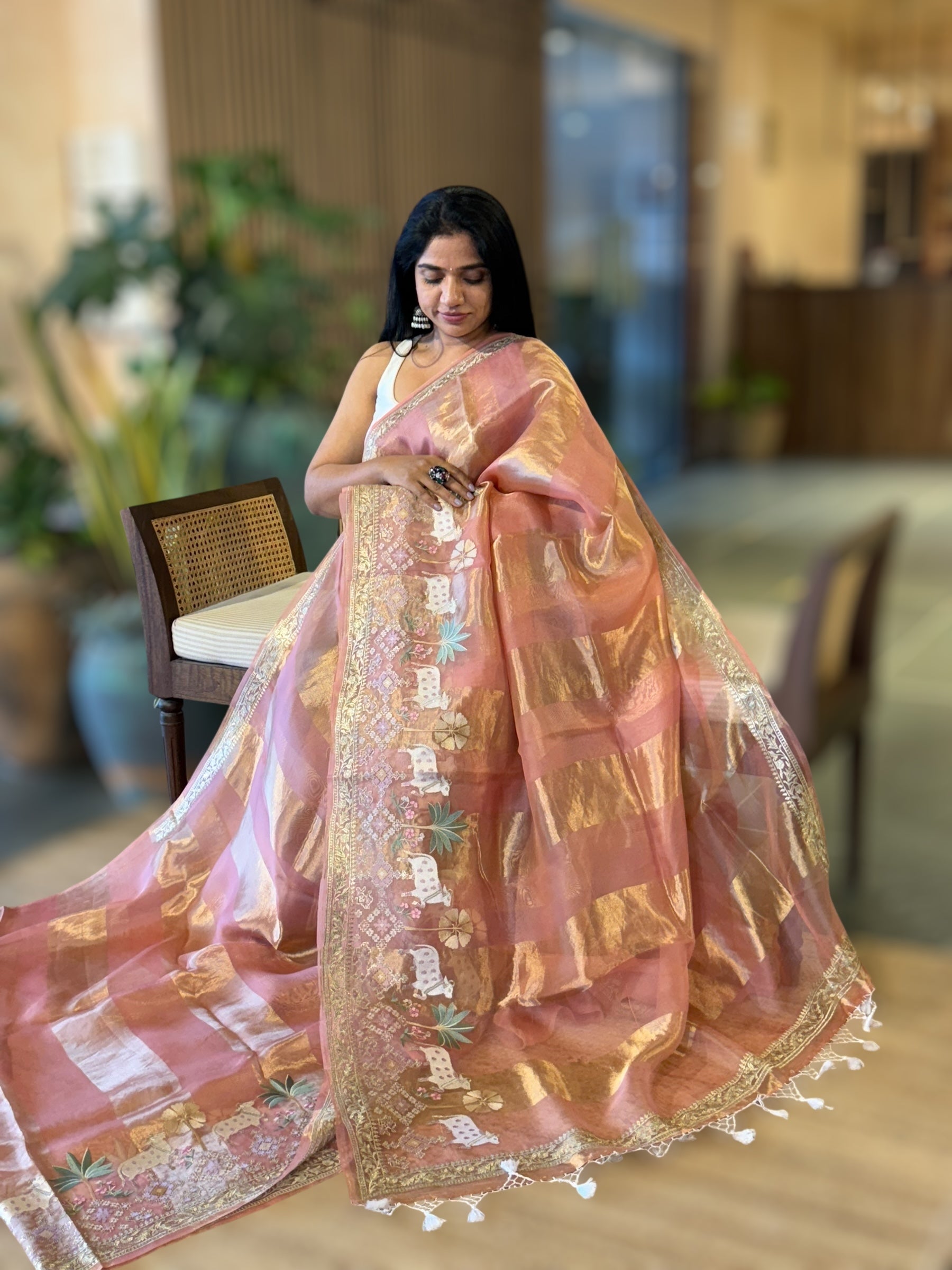 • Peach Pink Kora Tissue Stripes Saree With Jamdani & Pichwai embroidered Border