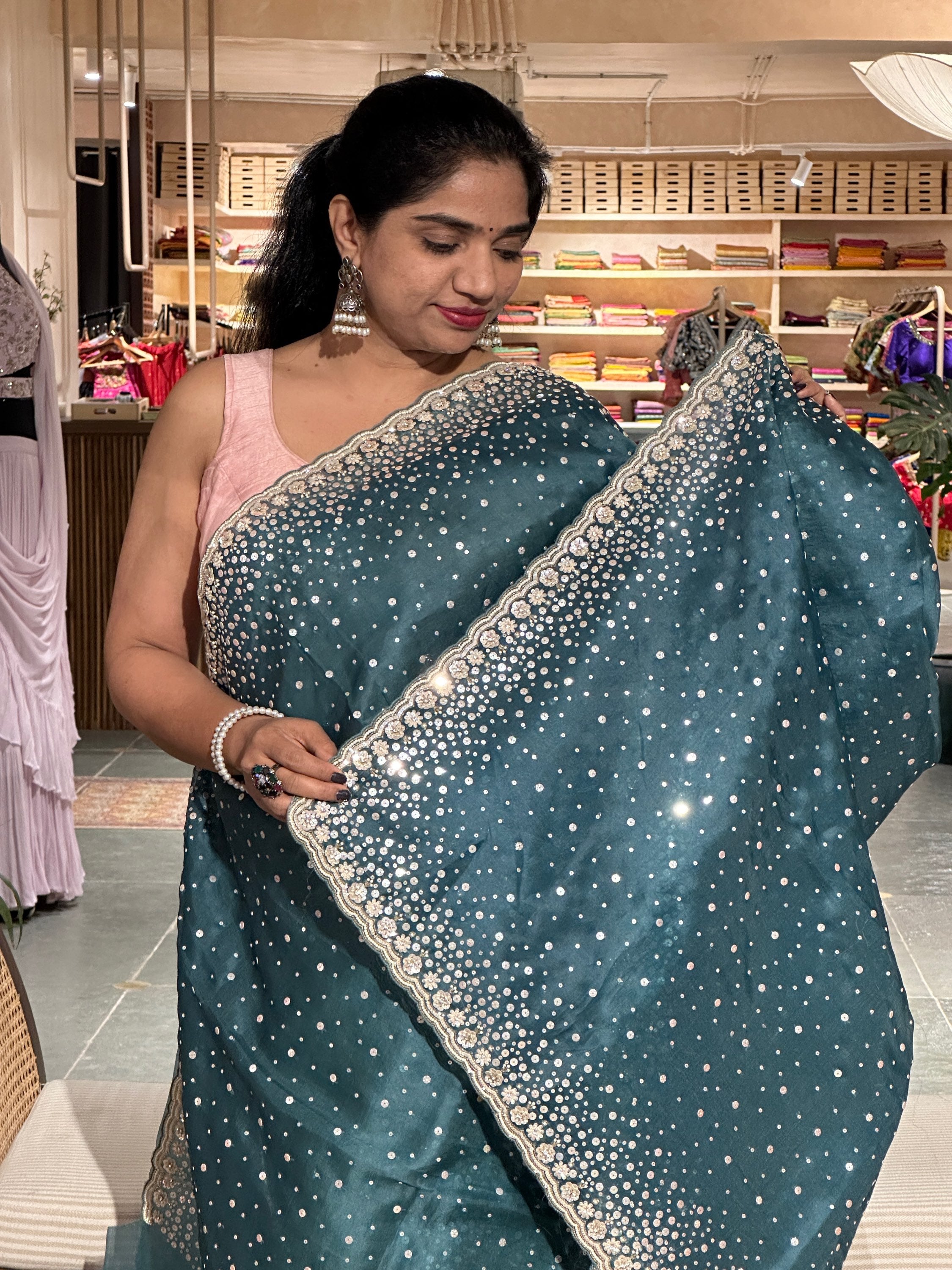 Peacock blue Pure organza saree with allover handwork pallu with border . For pleat part handwork os done up till the knees