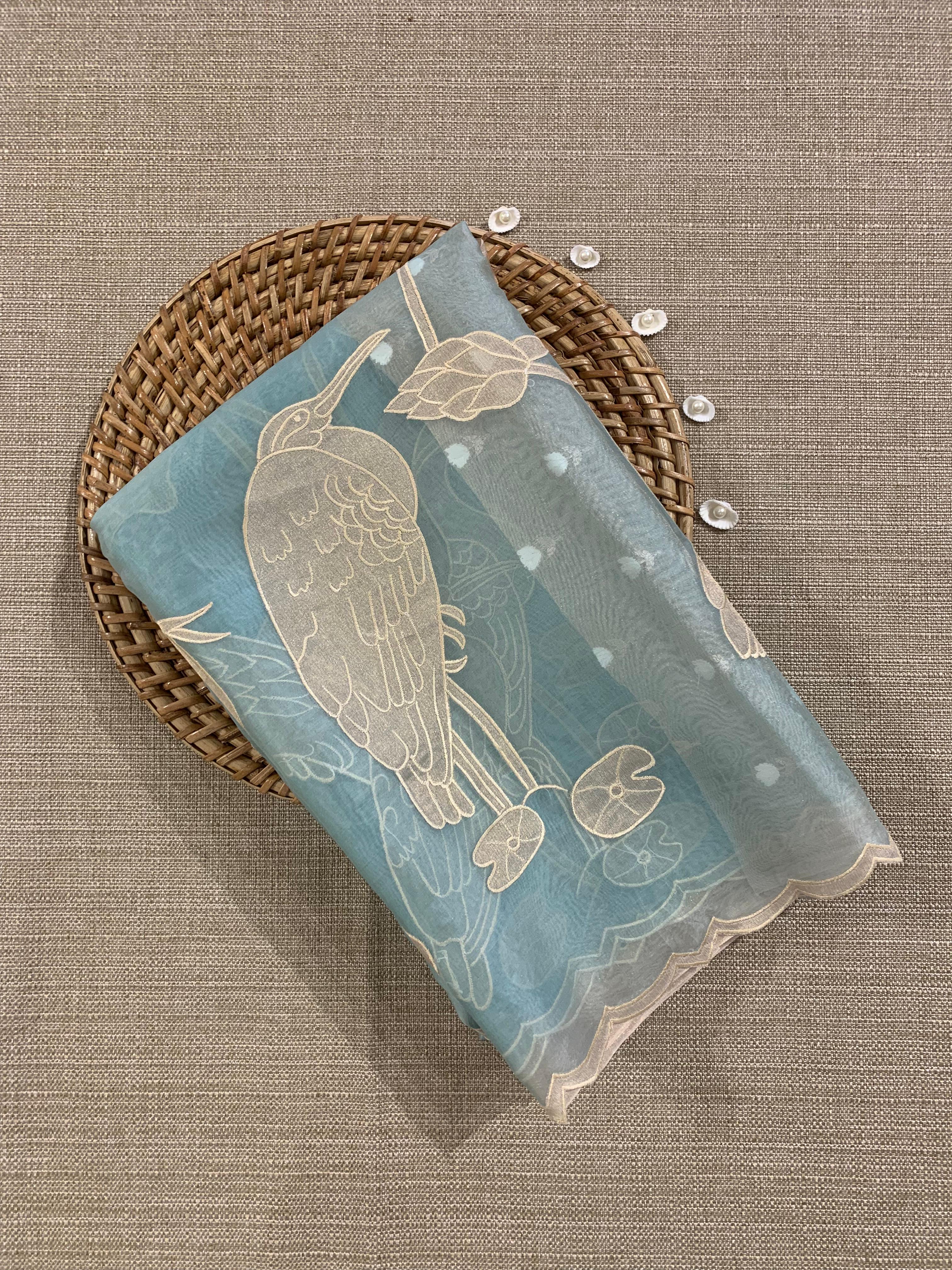 • Sky Blue Pure Organza Designer Saree with Allover Tissue Applique Embroidery