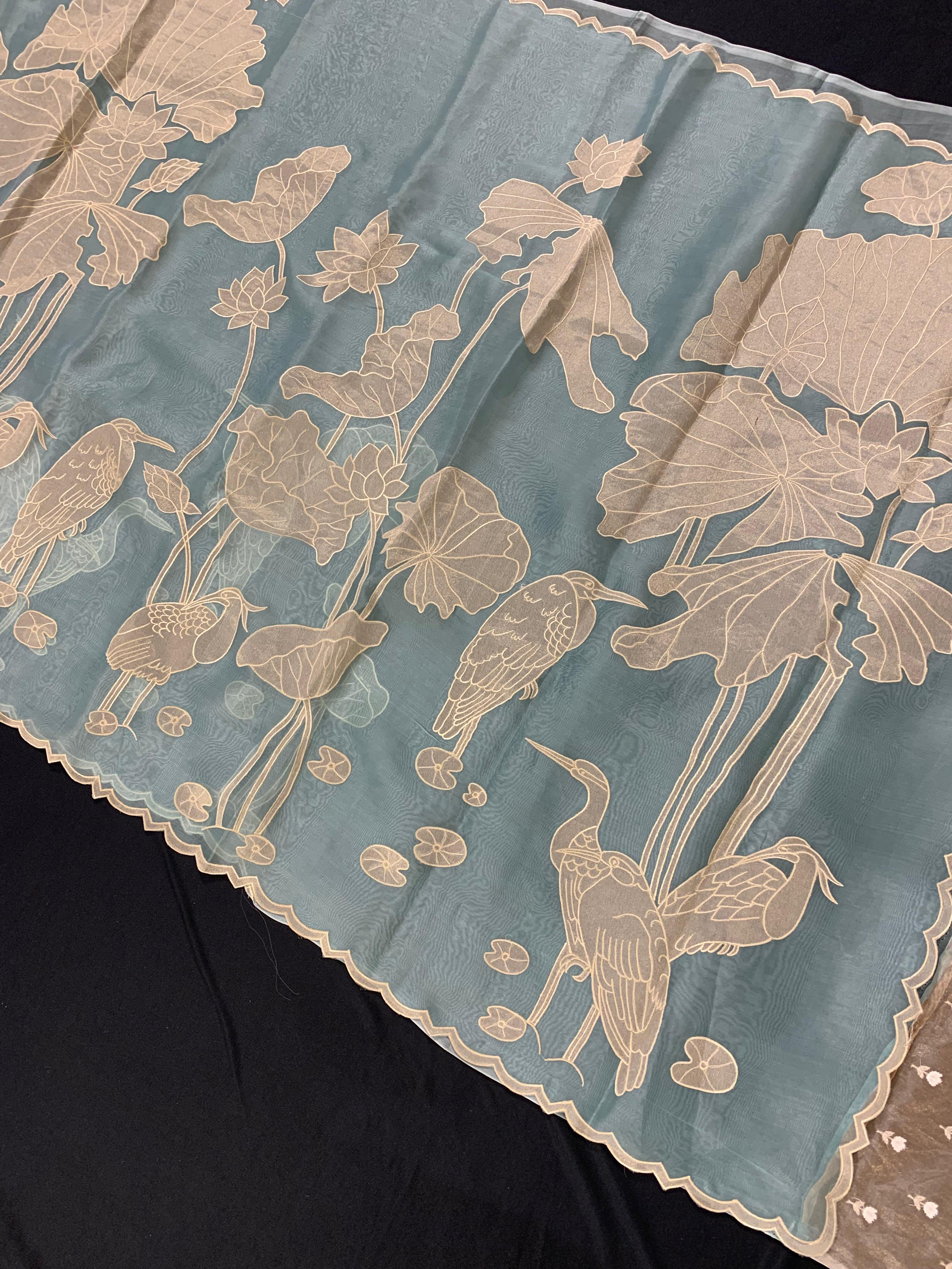 This Skyblue Pure Organza Designer Saree is a Masterpiece which features an all-over Light Gold Tissue Applique Embroidery with a stunning lotus pond design, complete with swans, lotus flowers, and leaves, and is hemlined with beautiful scalloped cutwork done with tissue fabric.