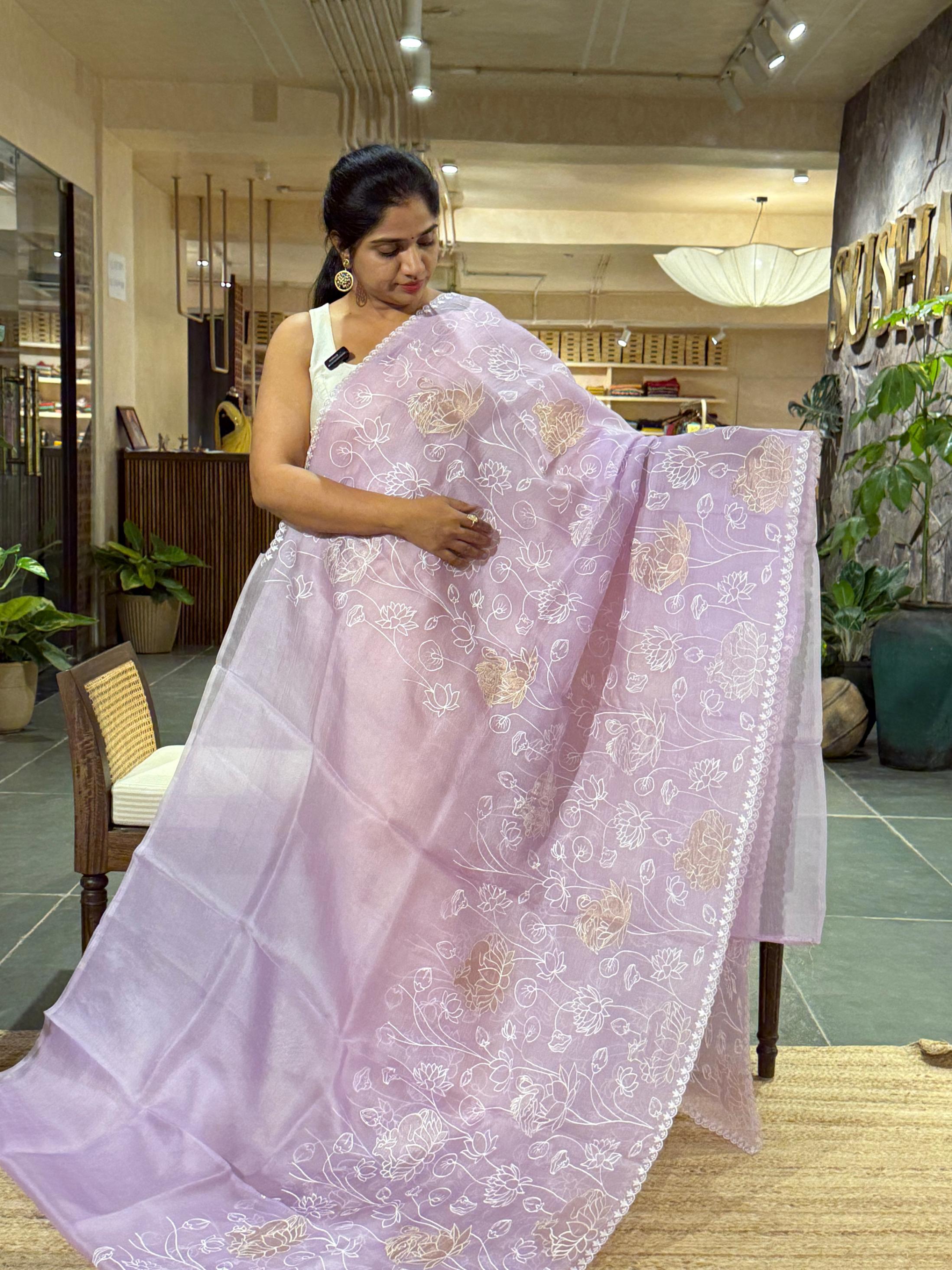 SOAA1609 : Lilac Organza Saree with Allover Pichwai Applique Embroidery