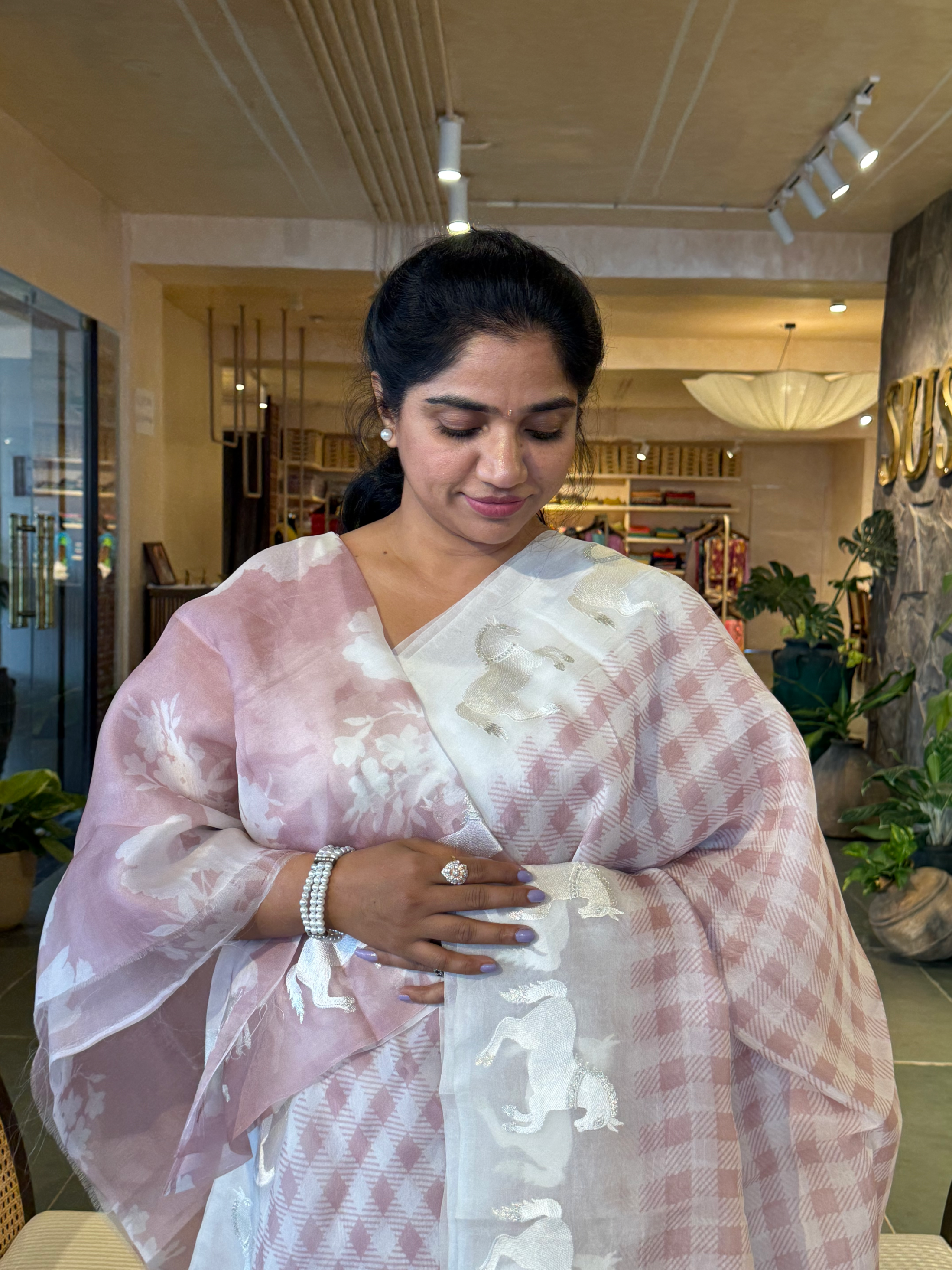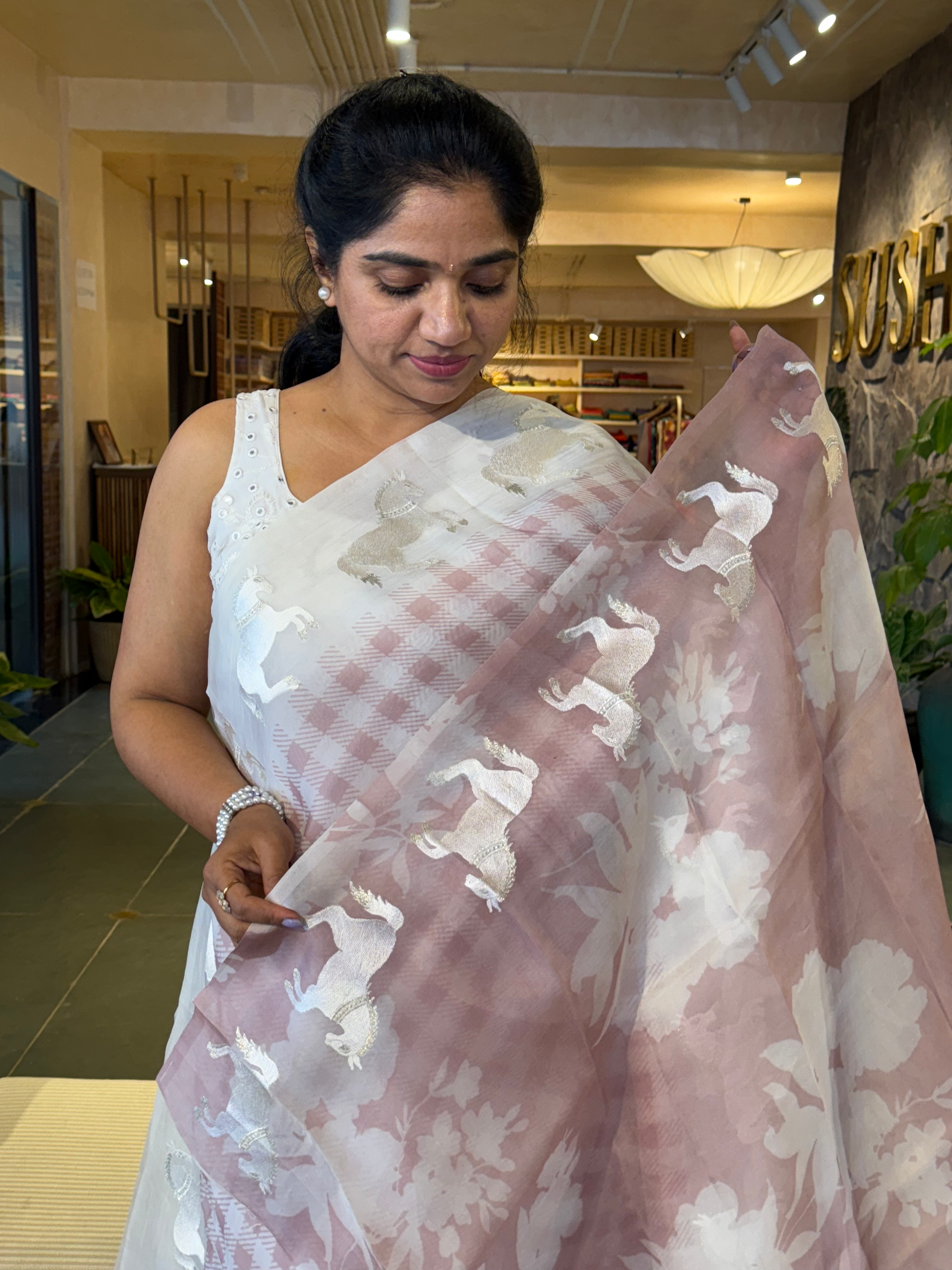 This exquisite white organza saree boasts lilac checks and an intricately embroidered horse border, perfectly paired with a stunning floral blouse featuring an embroidered border.