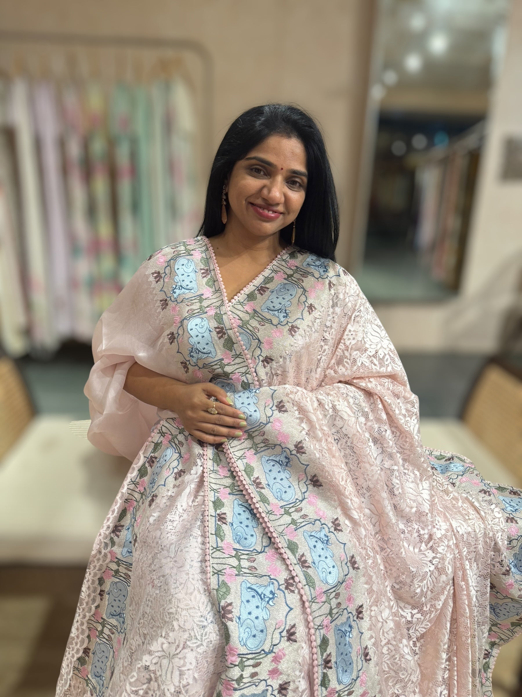 Pastel Pink Chantilly Lace Saree With Tissue Nandi Embroidered Border