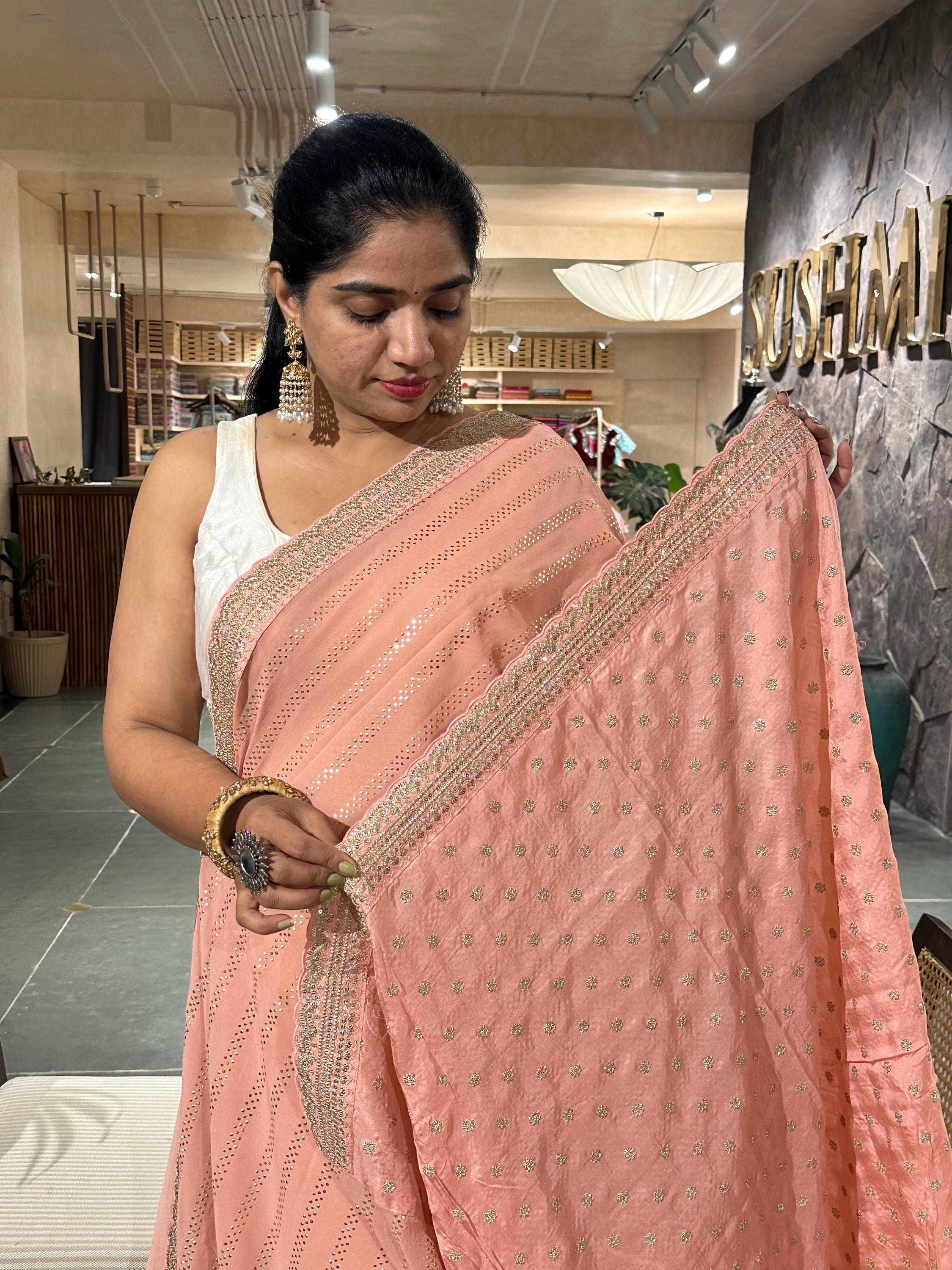 Salmon Pink Pure gorgette Saree with beadchip work allover the saree in stripes pattern hemline with sabyasachi style borders with scalloped edgind and finished with backing on the back of the border .