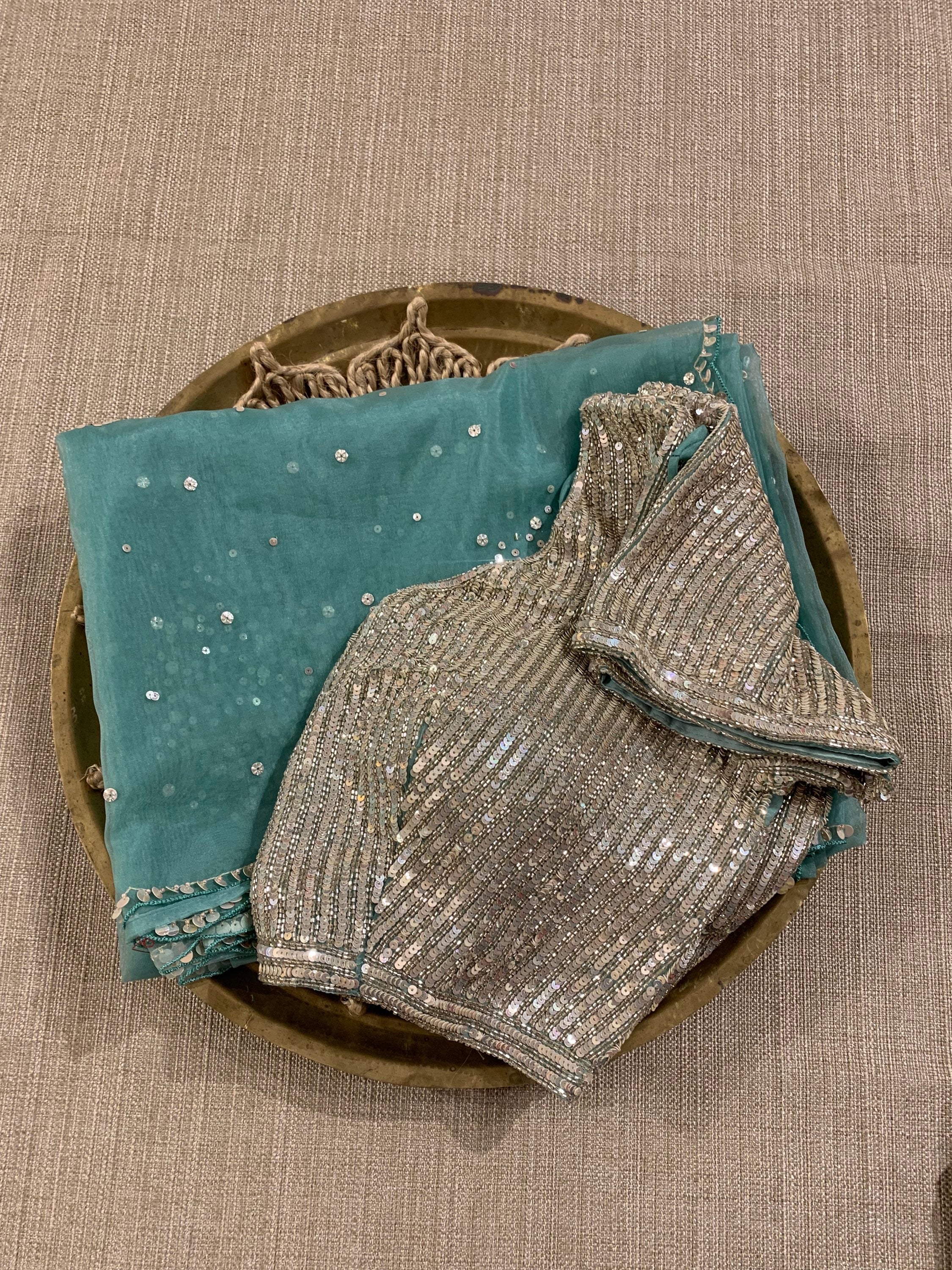 Sea Green Organza Saree with allober work and paired with heavy allover sequnce and cutdhana complete handwork blouse .