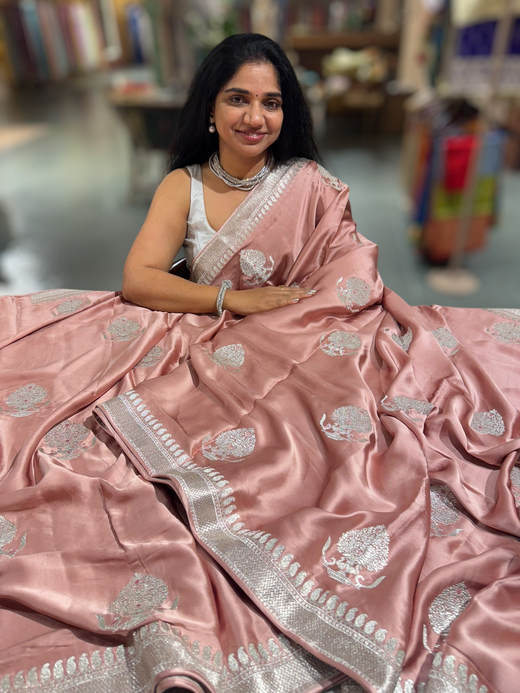 Pure Satin Saree with allover Embroidery Paired with pure Handloom Tissue Blouse with allover Paithani Inspired Embroidery with peacocks and lotus creepers