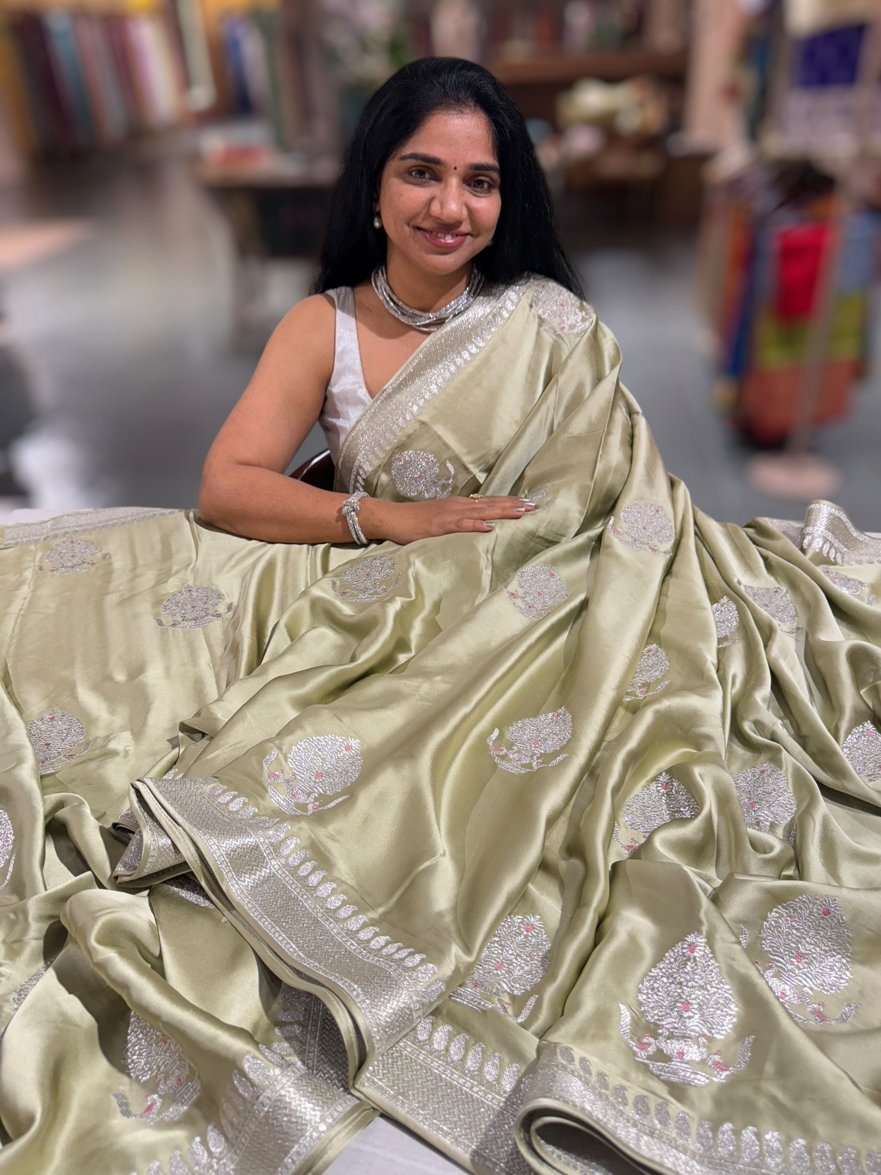 Light Pista Pure Satin Saree with Embroidery.