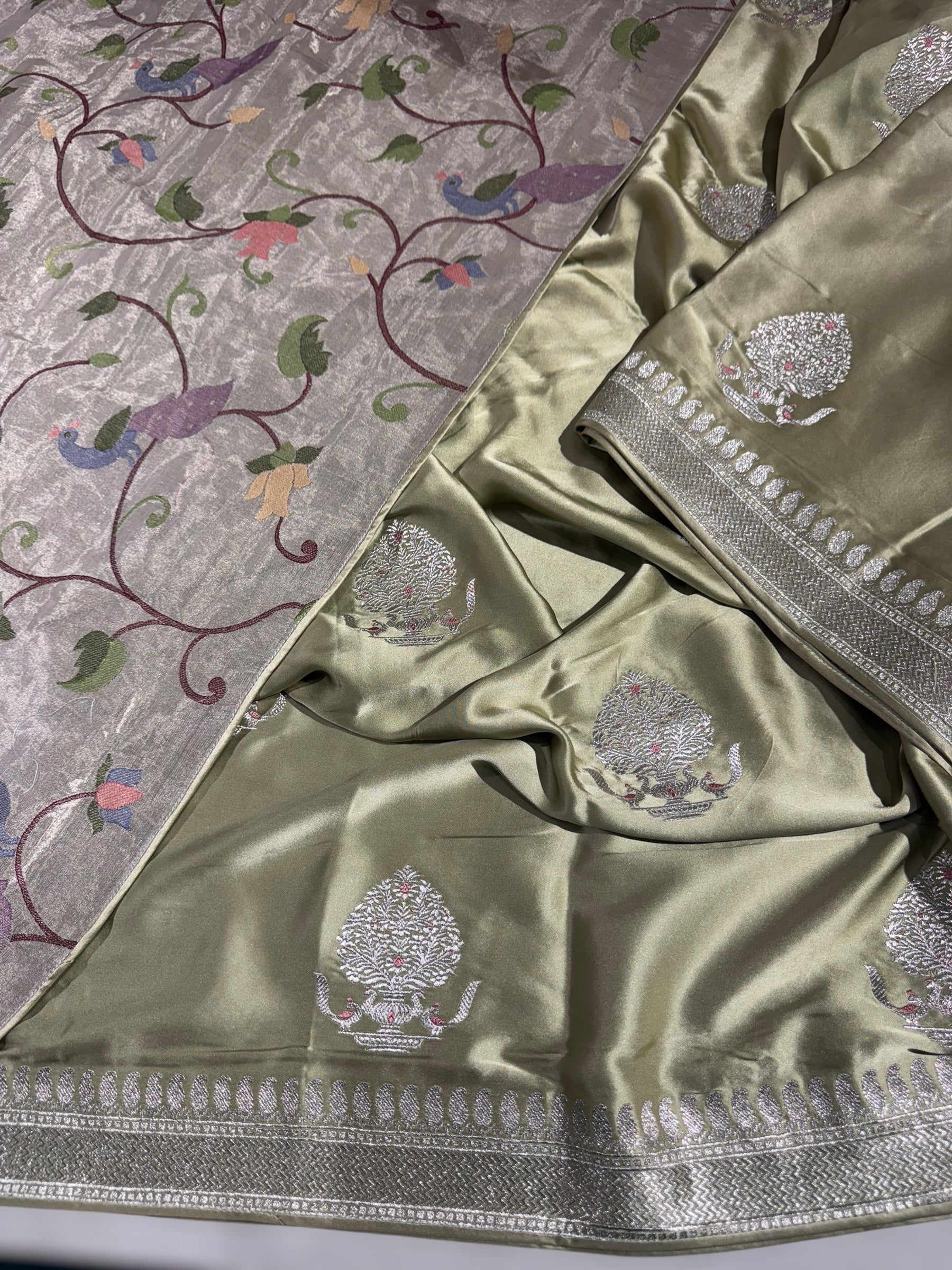 Pure Satin Saree with allover Embroidery Paired with pure Handloom Tissue Blouse with allover Paithani Inspired Embroidery with peacocks and lotus creepers