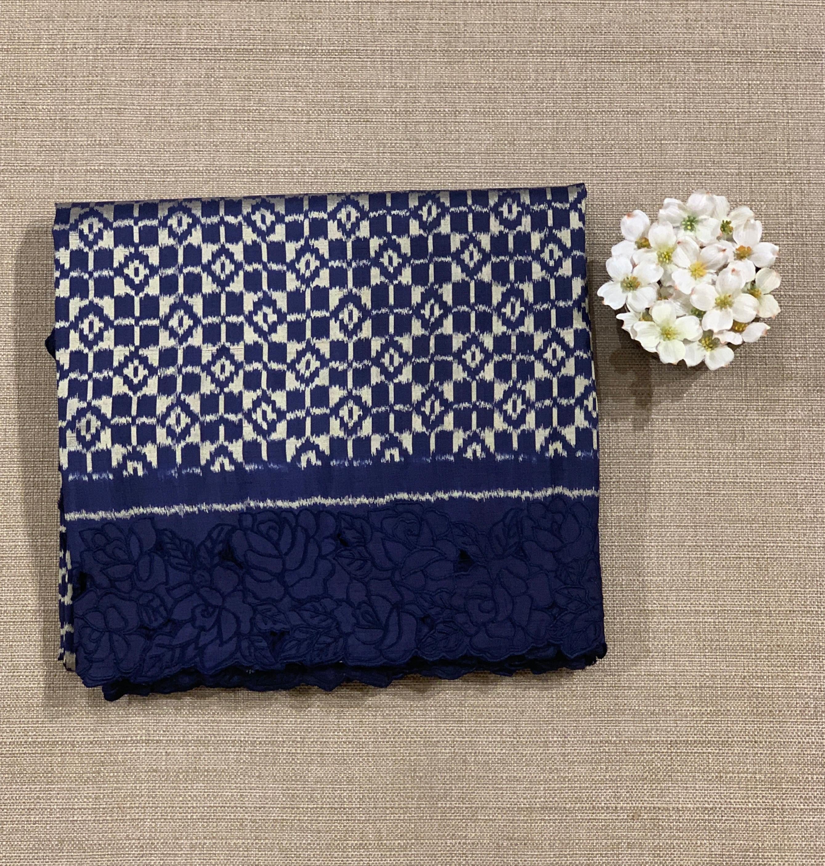 Cambodian–inspired pure handloom Ikkat Silk Saree featuring intricate rose embroidery and delicate cutwork border detailing