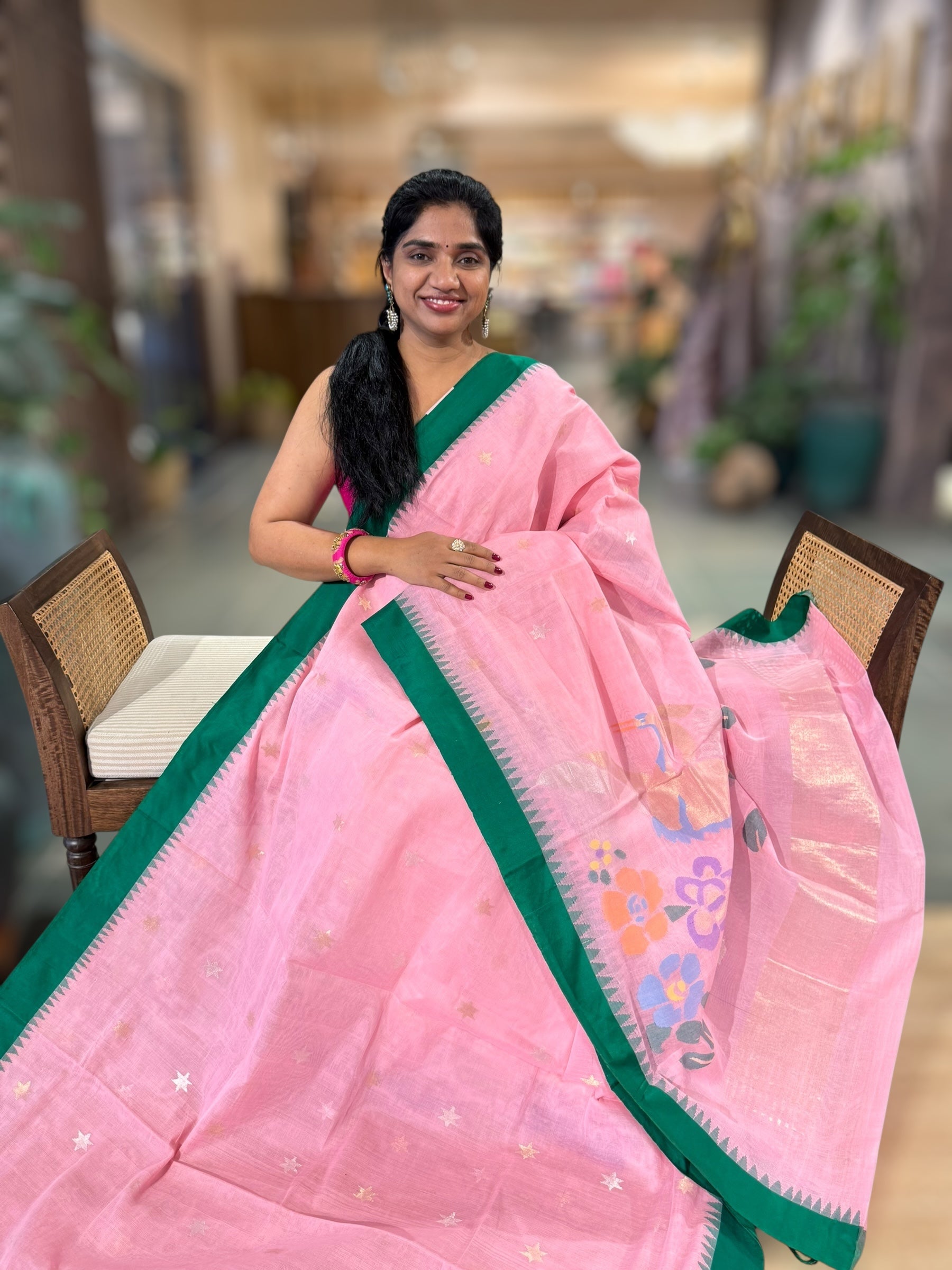 Crafted from pure handspun khadi cotton, the saree’s body is rendered in a soft and cheerful baby pink hue, offering a refreshing, graceful look. The rich emerald green silk border features intricate temple-style weaving with zari detailing — a striking contrast that elevates the drape for festive and elegant occasions.
