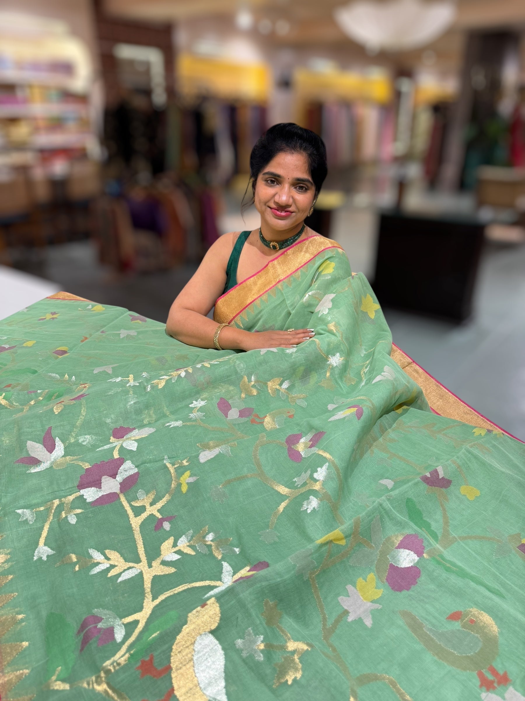 • Light Apple Green Ponduru Khadi Jamdani Allover Meenkari Weaving Saree