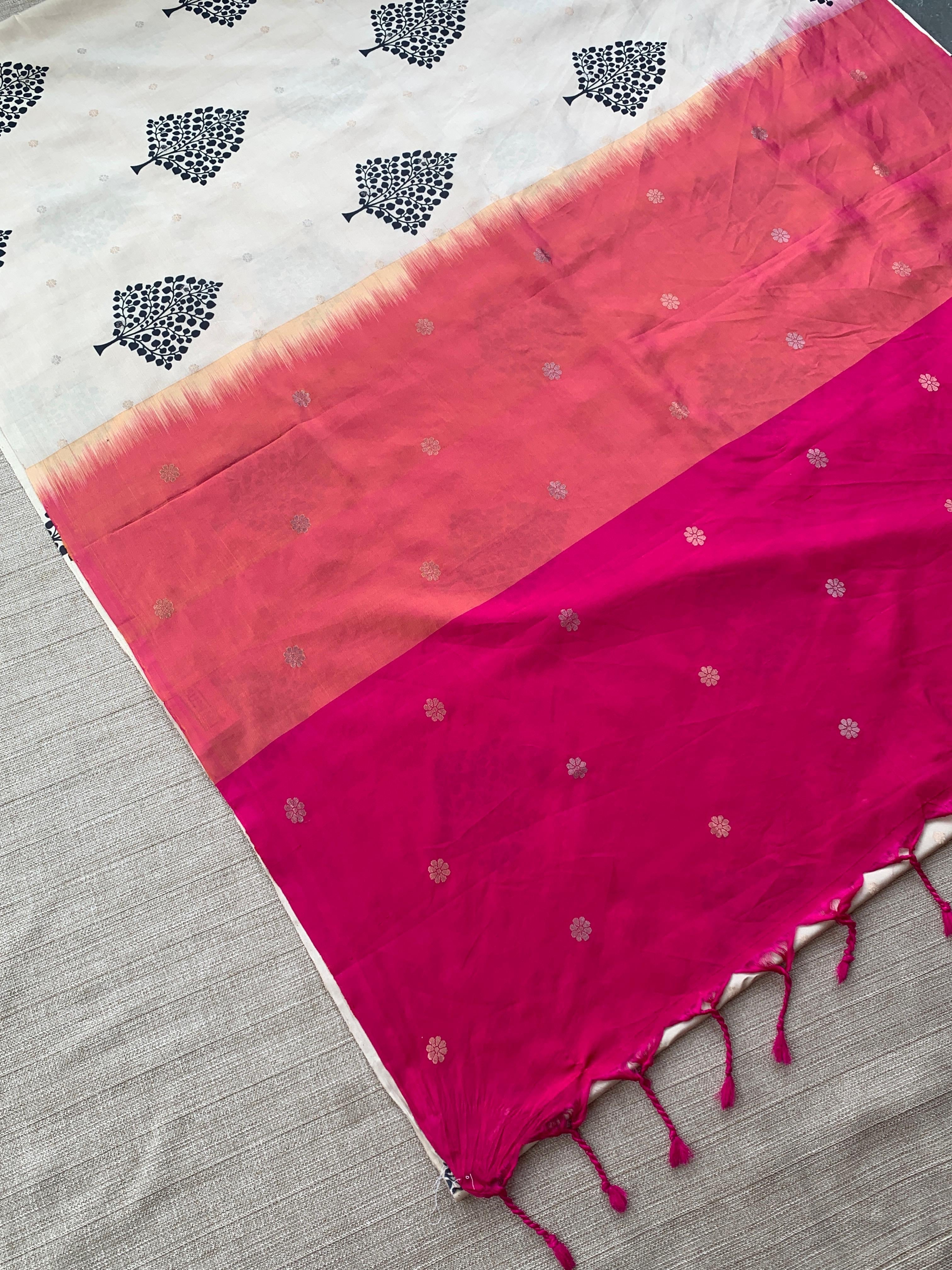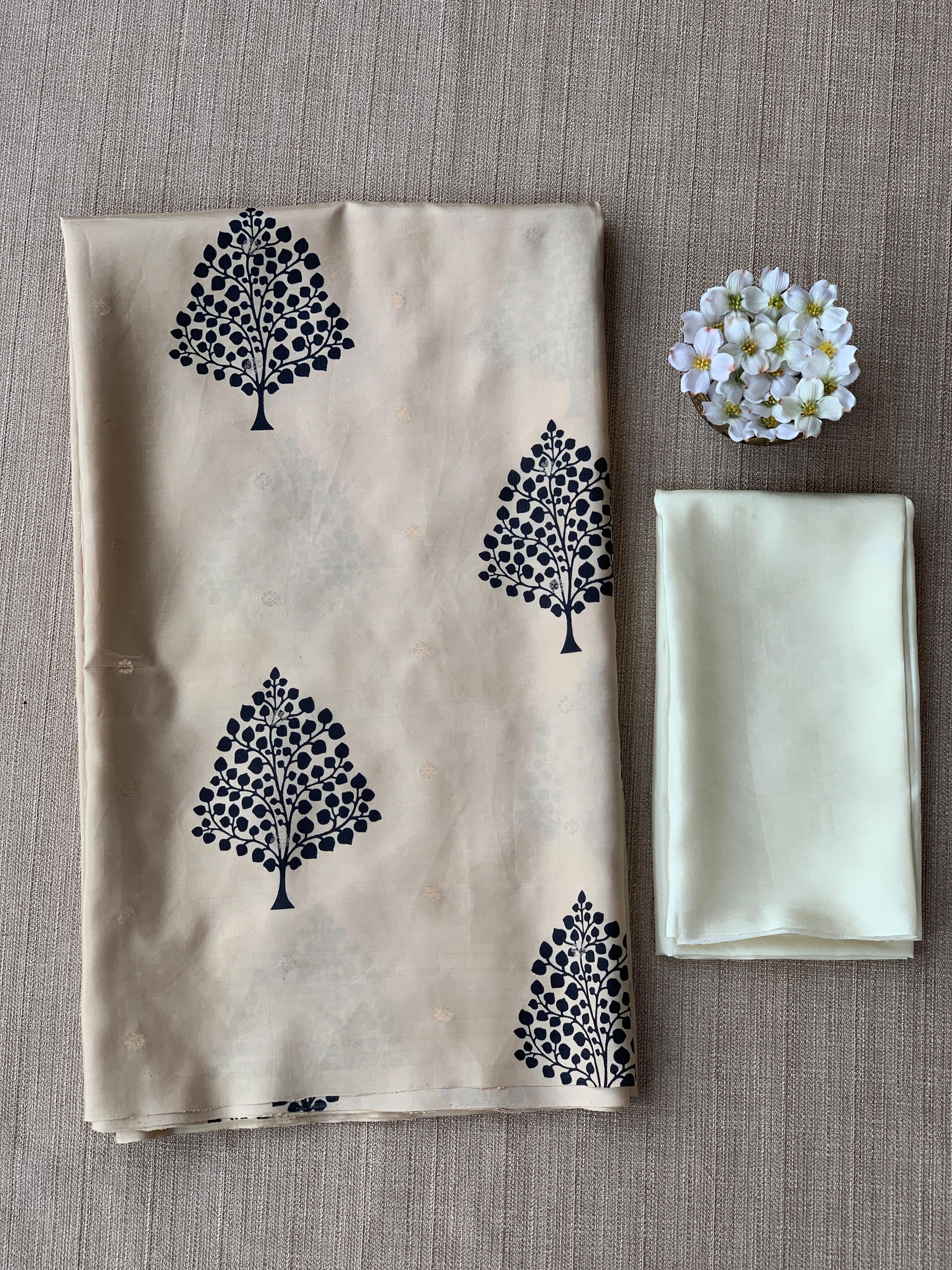 • Beige Border less Designer printed kanchi silk saree with double color pallu