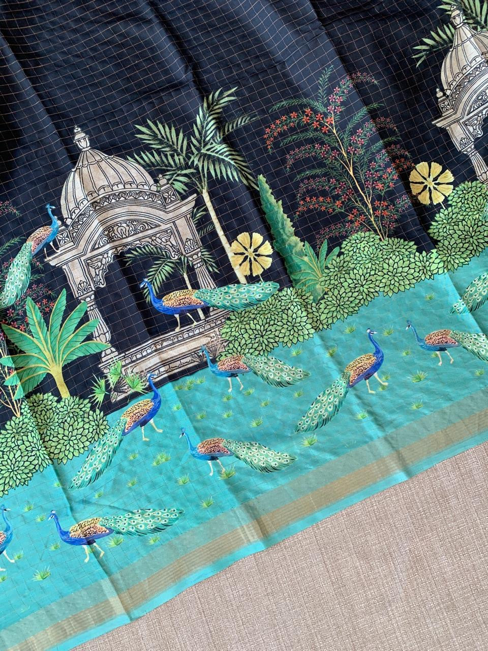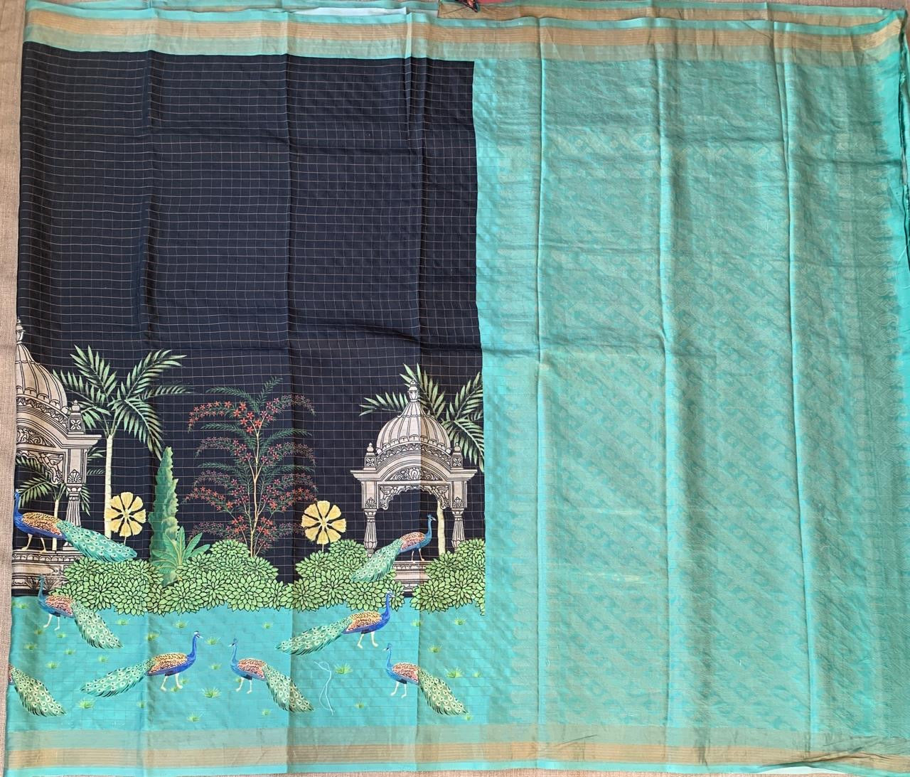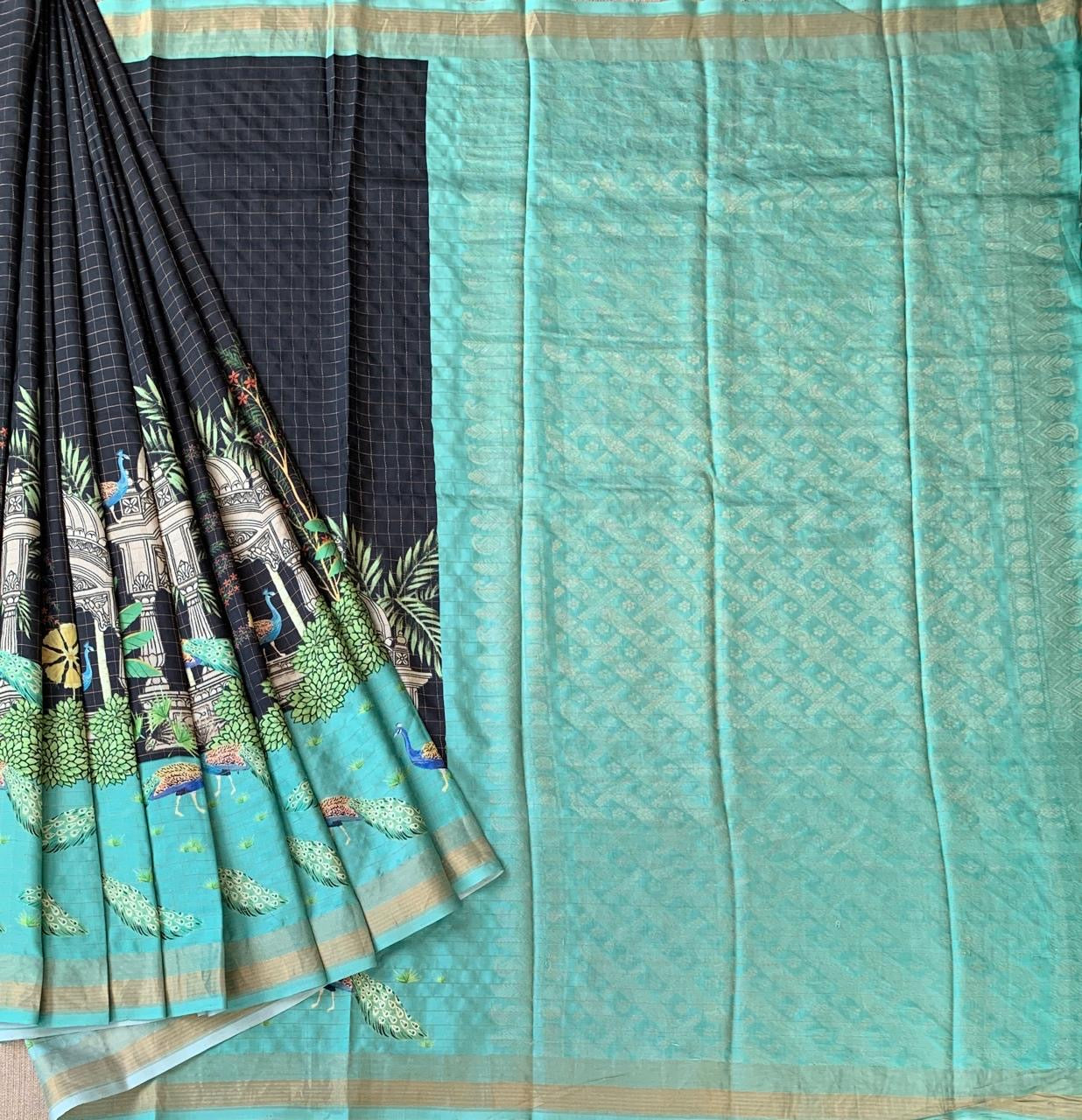 • Black Checks Soft Silk with beautiful Skirt Border Peacock Print