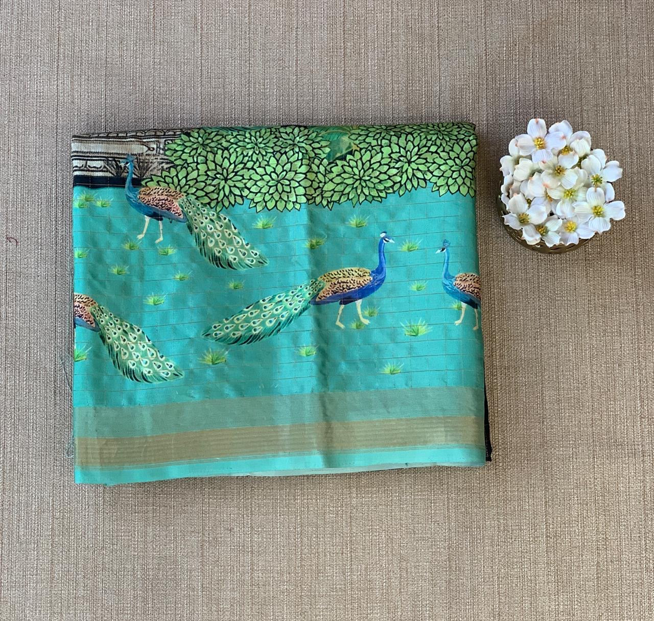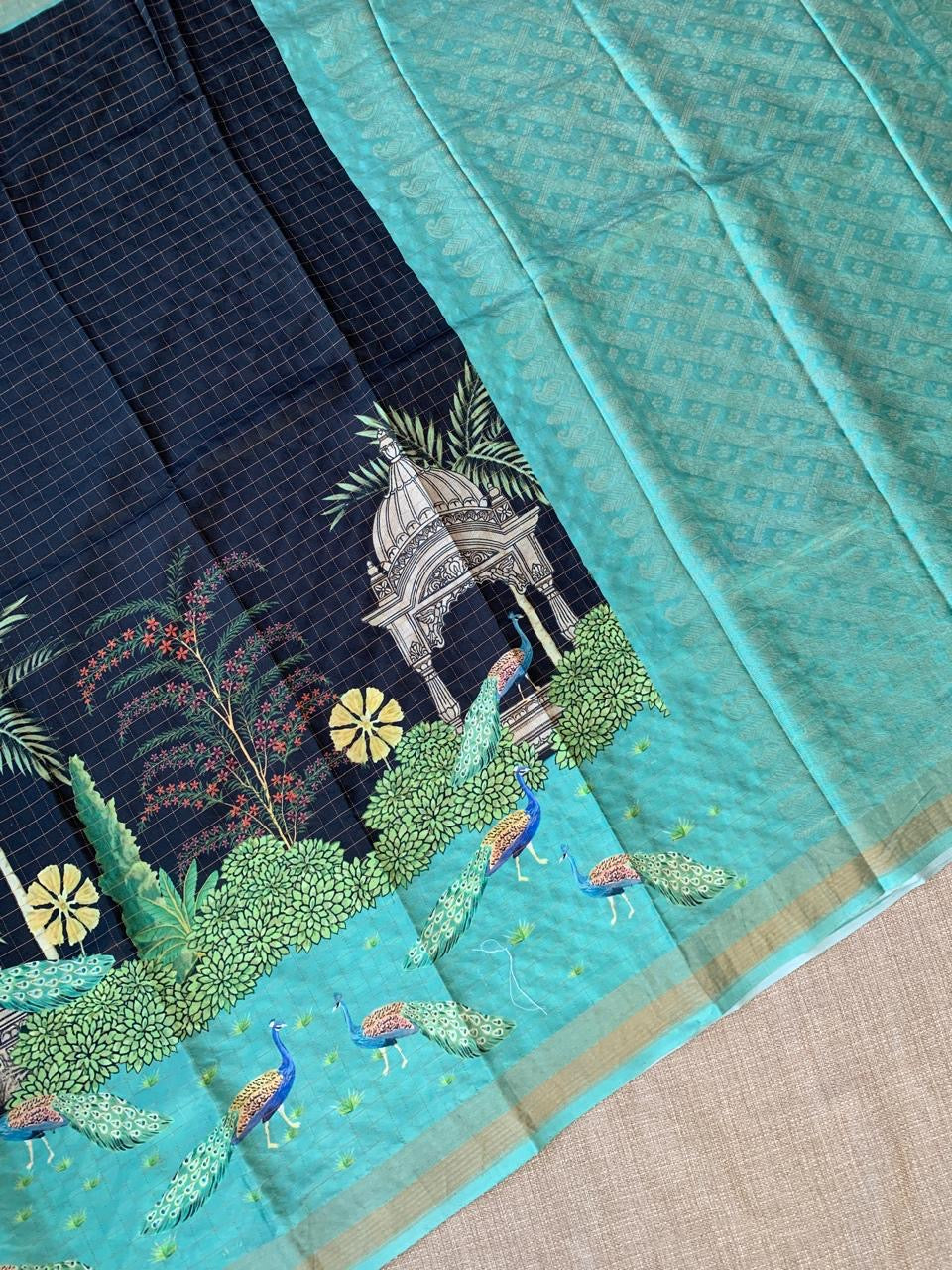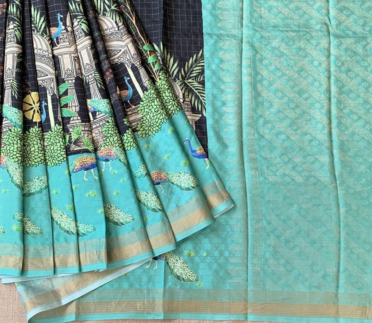 • Black Checks Soft Silk with beautiful Skirt Border Peacock Print