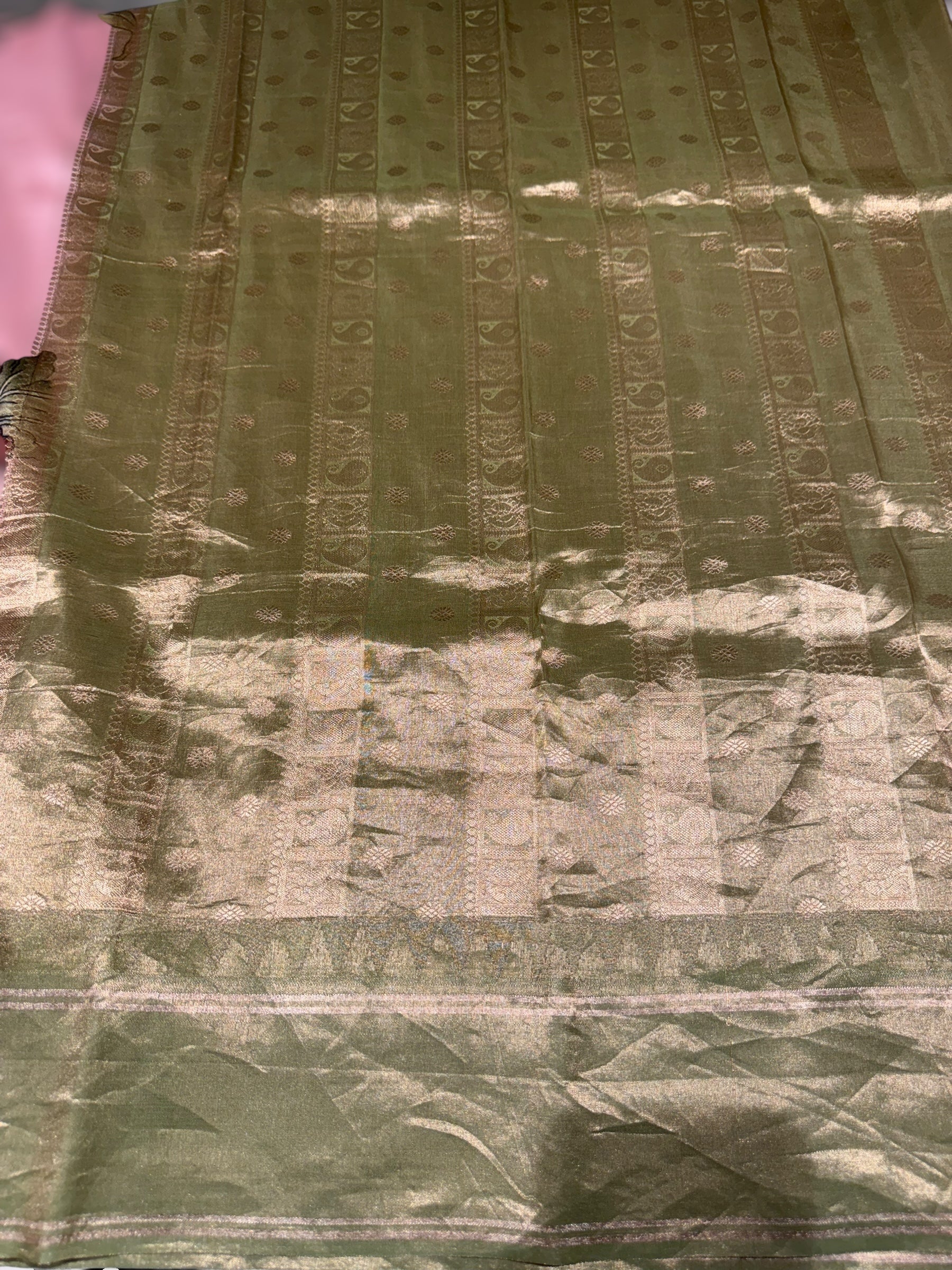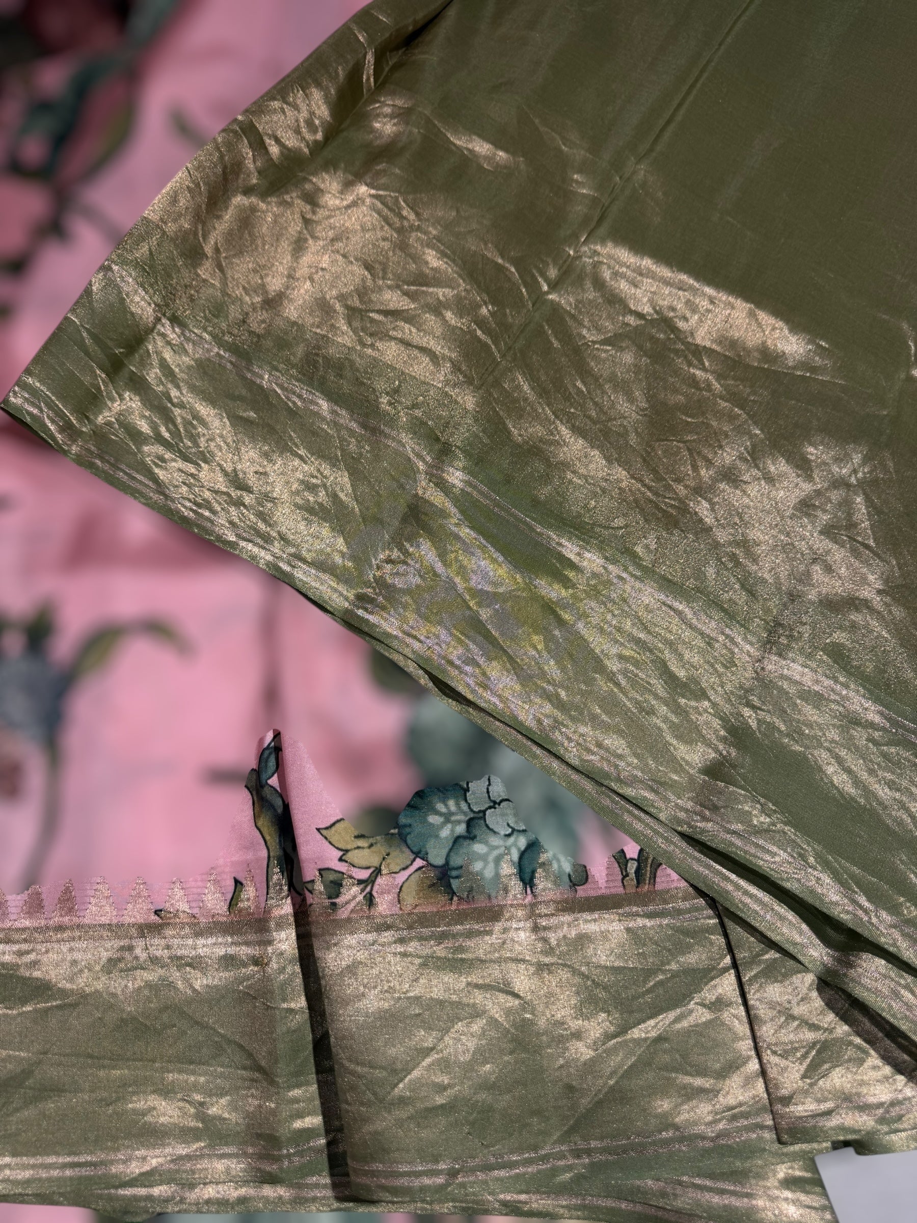 Baby Pink Kanjeevaram designer-printed saree featuring intricate floral creepers and contrast olive tissue borders with silver zari stripes, creating an elegant gap-border look. The pallu is in olive color in rich Tissue and vintage-inspired , adorned with peacock and mango motif stripes with rudraksh detailing in between.