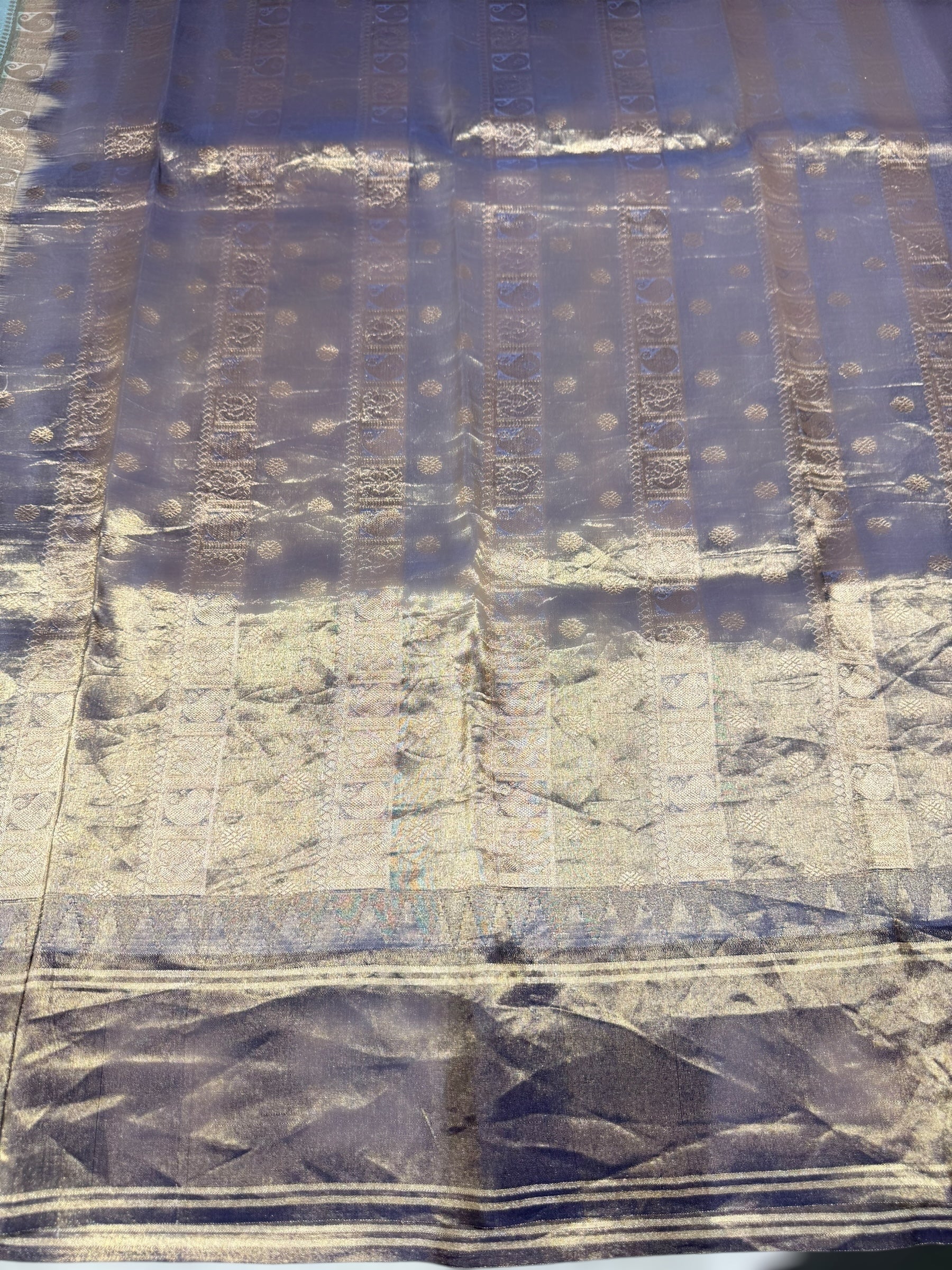 Baby Blue Kanjeevaram designer-printed saree featuring intricate floral creepers and contrast violet tissue borders with silver zari stripes, creating an elegant gap-border look. The pallu is in violet tissue color in rich vintage-inspired , adorned with peacock and mango motif stripes with rudraksh detailing in between.