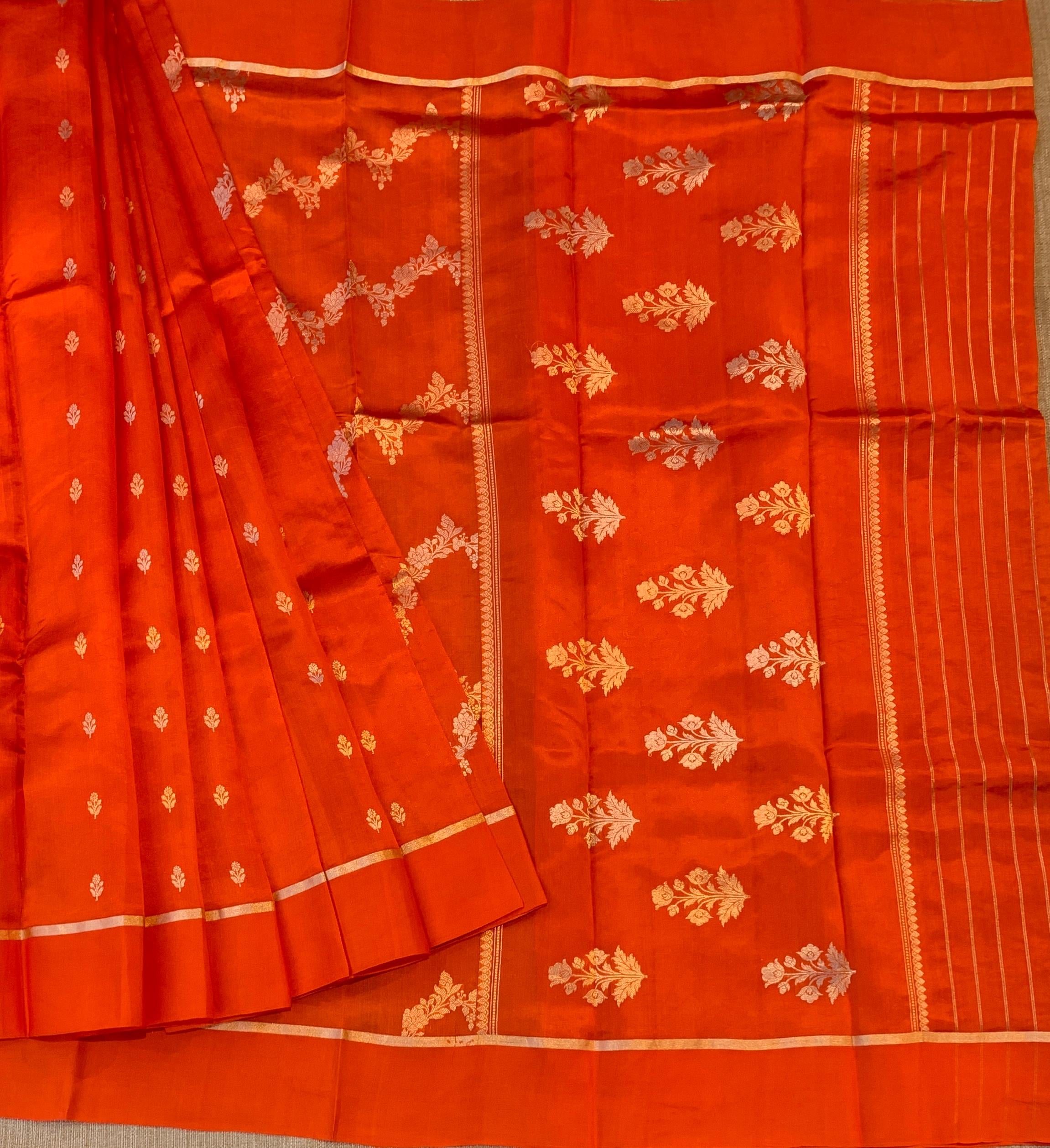 Pleats and blouse has kaduwa weaving  butis allover the saree