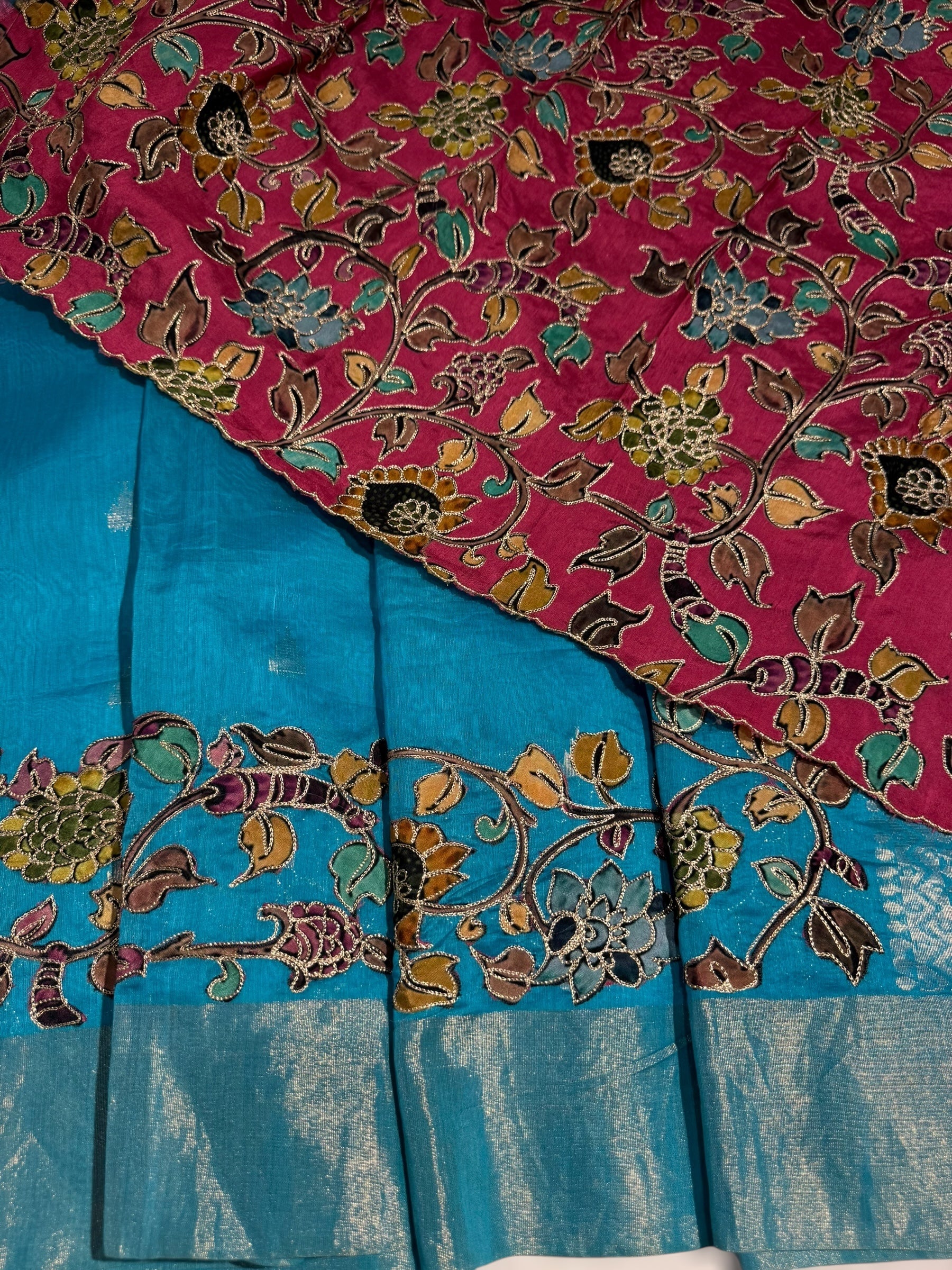 Copper sulphate chanderi silk saree with kalamkari applique border paired with contrast pink allover kalamkari applique work blouse