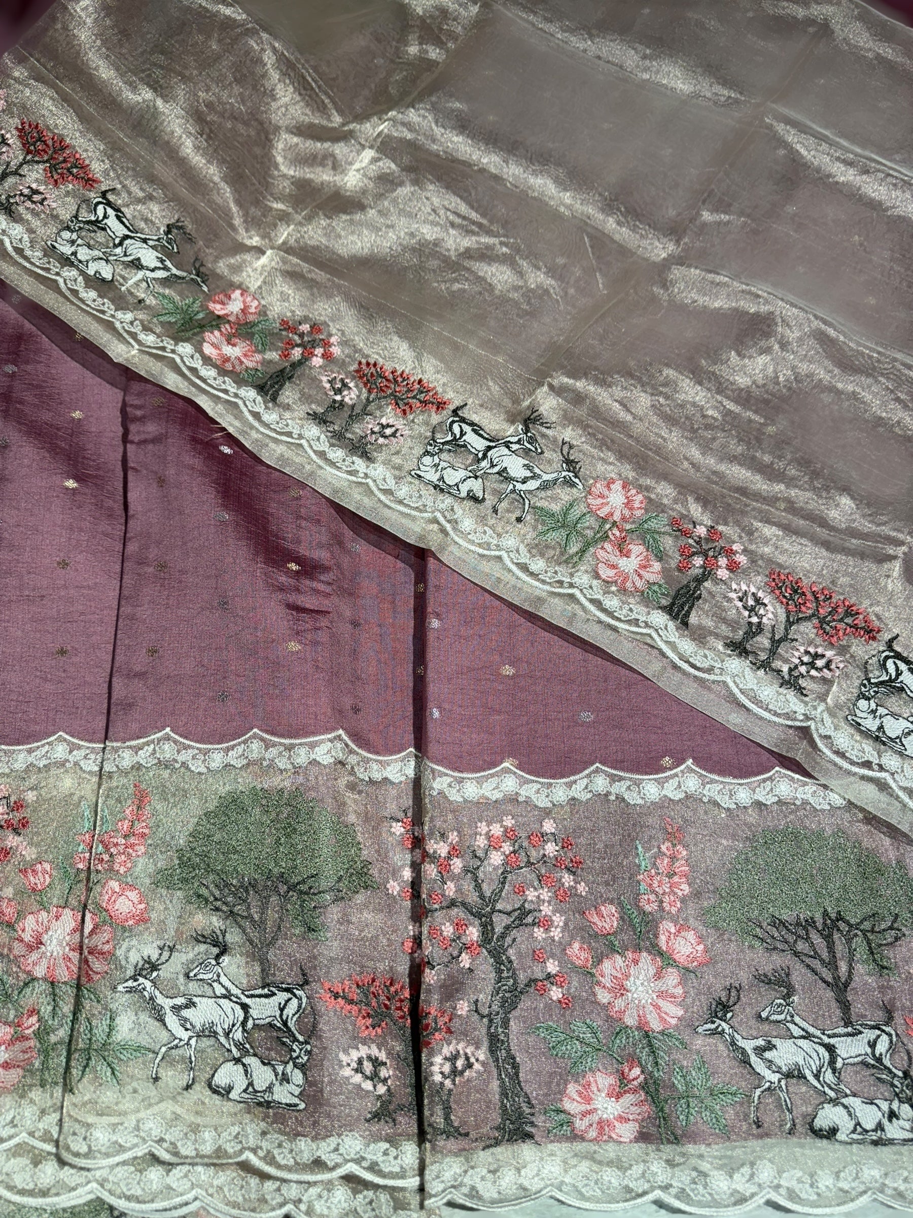 Dusty Pink Designer chiniya silk saree with allover small zari dot weaving hemlined with white organza embroidered border with trees and deers paired with pure tissue embroidered blouse